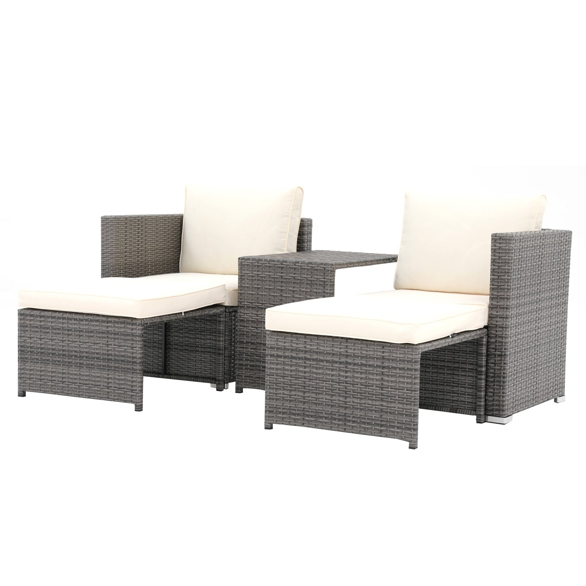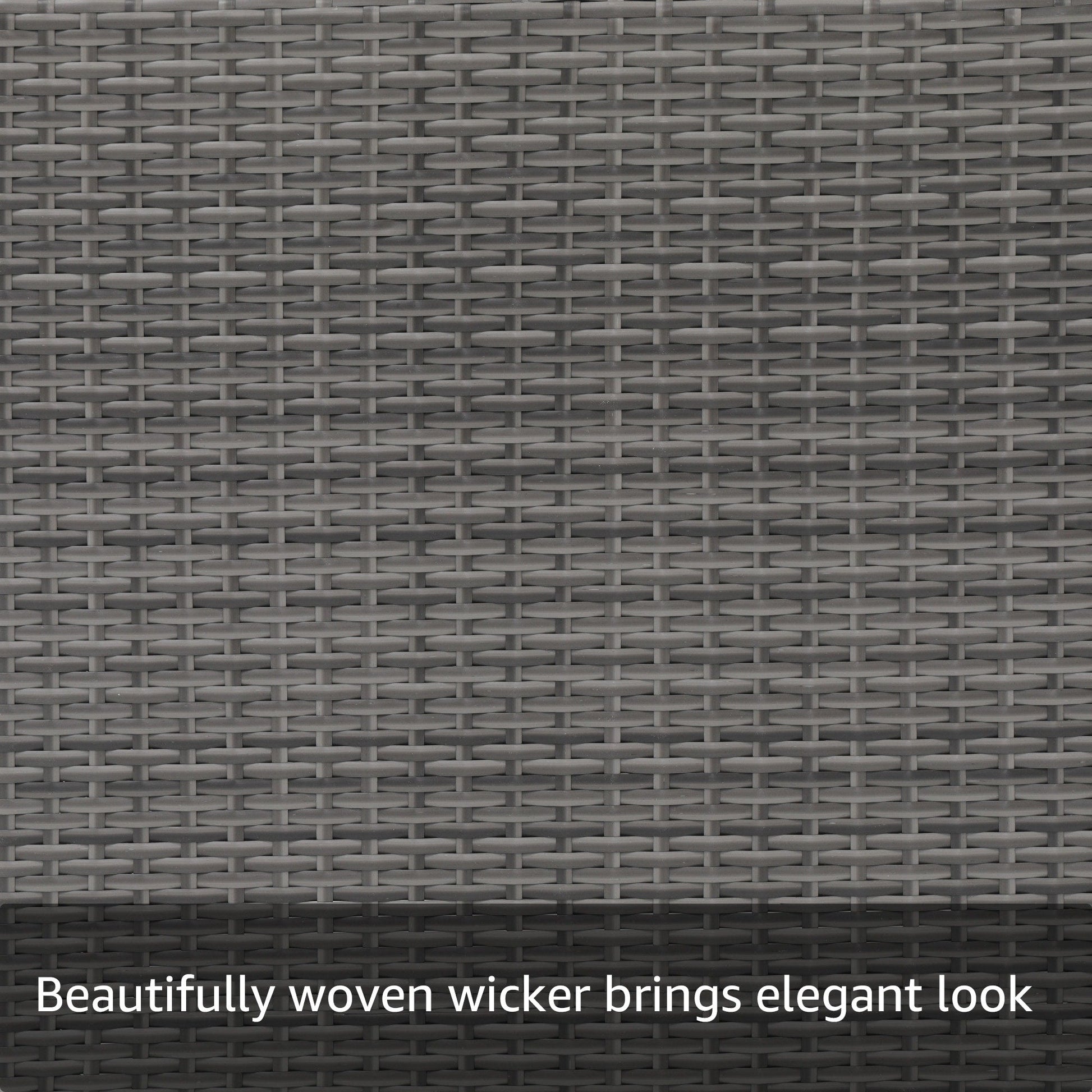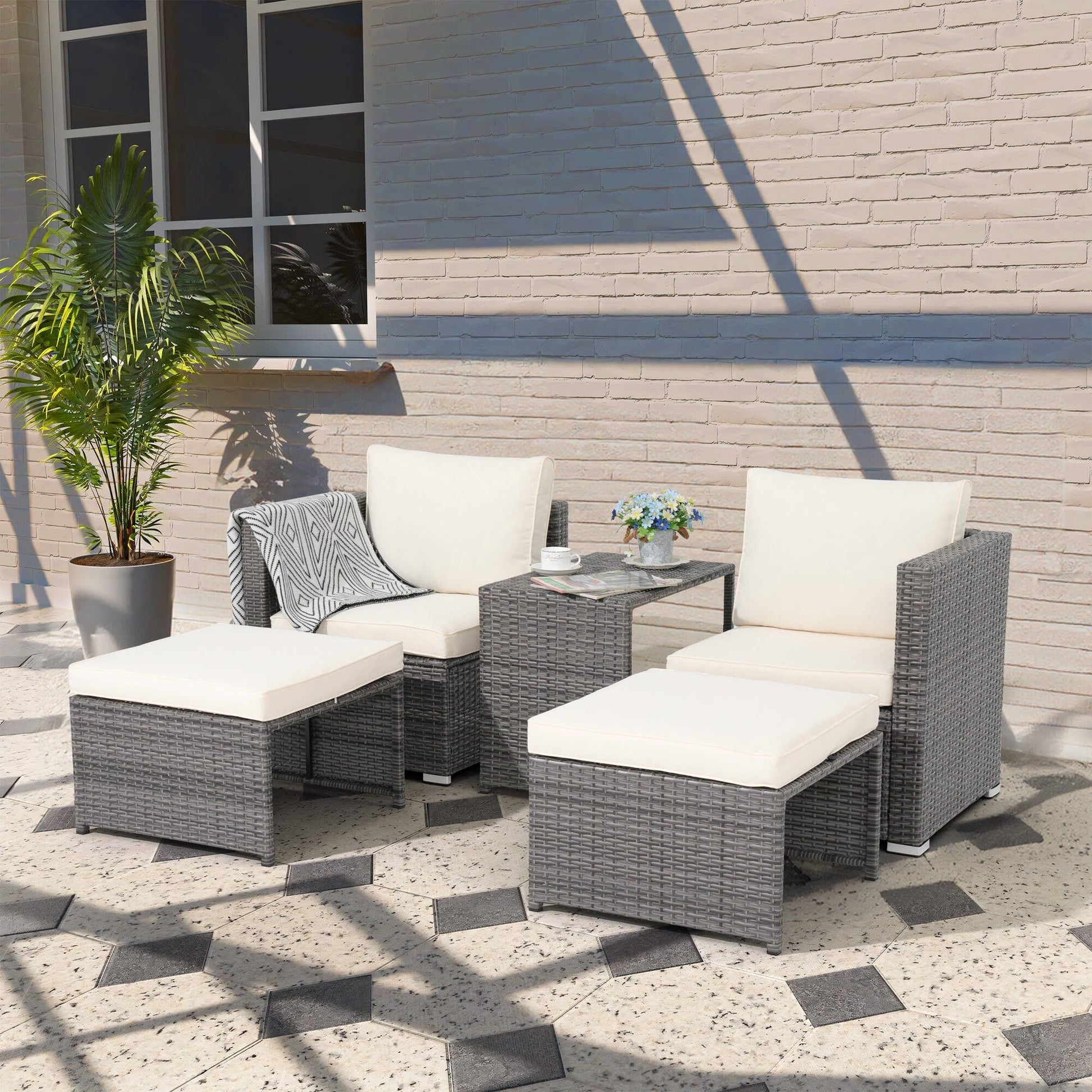 Rilassatevi, mettete i piedi in alto e godetevi la brezza calda in tutta tranquillità con questo set di 5 sedie in vimini da esterno. Progettato per il massimo comfort e relax, questo set include 2 sedie, 2 pouf e 1 tavolino, perfetti per rilassarsi con le persone a voi più care. Realizzato in resistente vimini PE e struttura in acciaio antiruggine, il nostro set di sedie in vimini resiste a diverse condizioni climatiche e garantisce un utilizzo all'aperto senza preoccupazioni. La struttura in vimini grigio chiaro abbinata ai comodi cuscini beige aggiunge un tocco di raffinatezza alla vostra oasi all'aperto. Preparatevi a godervi il sole con stile su questo set di sedie in vimini!