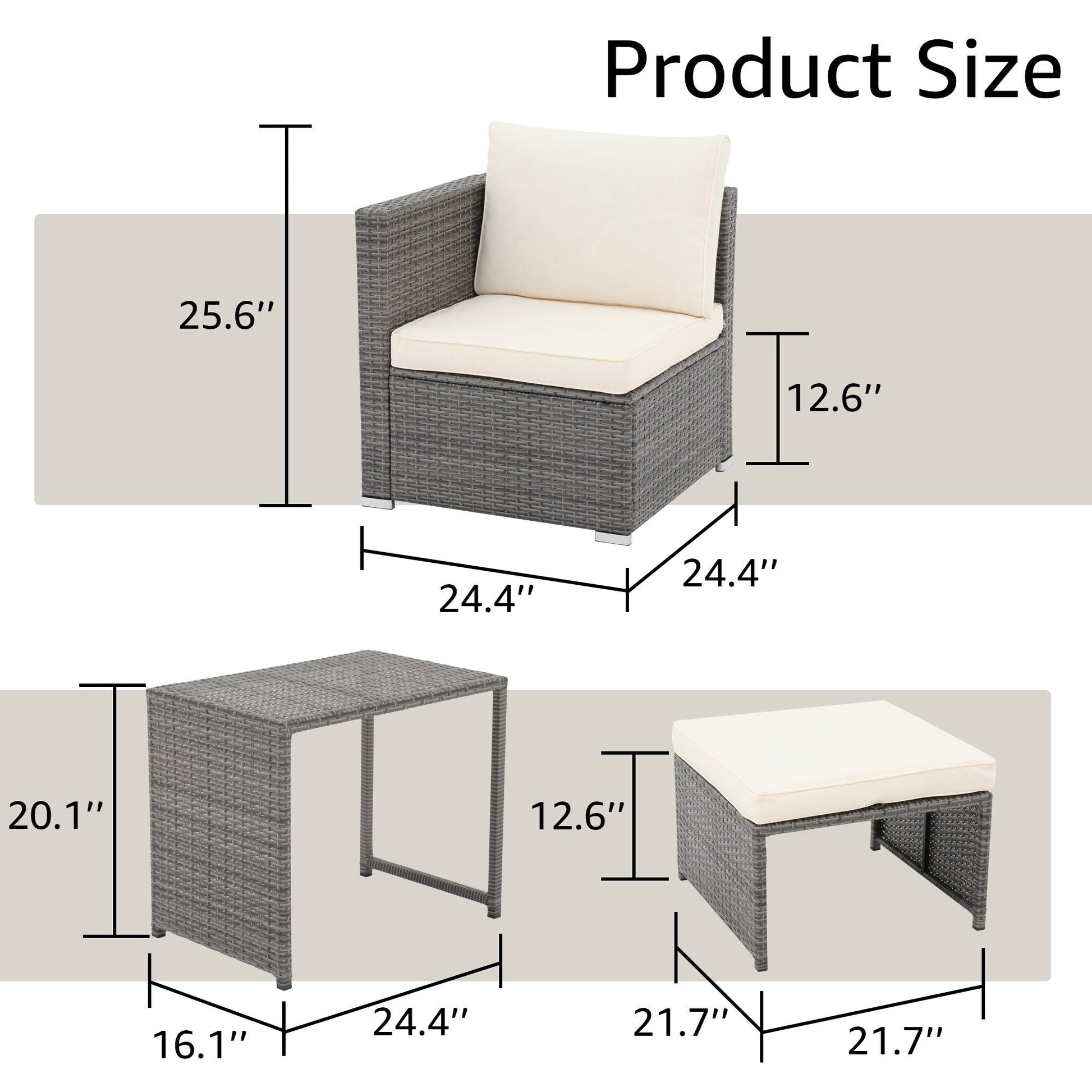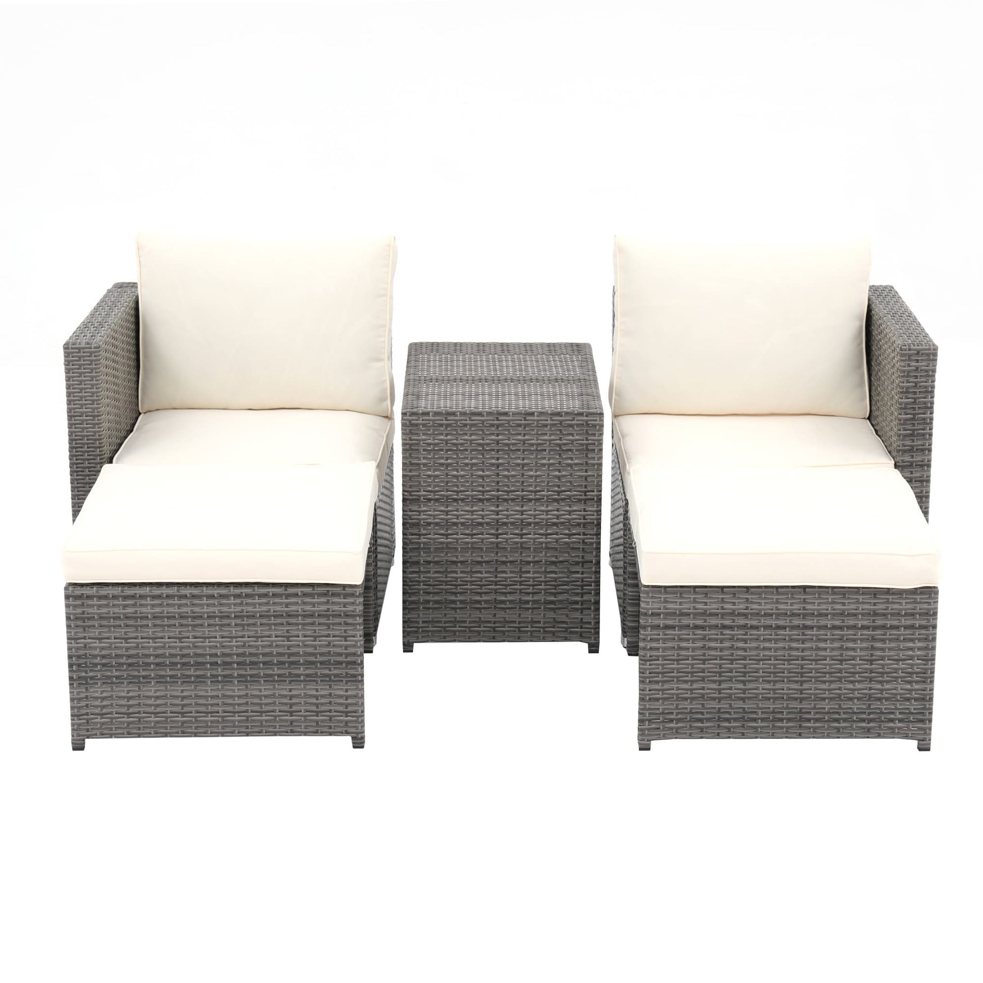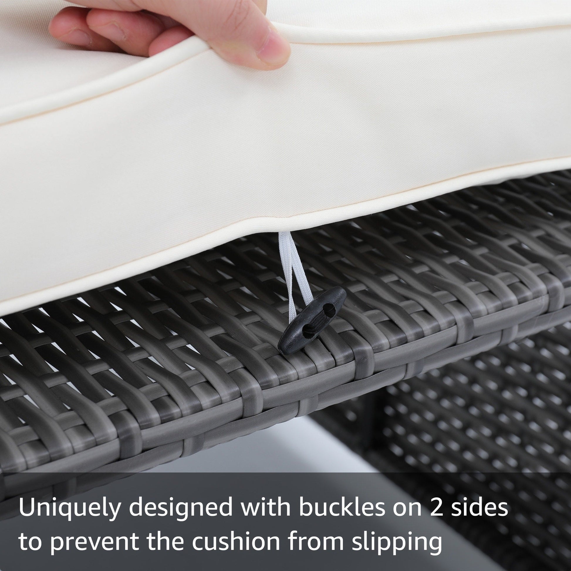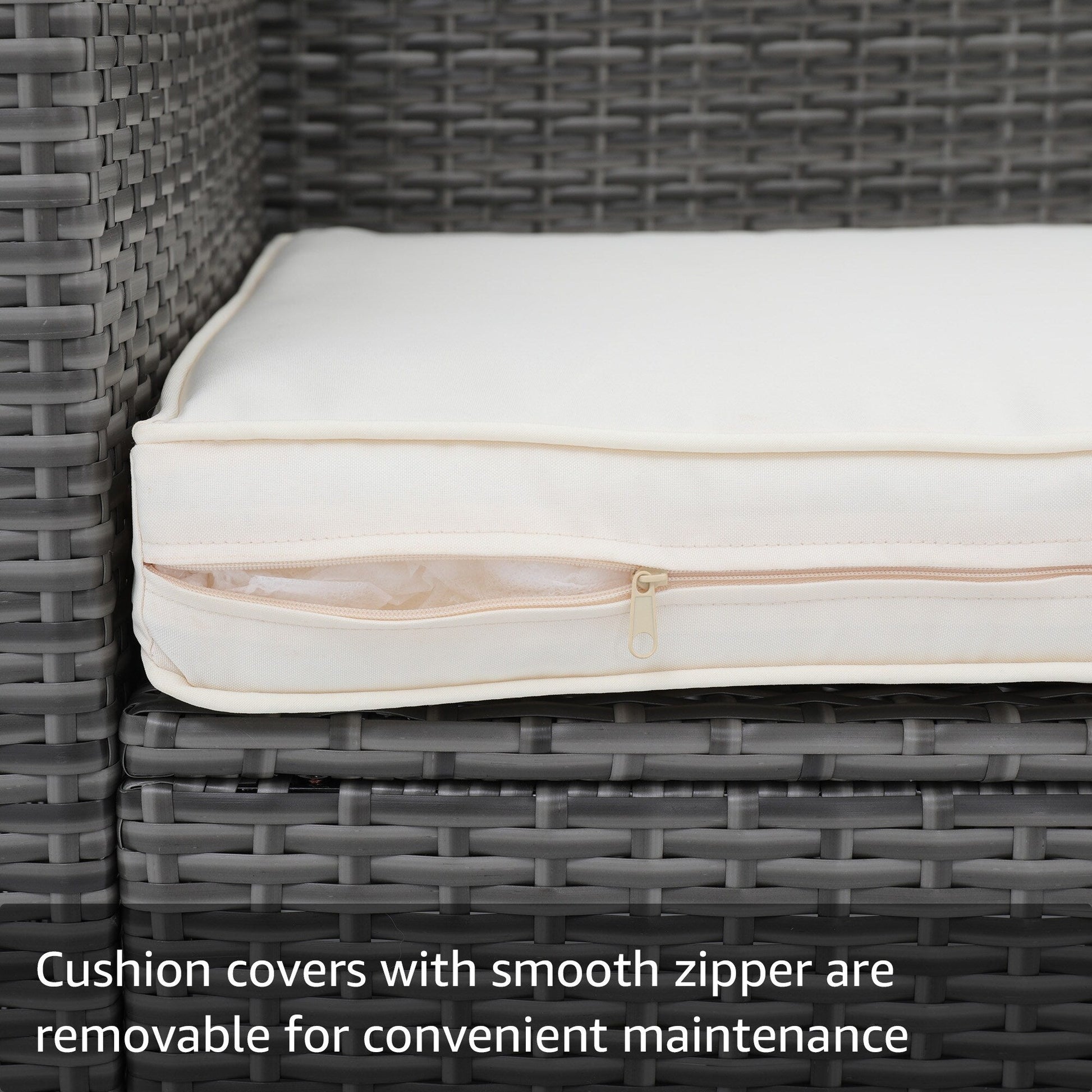 Rilassatevi, mettete i piedi in alto e godetevi la brezza calda in tutta tranquillità con questo set di 5 sedie in vimini da esterno. Progettato per il massimo comfort e relax, questo set include 2 sedie, 2 pouf e 1 tavolino, perfetti per rilassarsi con le persone a voi più care. Realizzato in resistente vimini PE e struttura in acciaio antiruggine, il nostro set di sedie in vimini resiste a diverse condizioni climatiche e garantisce un utilizzo all'aperto senza preoccupazioni. La struttura in vimini grigio chiaro abbinata ai comodi cuscini beige aggiunge un tocco di raffinatezza alla vostra oasi all'aperto. Preparatevi a godervi il sole con stile su questo set di sedie in vimini!