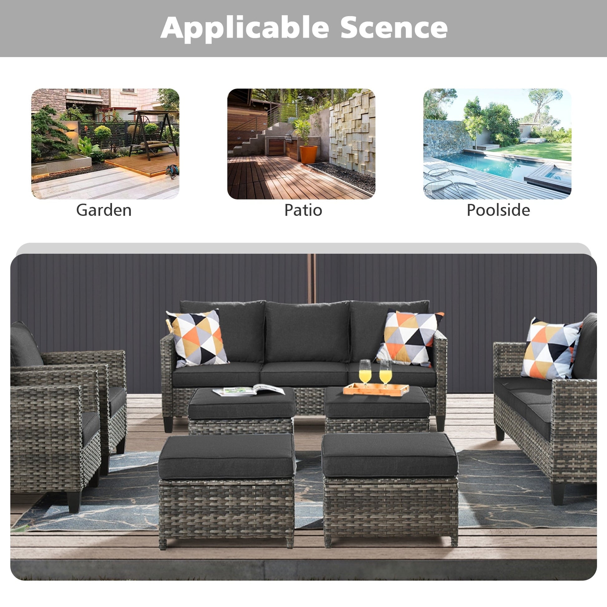 Ideale per qualsiasi ambiente esterno: perfetto per ampi patii, terrazze o giardini, questo set di mobili in vimini da 8 pezzi aggiunge stile e raffinatezza ai tuoi spazi esterni. Crea l'ambiente perfetto per rilassarti o intrattenere gli ospiti con questo set bello e funzionale.