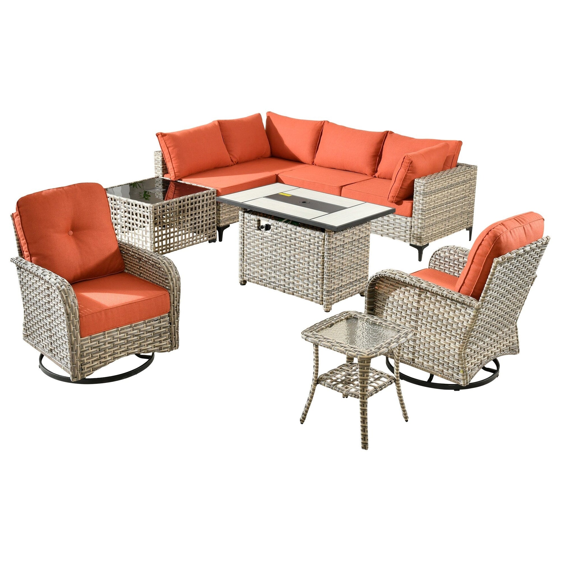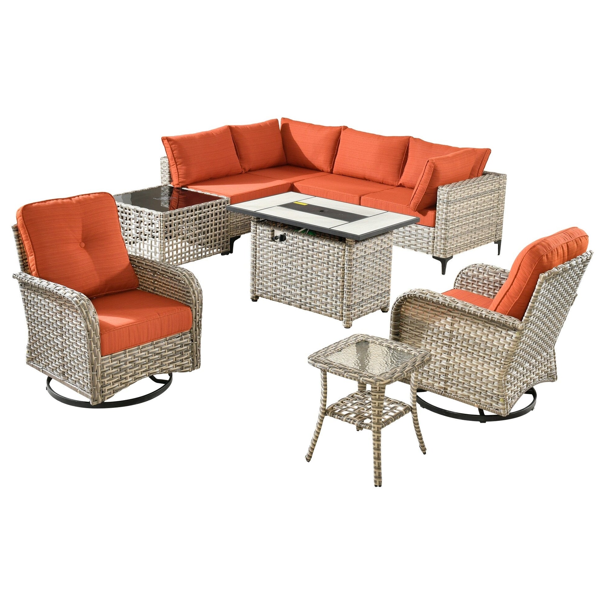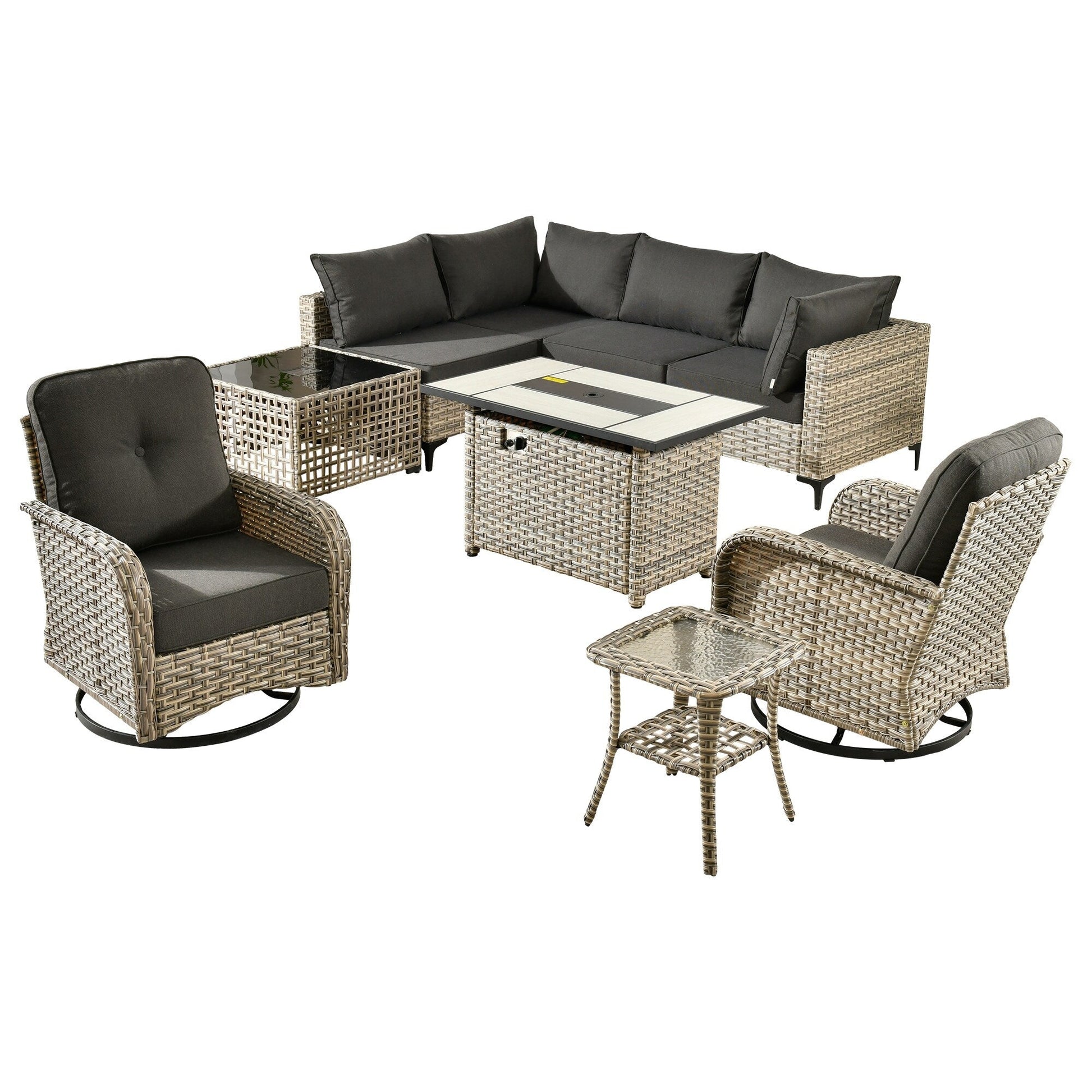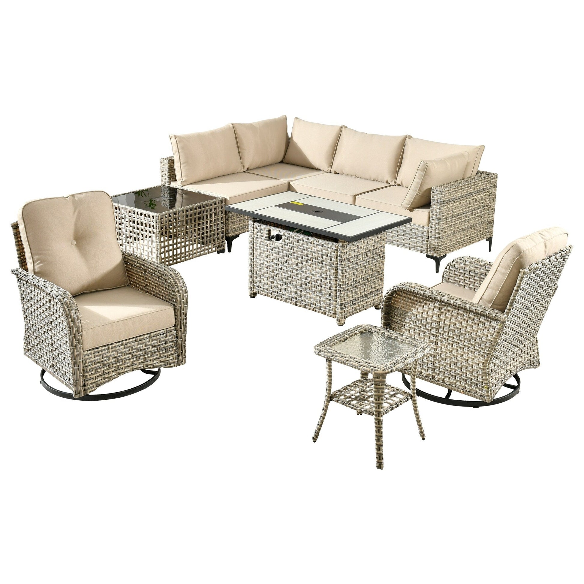 Set di 9 sedie girevoli in vimini per esterni OVIOS con tavolo da fuoco