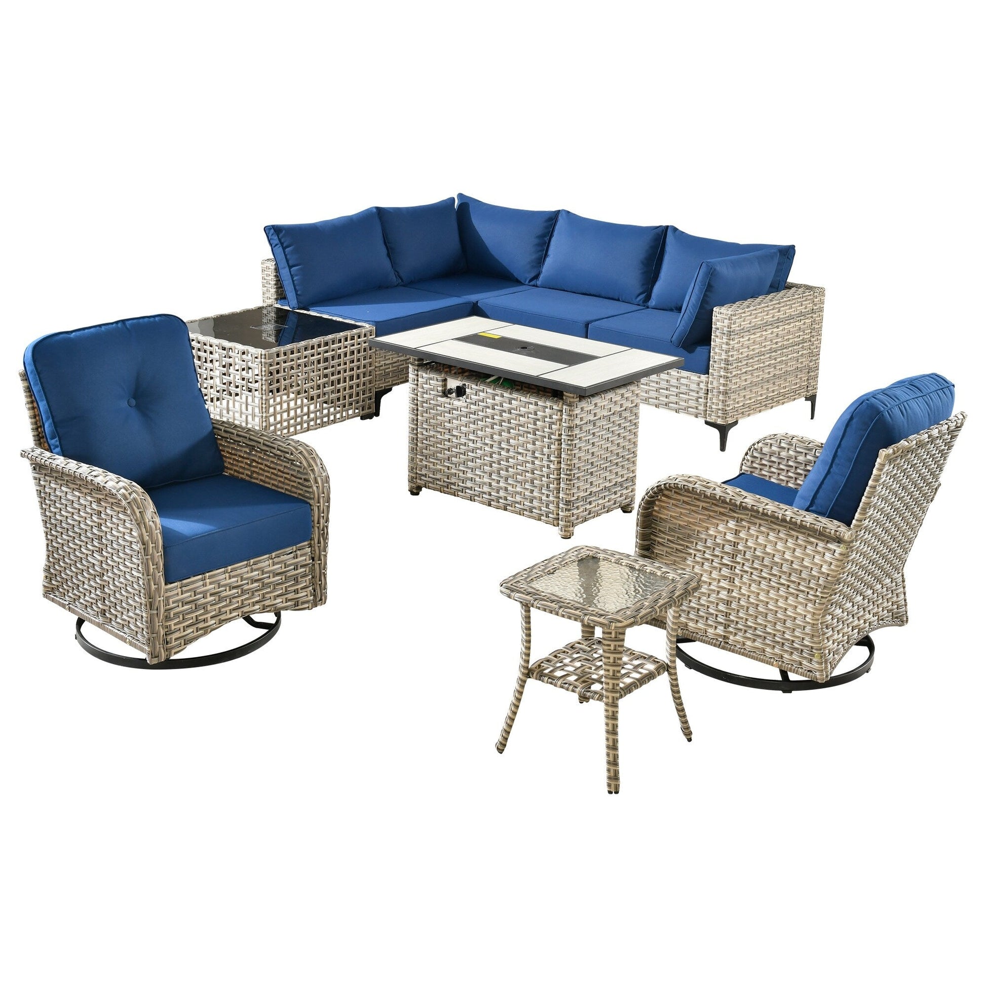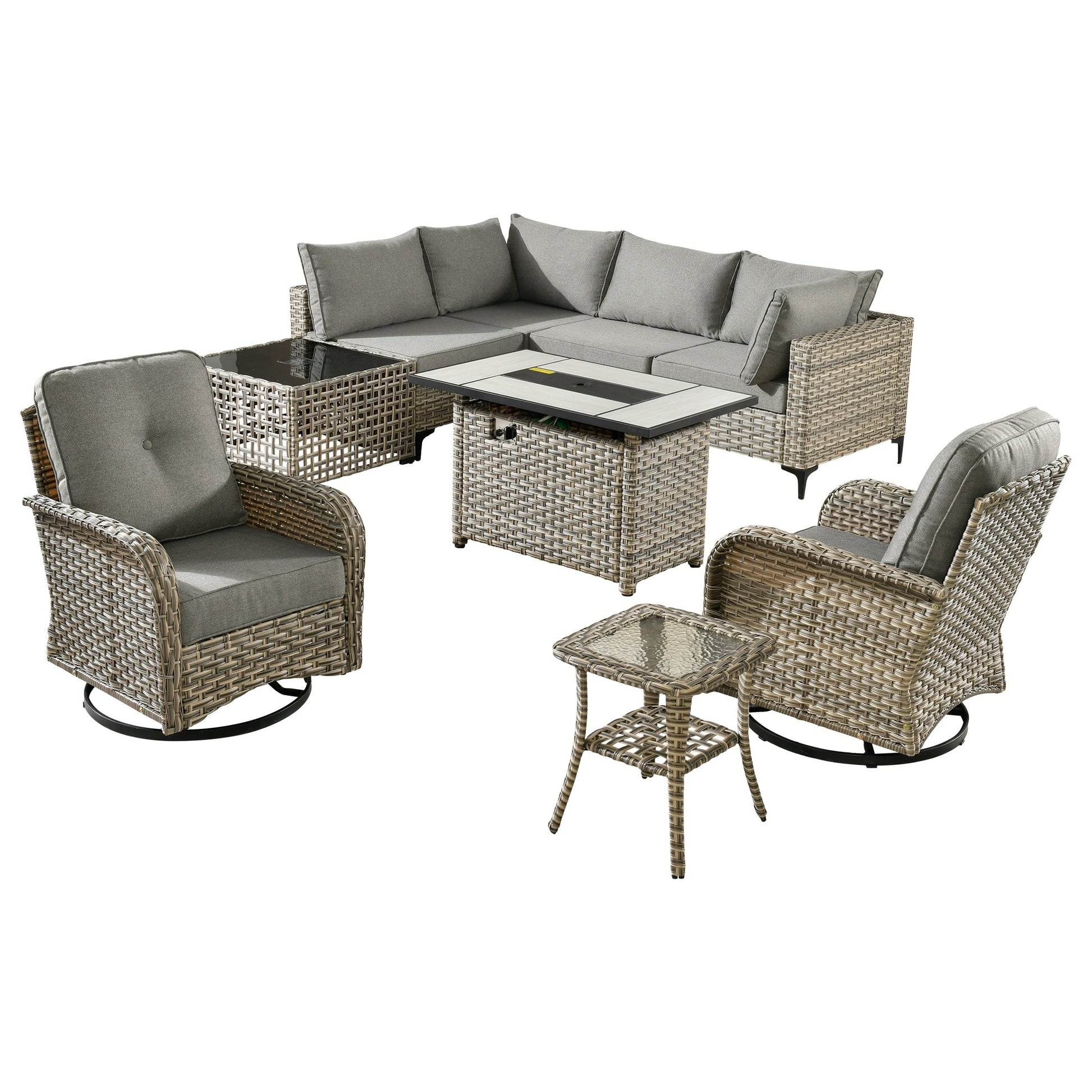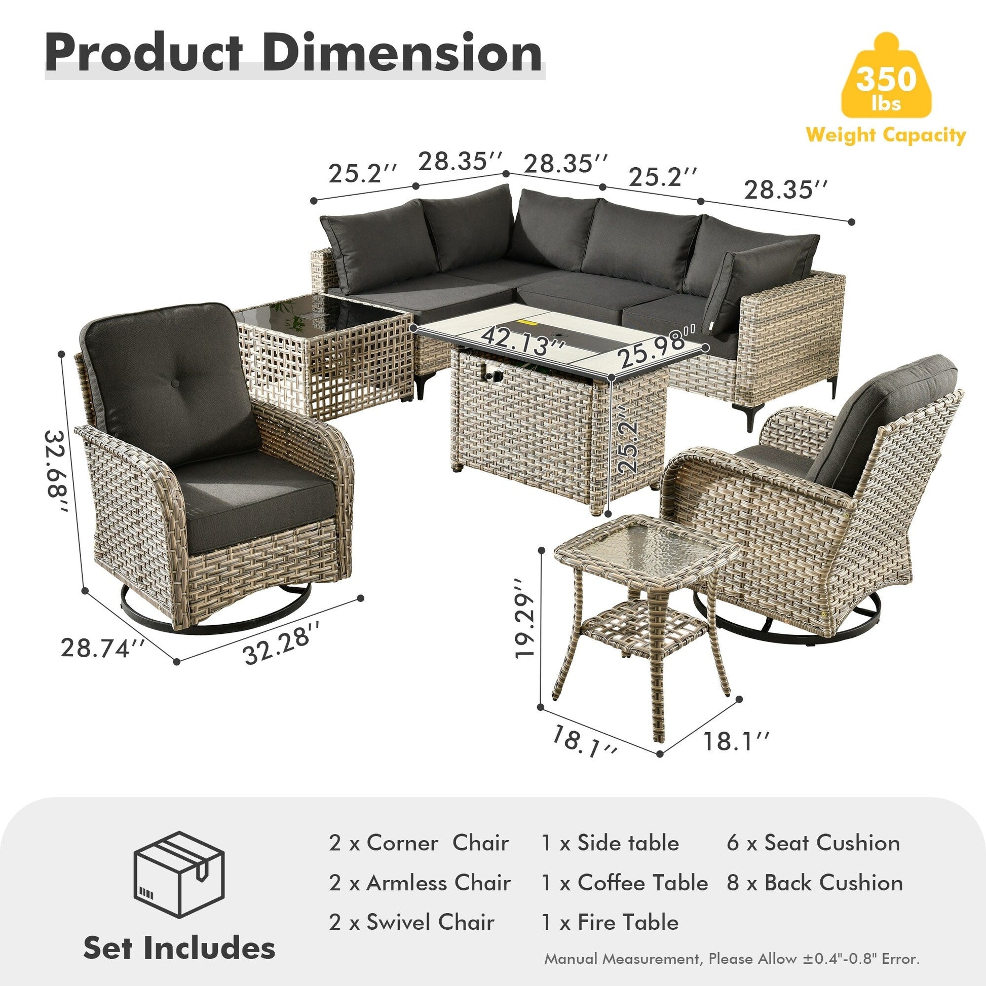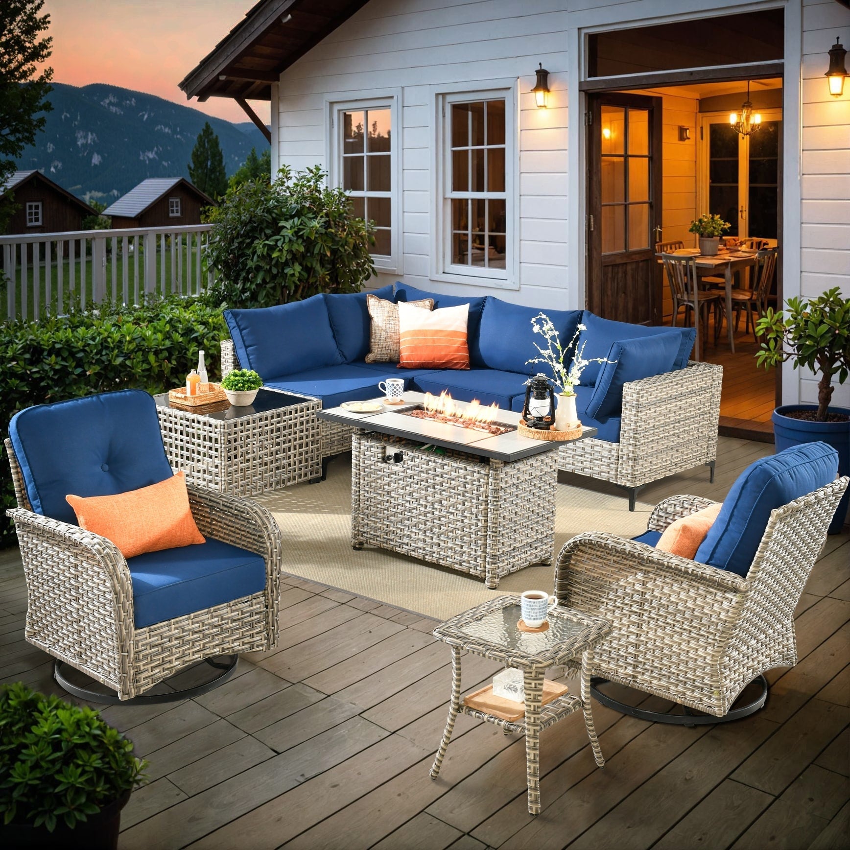 Set di 9 sedie girevoli in vimini per esterni OVIOS con tavolo da fuoco