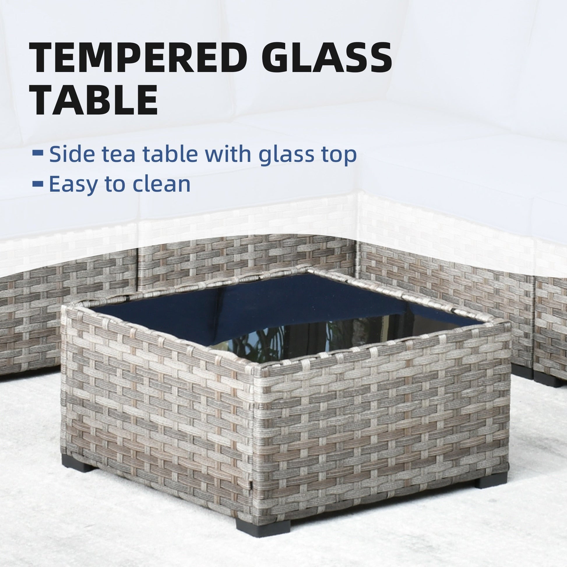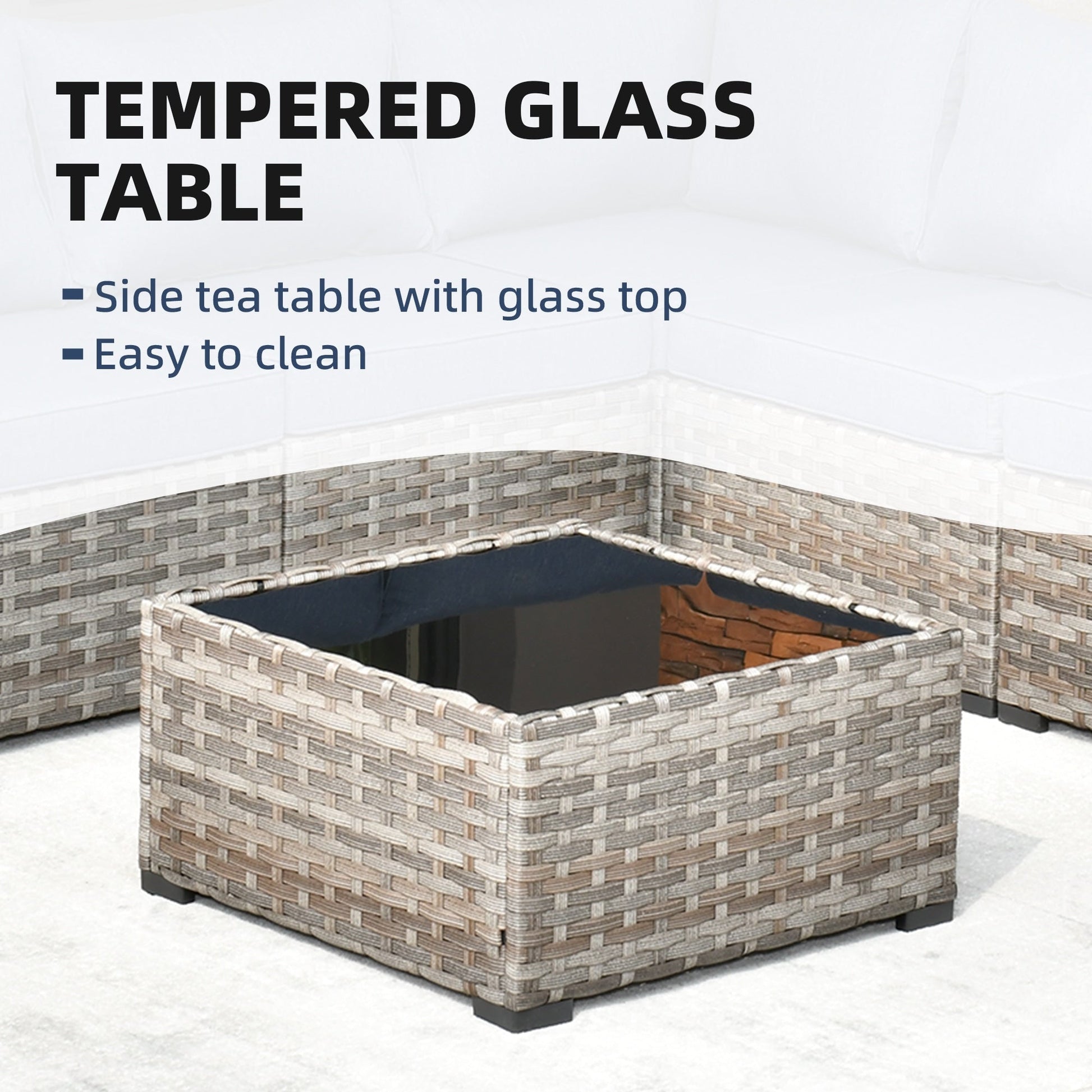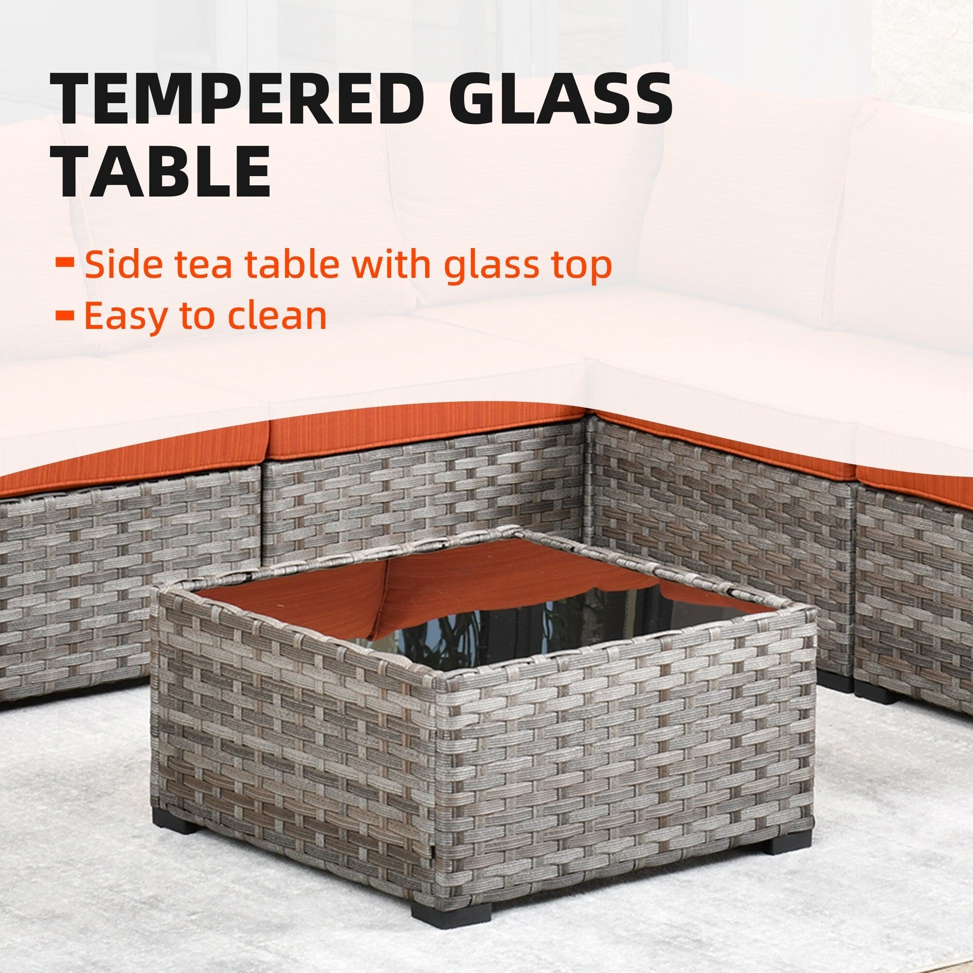 5. Elegante tavolino da caffè con piano in vetro: l'elegante tavolino da caffè in vimini è dotato di un piano in vetro temperato che aggiunge un tocco di eleganza e raffinatezza al tuo spazio esterno, perfetto per intrattenere gli ospiti o godersi un momento di tranquillità nel tuo giardino.