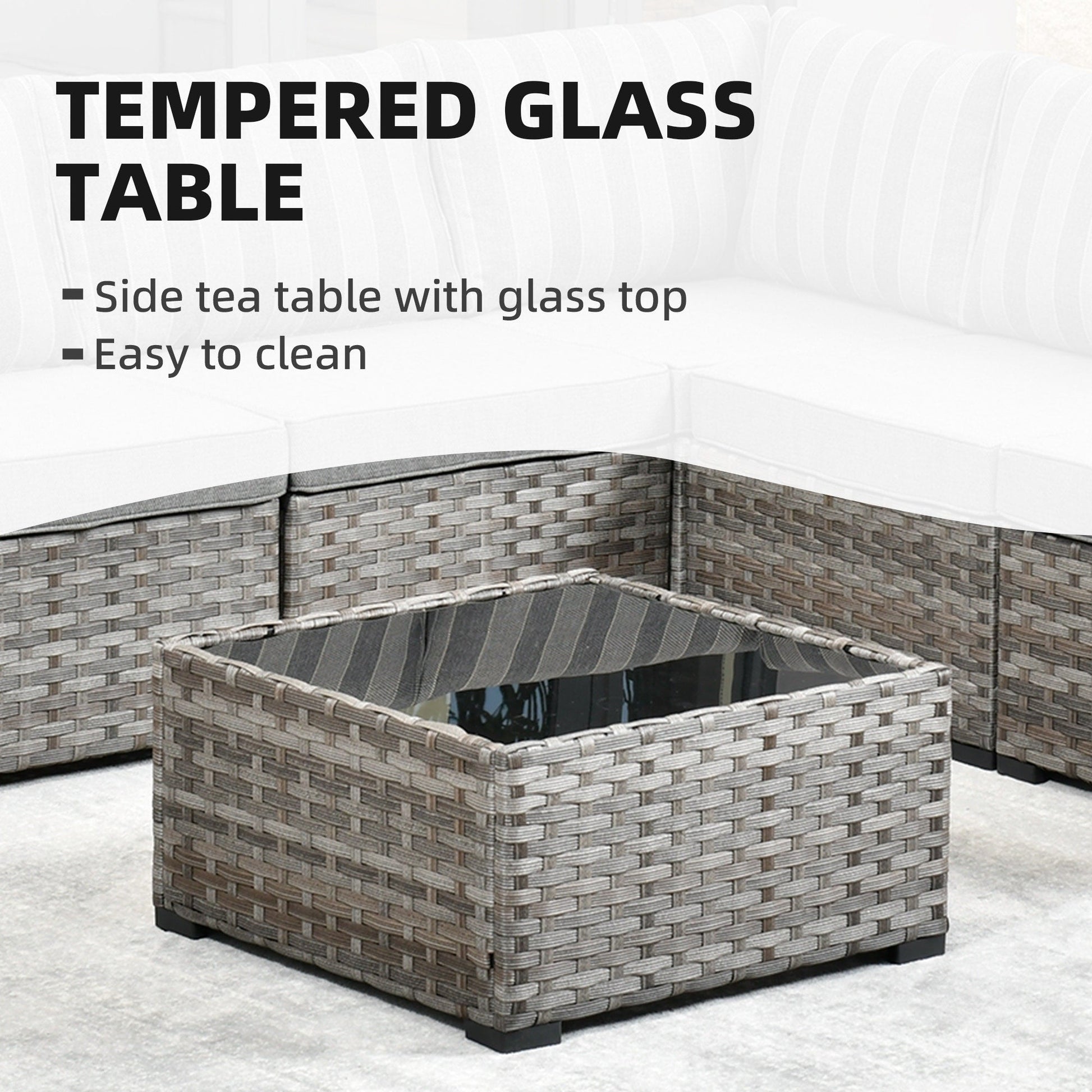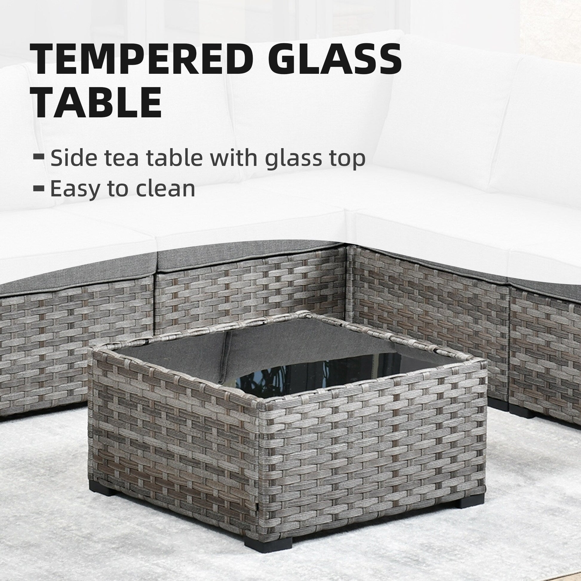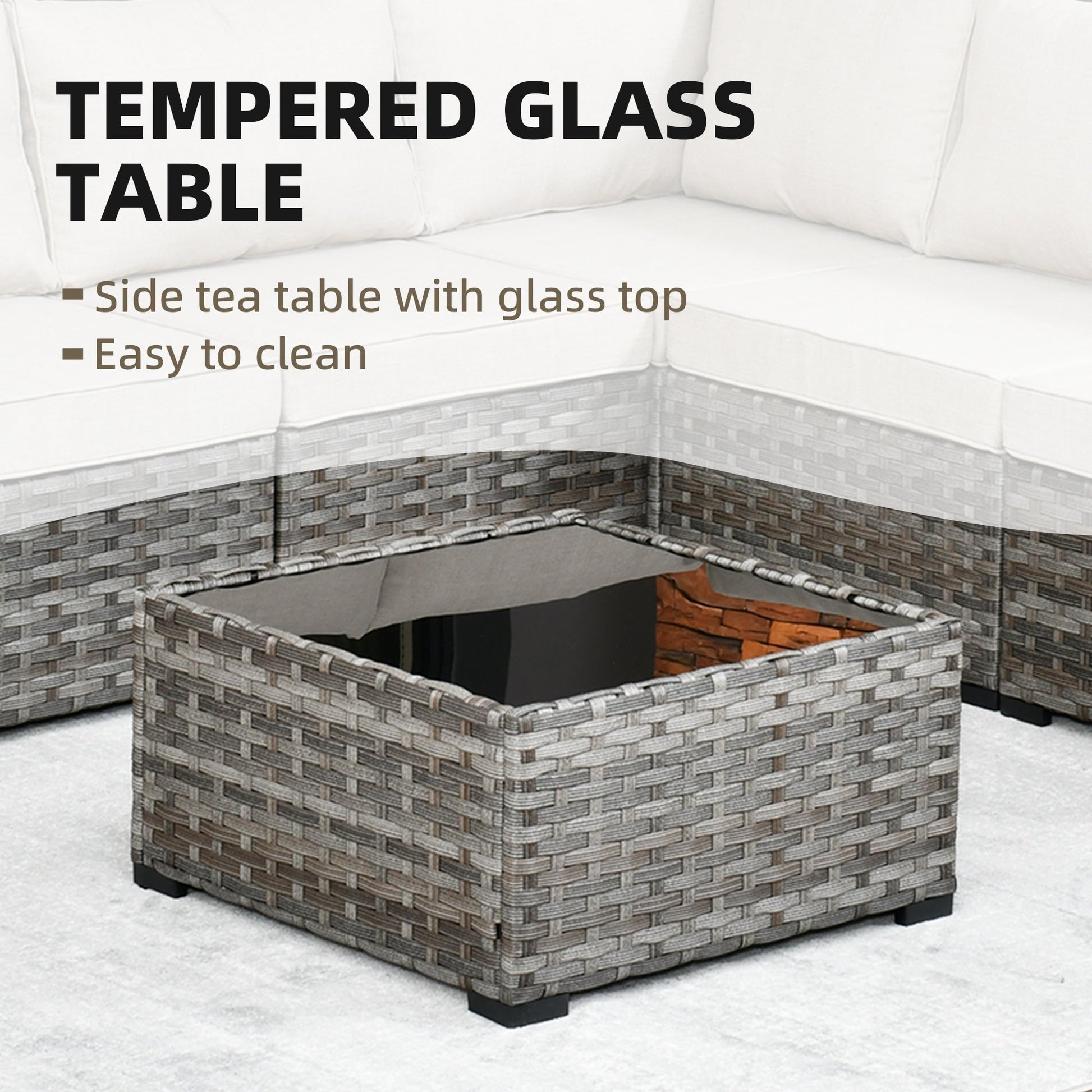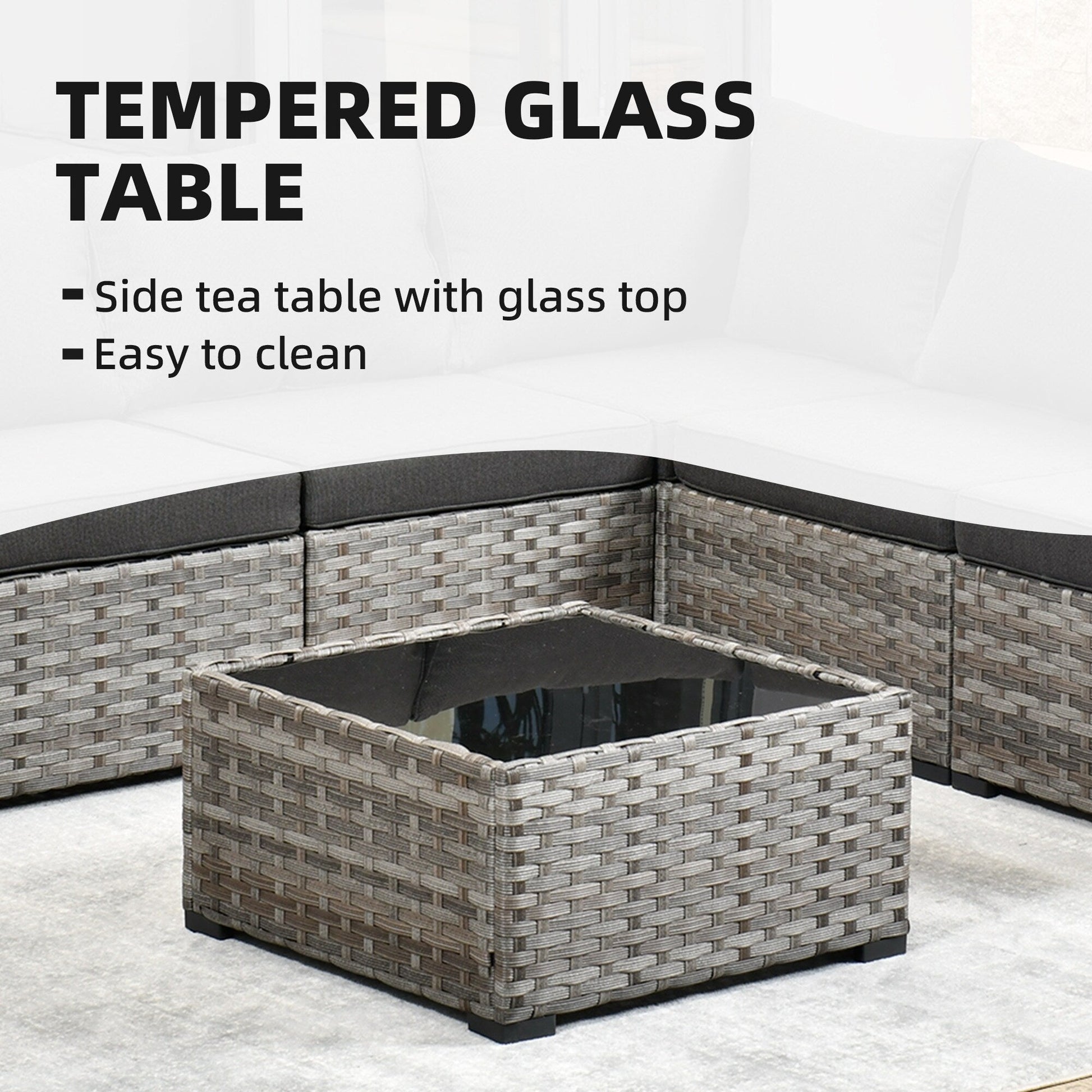 5. Elegante tavolino da caffè con piano in vetro: l'elegante tavolino da caffè in vimini è dotato di un piano in vetro temperato che aggiunge un tocco di eleganza e raffinatezza al tuo spazio esterno, perfetto per intrattenere gli ospiti o godersi un momento di tranquillità nel tuo giardino.