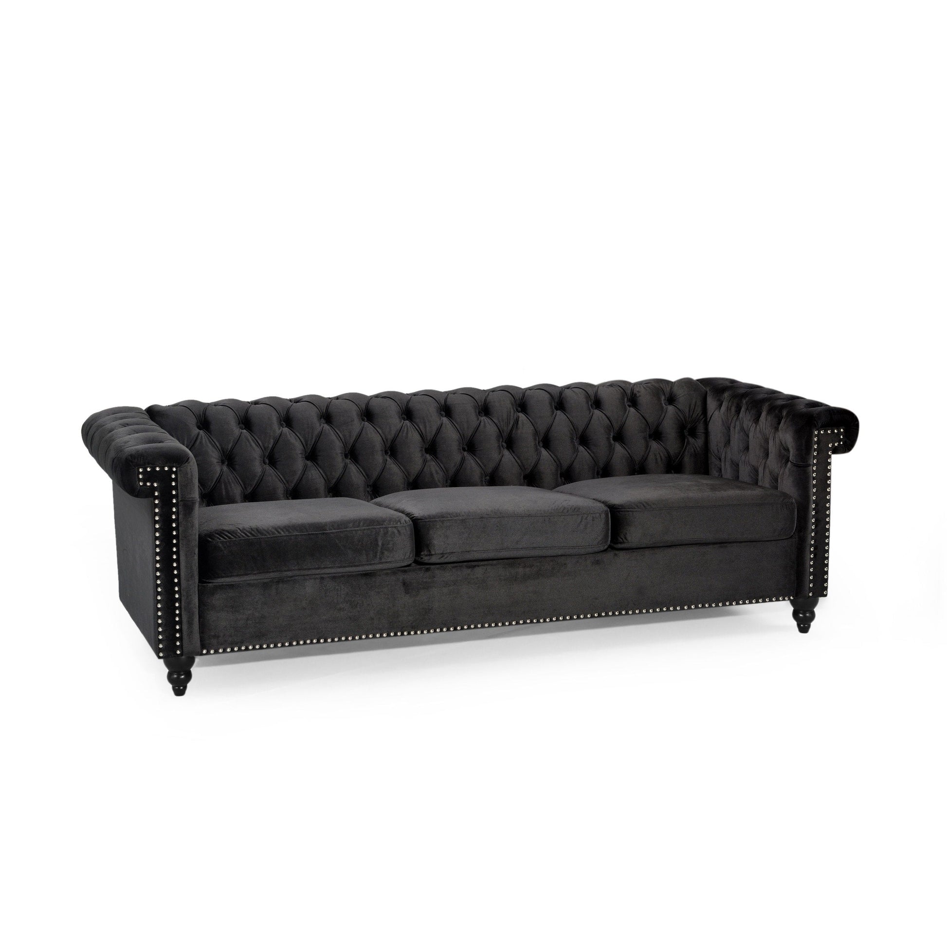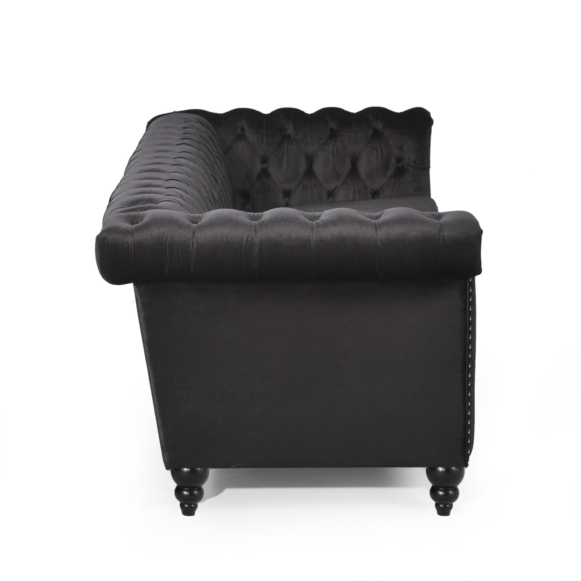 Aggiungi un tocco di eleganza al tuo soggiorno con il divano Parkhurst in velluto trapuntato di Christopher Knight Home. Questo splendido divano presenta una struttura in legno di betulla, imbottitura in schiuma, braccioli quadrati, trapuntatura a bottoni e finiture con borchie. Disponibile con rivestimento in velluto blu notte o nero, questo pezzo in stile tradizionale valorizzerà qualsiasi stanza della tua casa.
