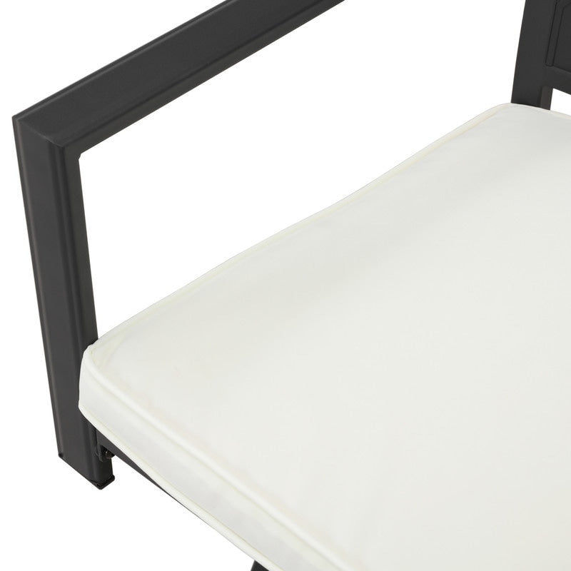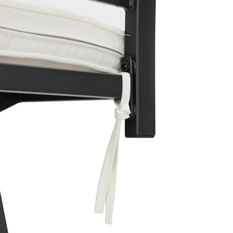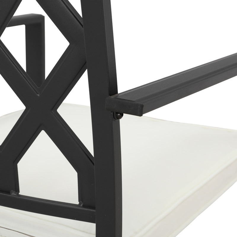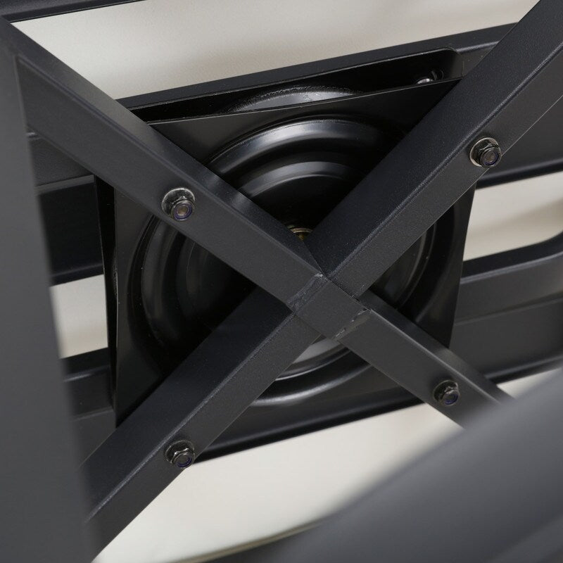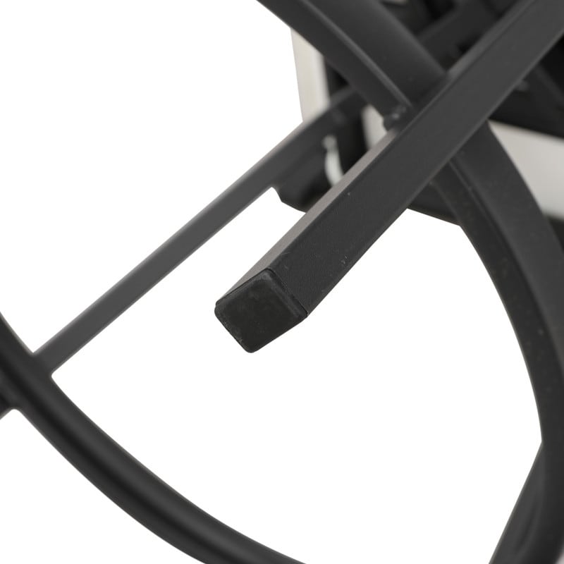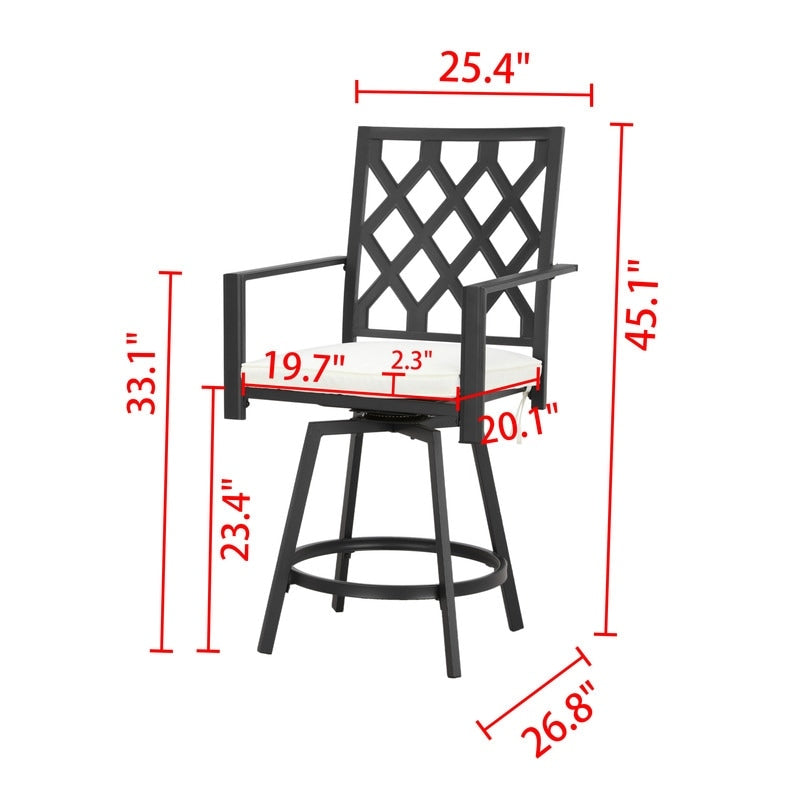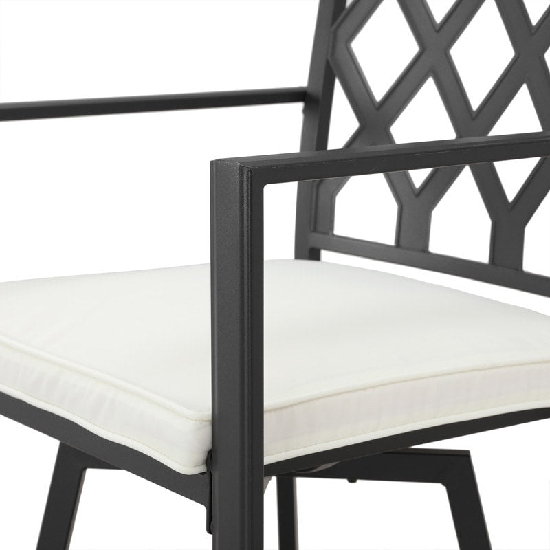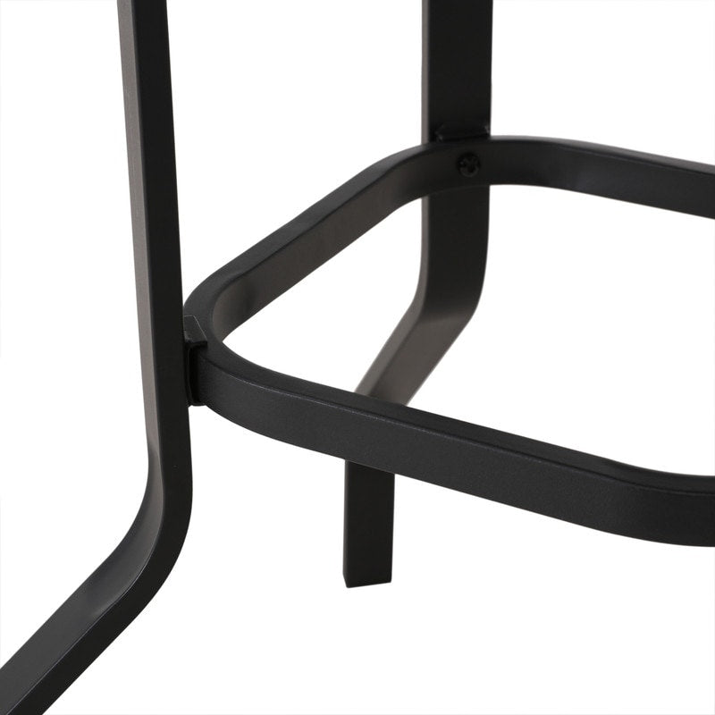 Le sedie da bar con doghe in acciaio verniciato a polvere sono girevoli, con un cuscino in tessuto di poliestere resistente e non fragile, e un telaio nero verniciato a polvere, ampio e resistente allo sporco. Il design lineare del prodotto offre una seduta confortevole e un'esperienza visiva di grande impatto. Questo tavolo in acciaio è progettato per vivere all'aperto. È perfetto per il vostro patio. Abbastanza sobrio per qualsiasi contesto soleggiato, abbina una struttura con finitura nera a un piano in vetro che assume una silhouette squadrata e arrotondata.