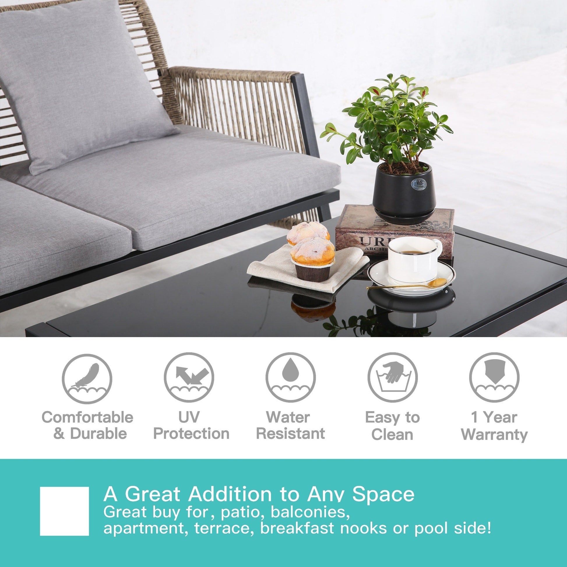 • Robusto e durevole: questo set di divani componibili da esterno, con struttura solida e rattan PE di alta qualità, è abbastanza robusto da resistere a tutte le condizioni atmosferiche. Il vetro temperato è facile da pulire.