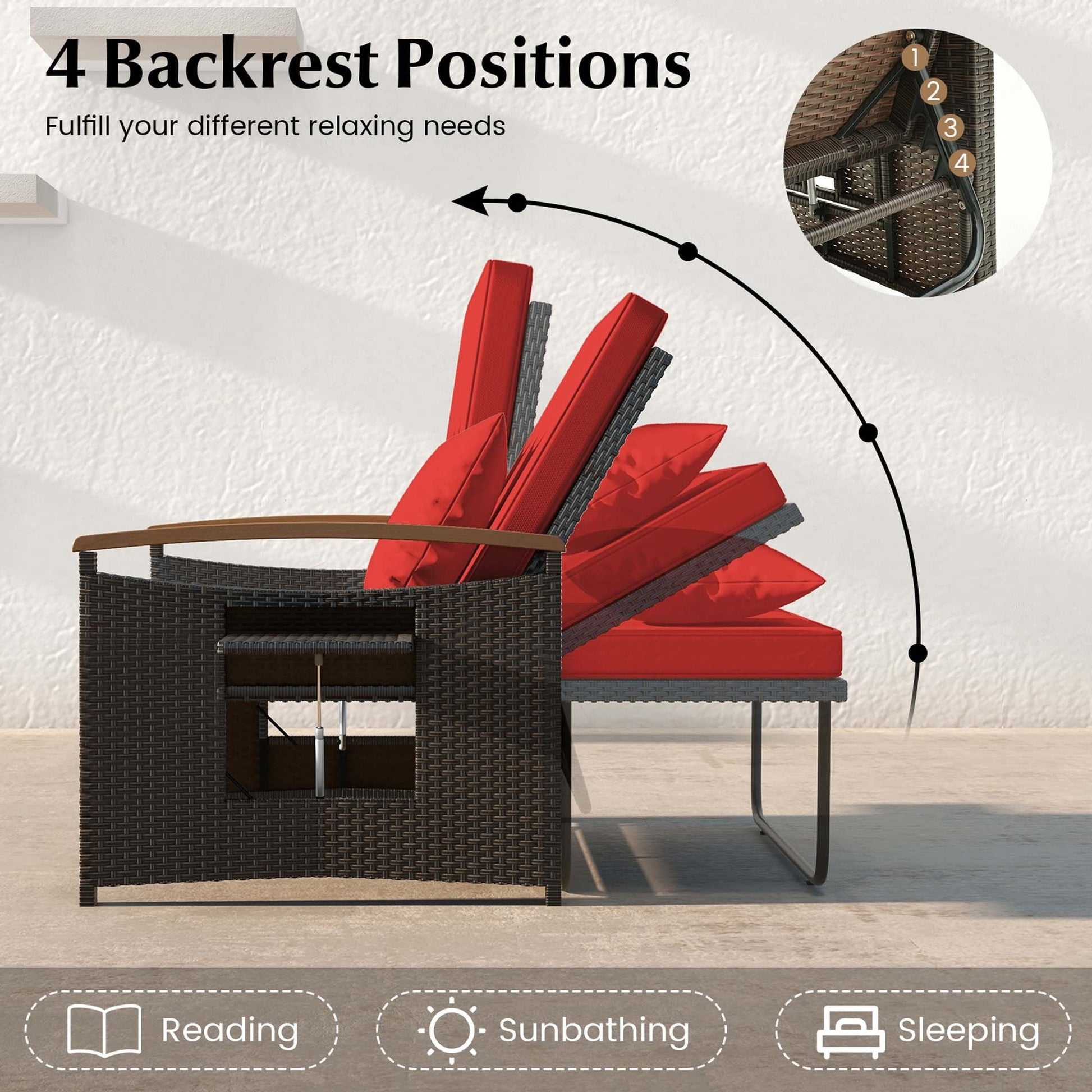 Che tu voglia sederti, sdraiarti o avere spazio per riporre oggetti, questo set di mobili da esterno multifunzionale soddisfa sempre le tue esigenze perché offre 3 modalità di utilizzo: divano a due posti imbottito, divano letto o set divano a due posti e tavolino. Ottenere un tavolino è semplice: basta aprire lo sportello anteriore del pouf e posizionare il cuscino del pouf. Oltre a ciò, il divano a due posti è progettato con vassoi laterali retrattili per offrire più spazio di archiviazione. Vale la pena ricordare che questa chaise longue doppia è regolabile su 4 livelli per soddisfare le tue diverse esigenze. Indipendentemente dal modo in cui scegli di utilizzarlo, i morbidi cuscini imbottiti ti faranno sentire sempre a tuo agio. Inoltre, il rattan PE resistente al colore e la struttura in metallo antiruggine garantiscono una maggiore durata all'aperto.