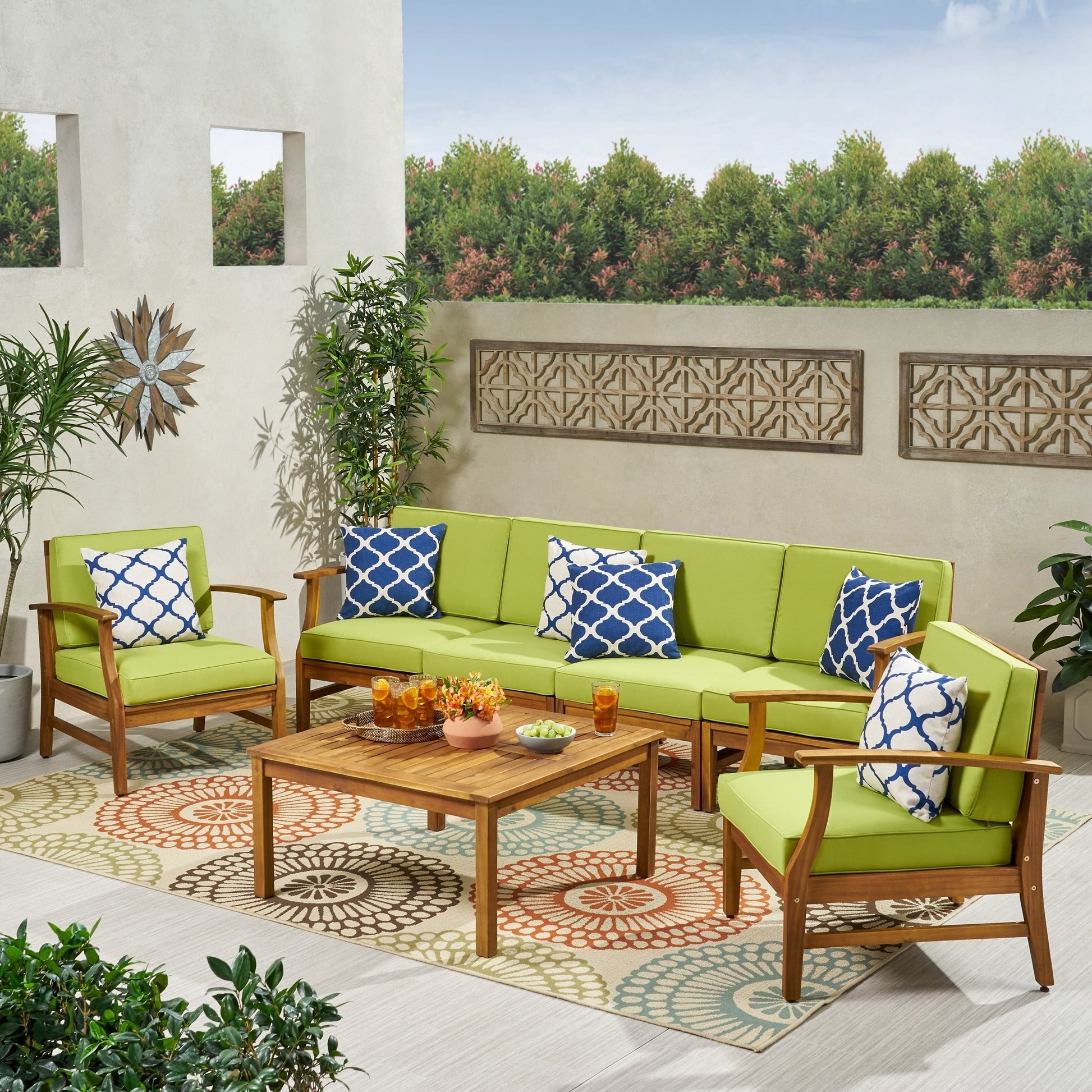 Crea uno spazio confortevole per le tue riunioni all'aperto con questo set da salotto da giardino. Il set include sette pezzi personalizzabili in qualsiasi disposizione per adattarsi al meglio al tuo spazio. Le resistenti strutture in legno di acacia e i cuscini impermeabili garantiscono una qualità duratura. Disponibile in vari colori, questo è un pezzo durevole di cui potrai godere per anni a venire.