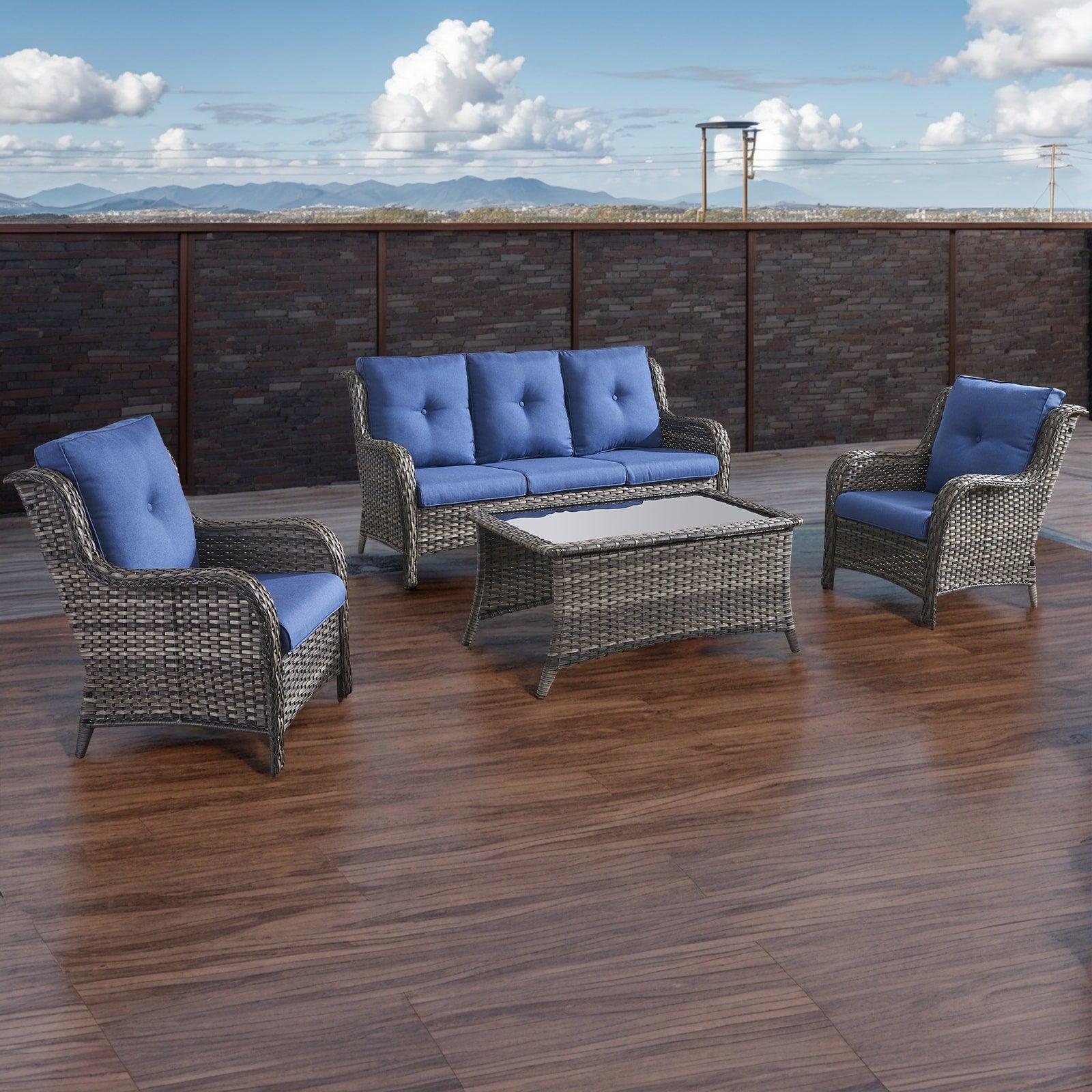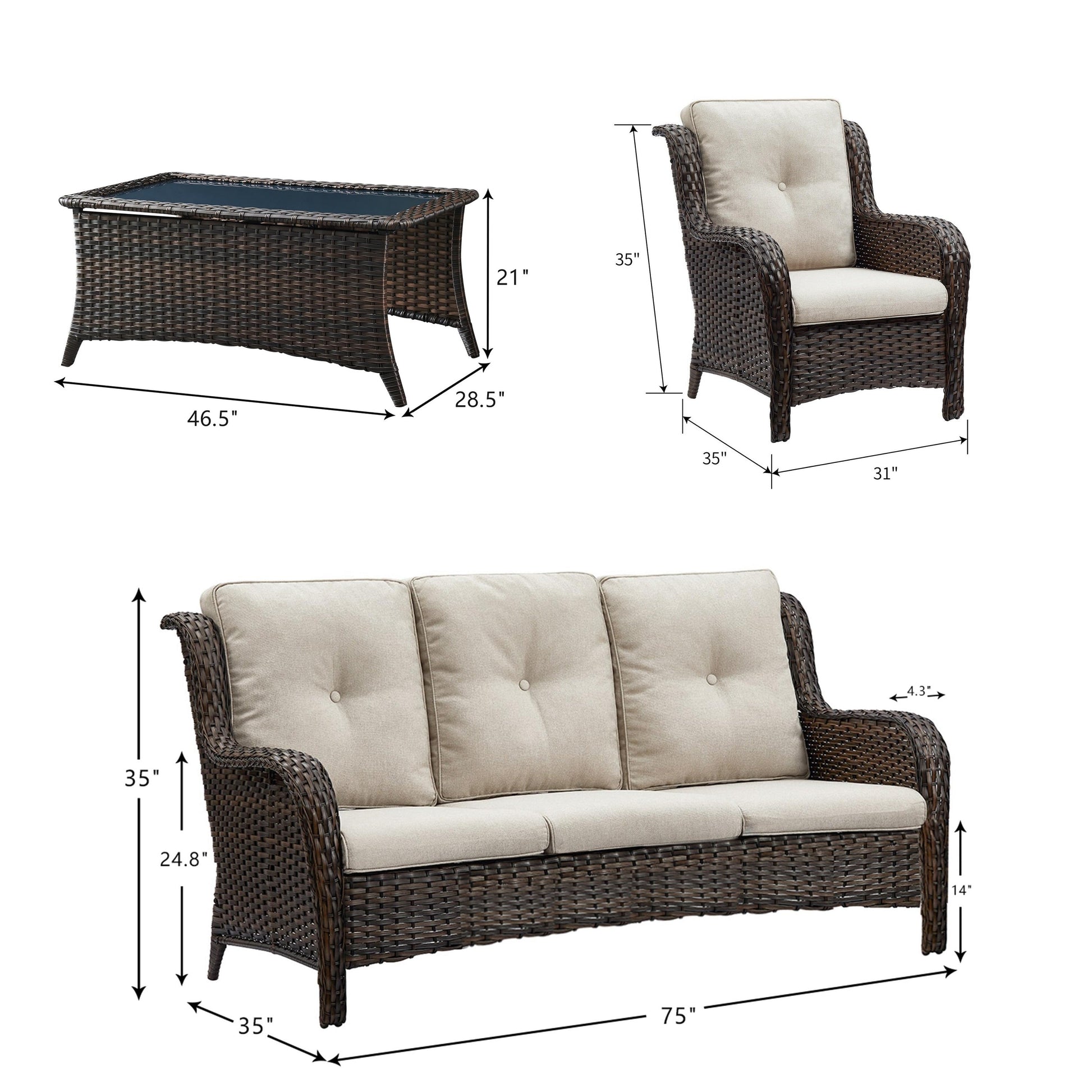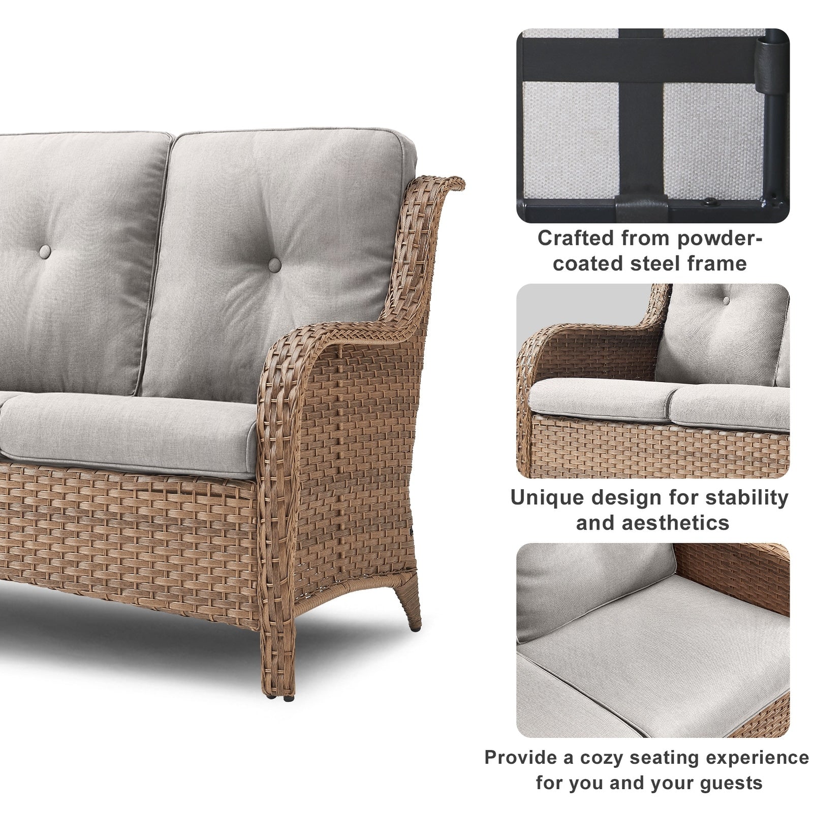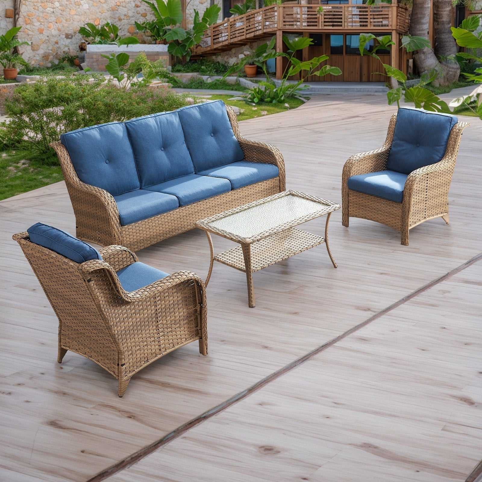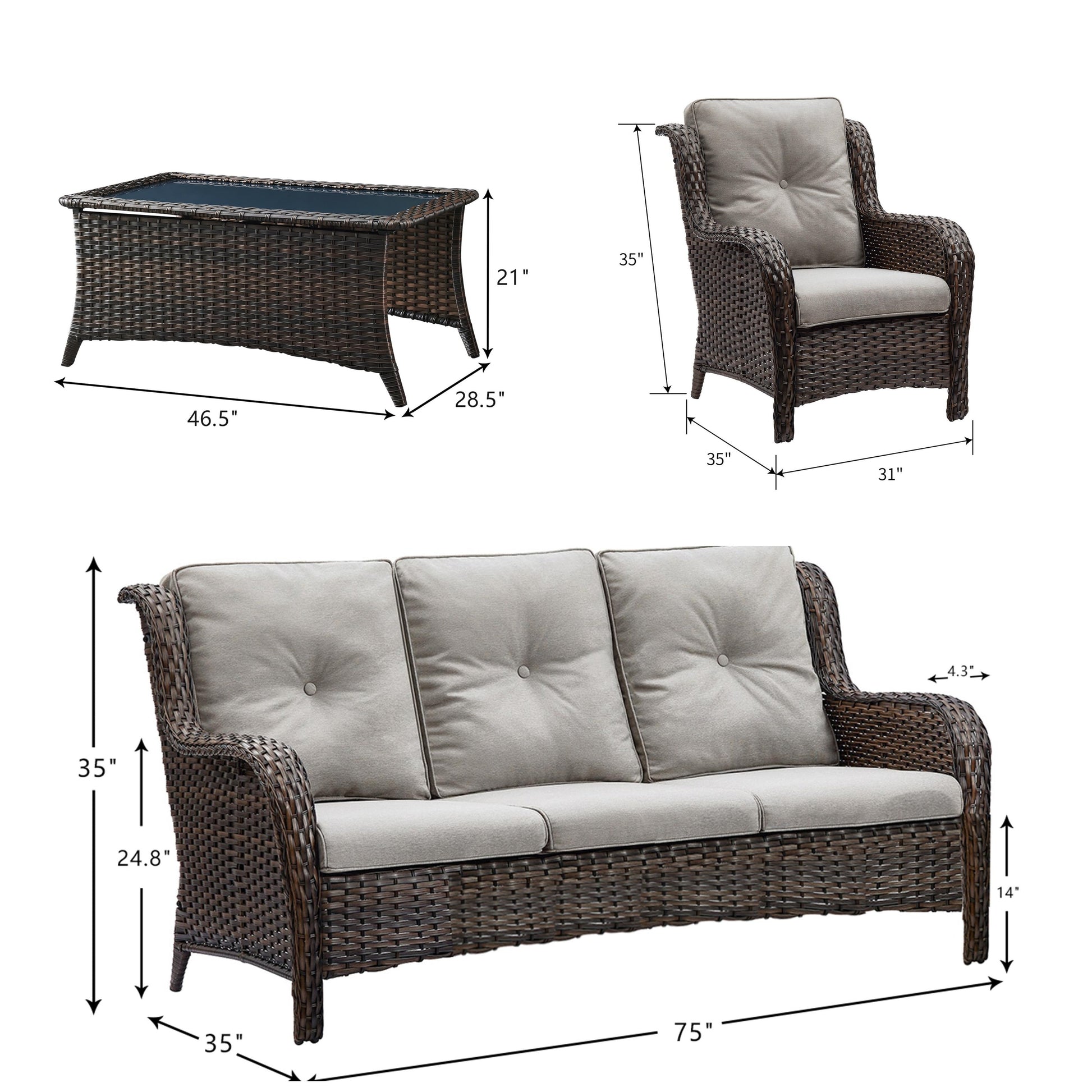 Questo set di mobili da esterno in rattan è composto da un divano a 3 posti, 2 poltrone singole e un tavolino. I mobili da giardino in vimini offrono infinite possibilità di comfort all'aperto. Perfetto per ospitare gli amici o rilassarsi con la famiglia, questo set da giardino in vimini da 4 pezzi dal design tradizionale crea uno spazio confortevole e lussuoso.