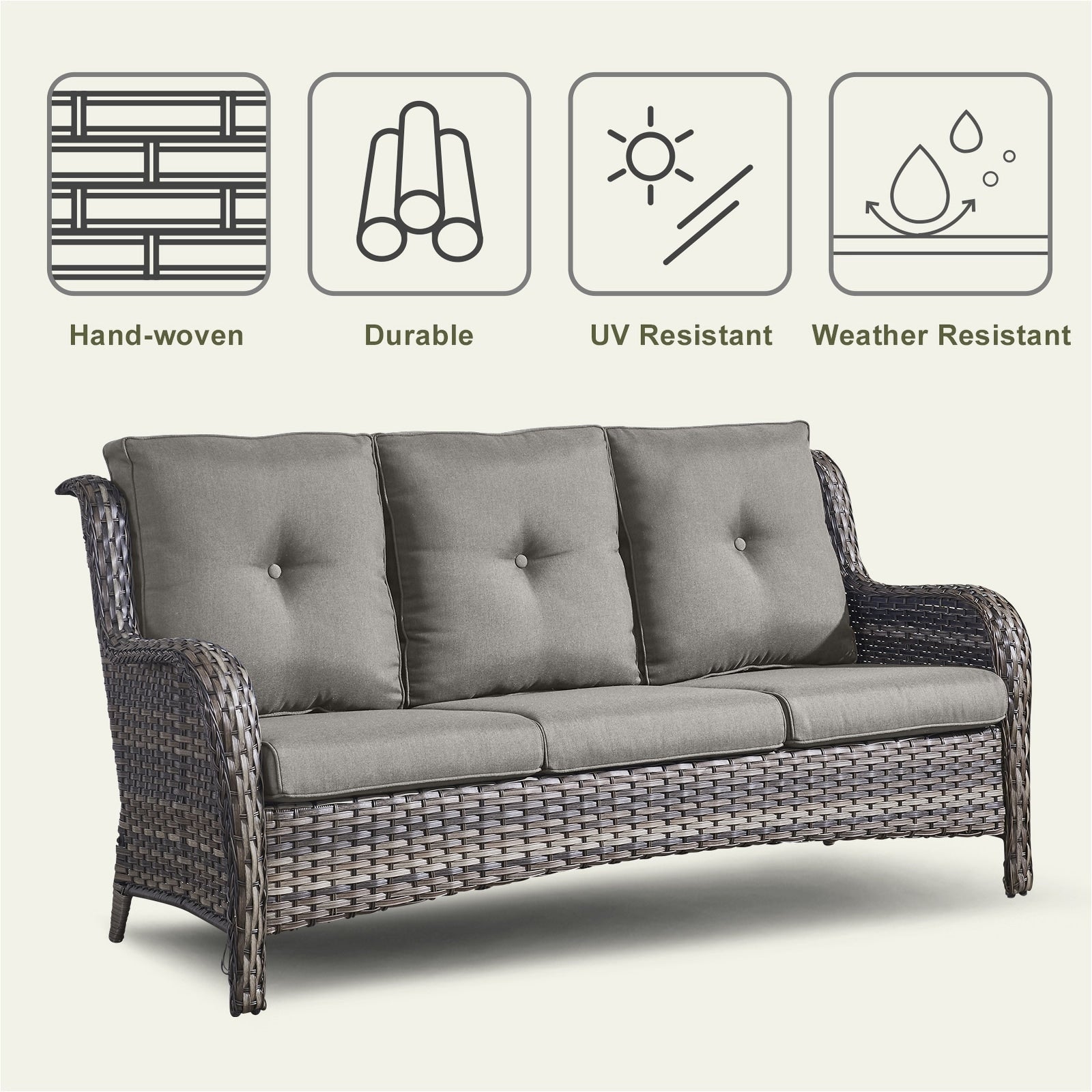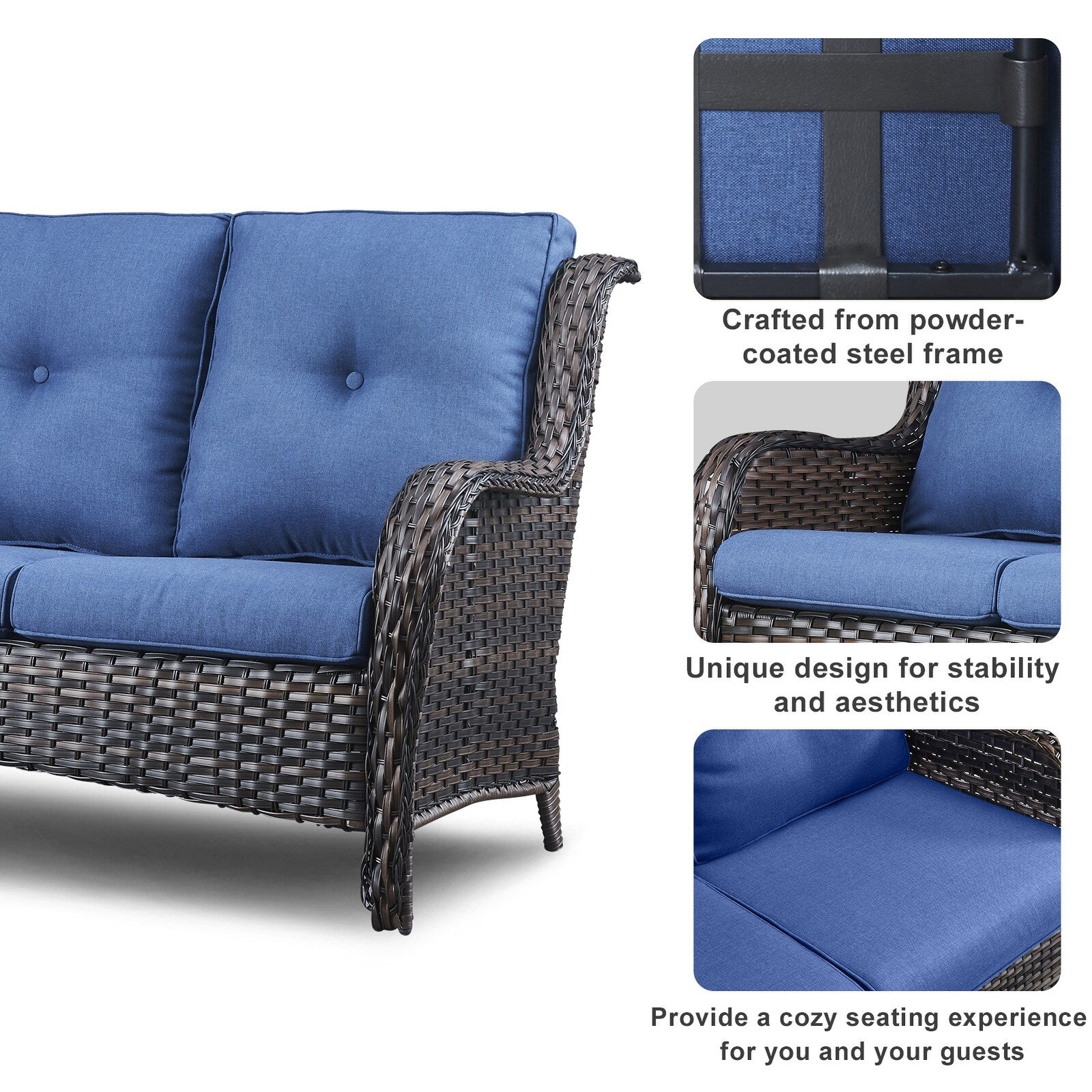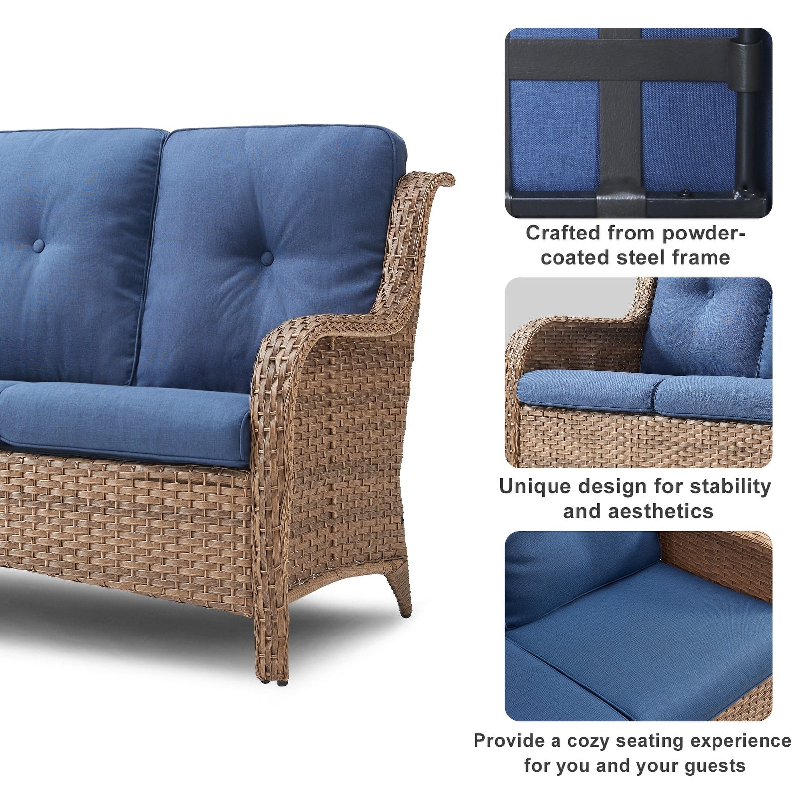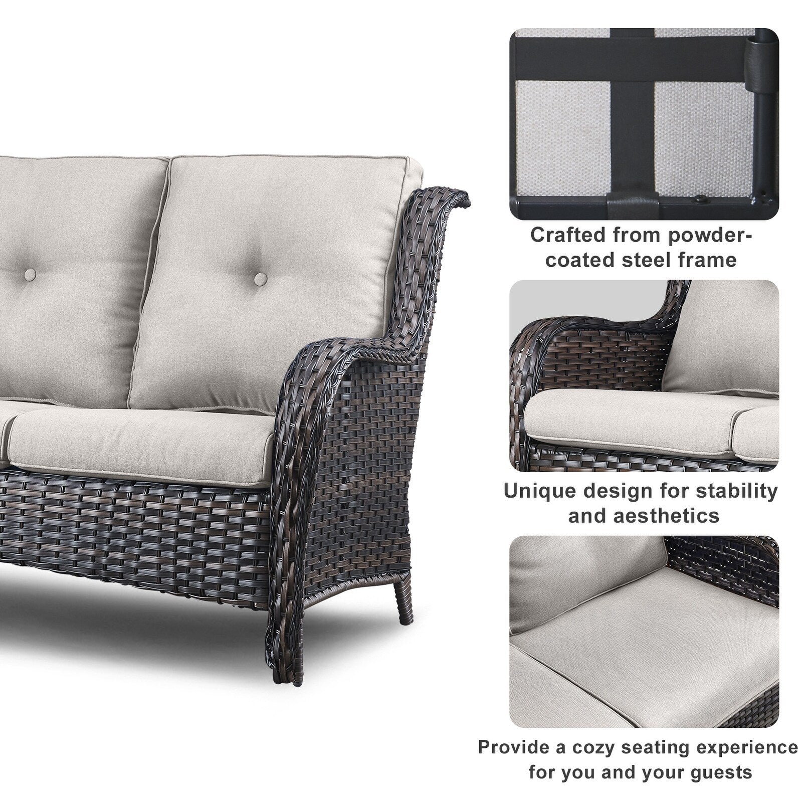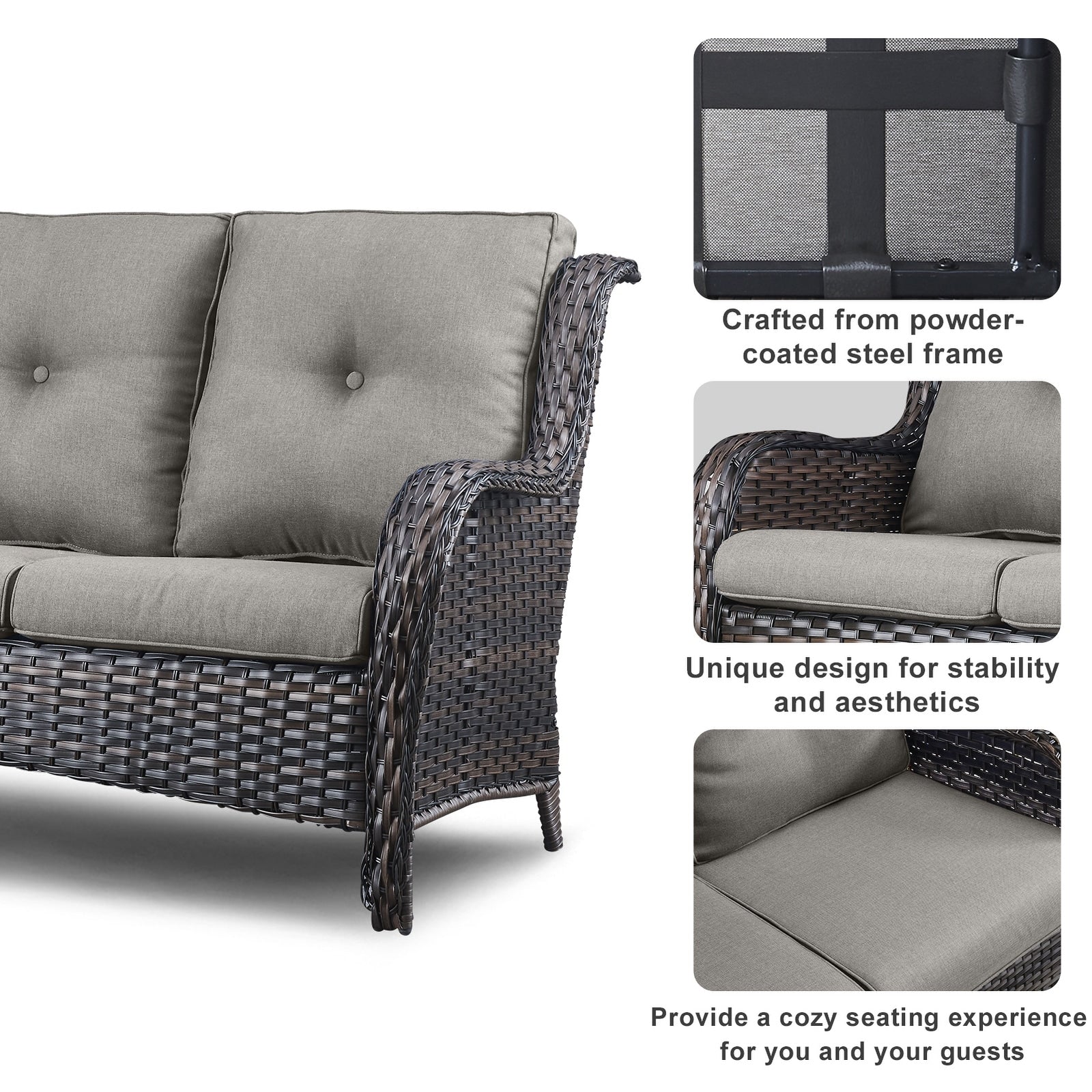 Questo set di mobili da esterno in rattan è composto da un divano a 3 posti, 2 poltrone singole e un tavolino. I mobili da giardino in vimini offrono infinite possibilità di comfort all'aperto. Perfetto per ospitare gli amici o rilassarsi con la famiglia, questo set da giardino in vimini da 4 pezzi dal design tradizionale crea uno spazio confortevole e lussuoso.