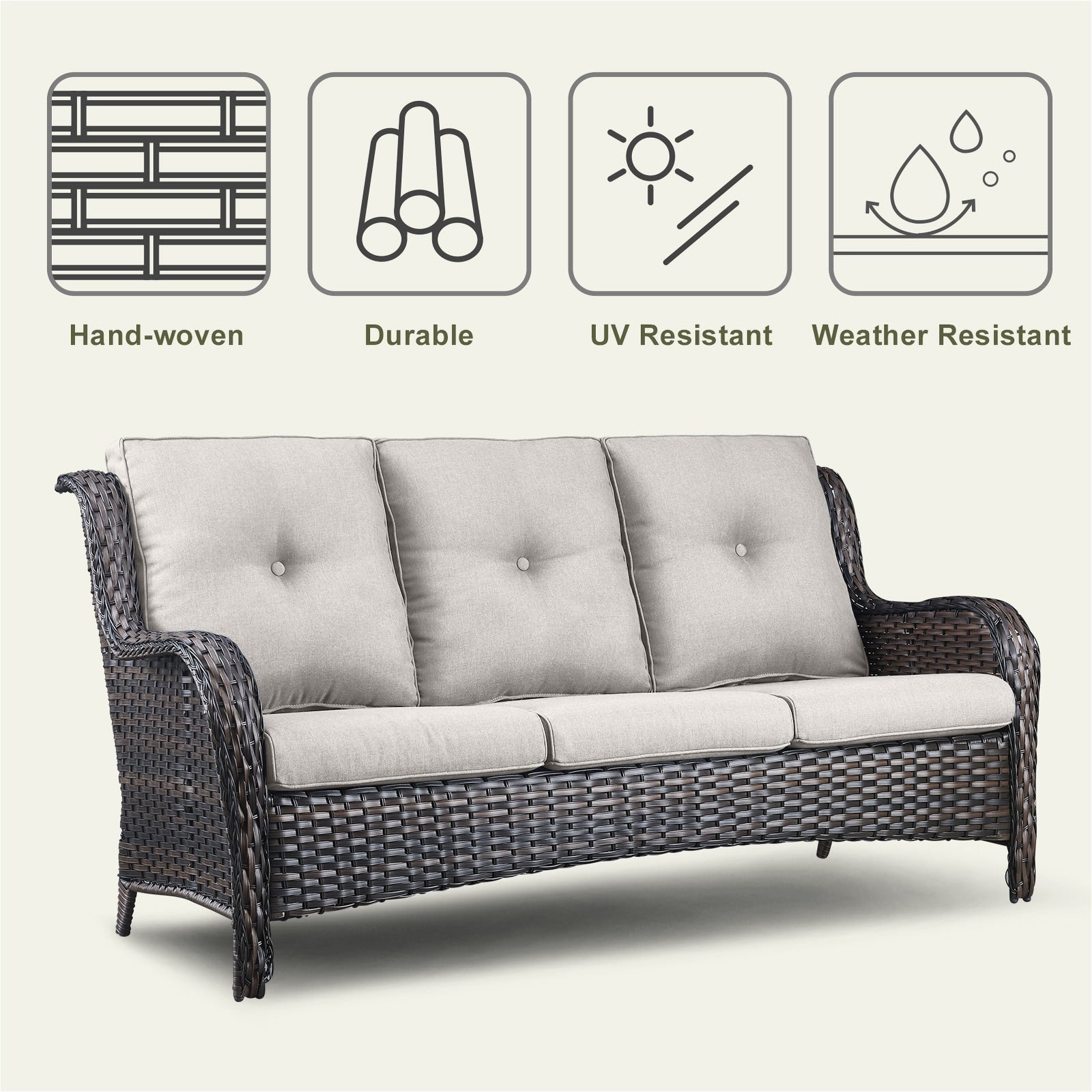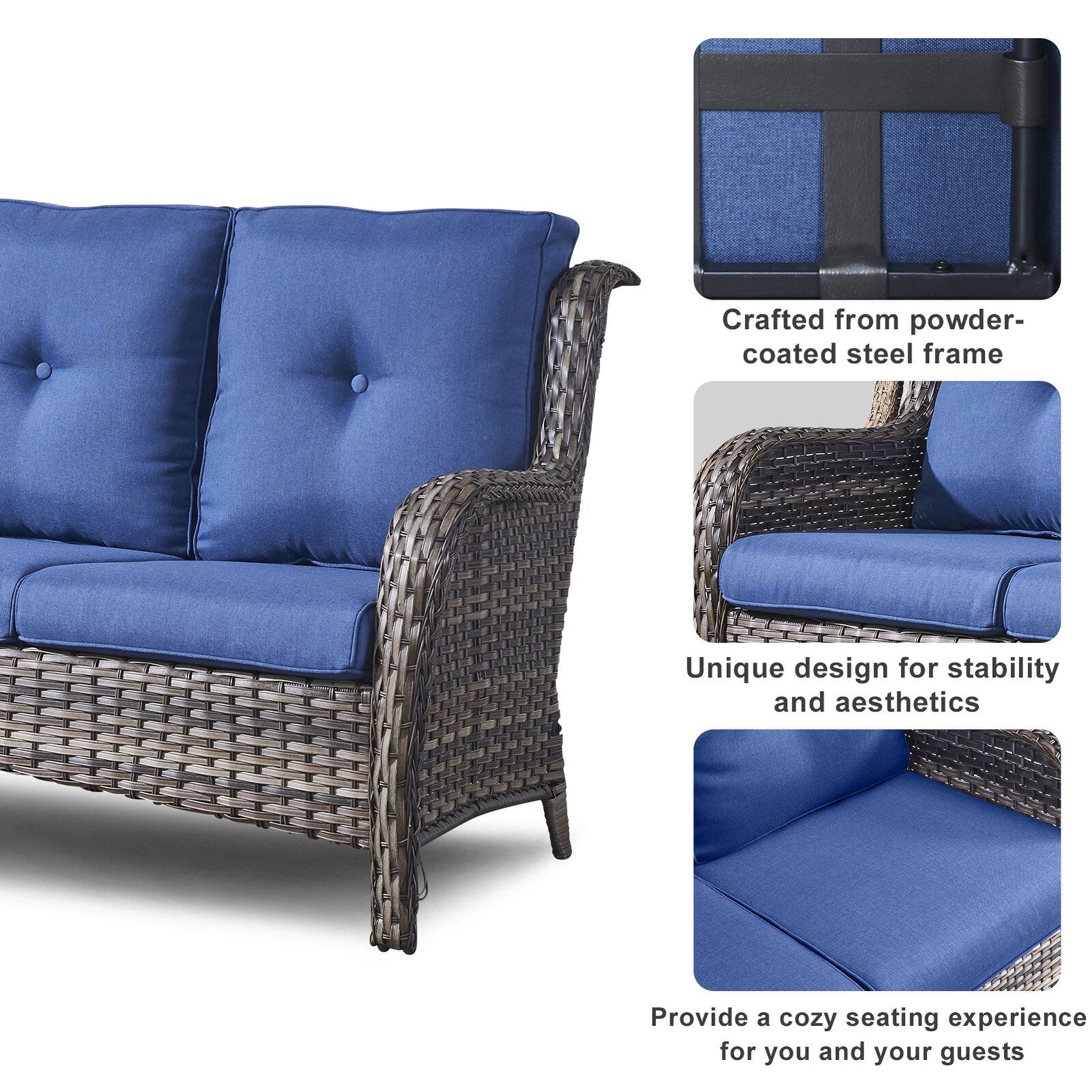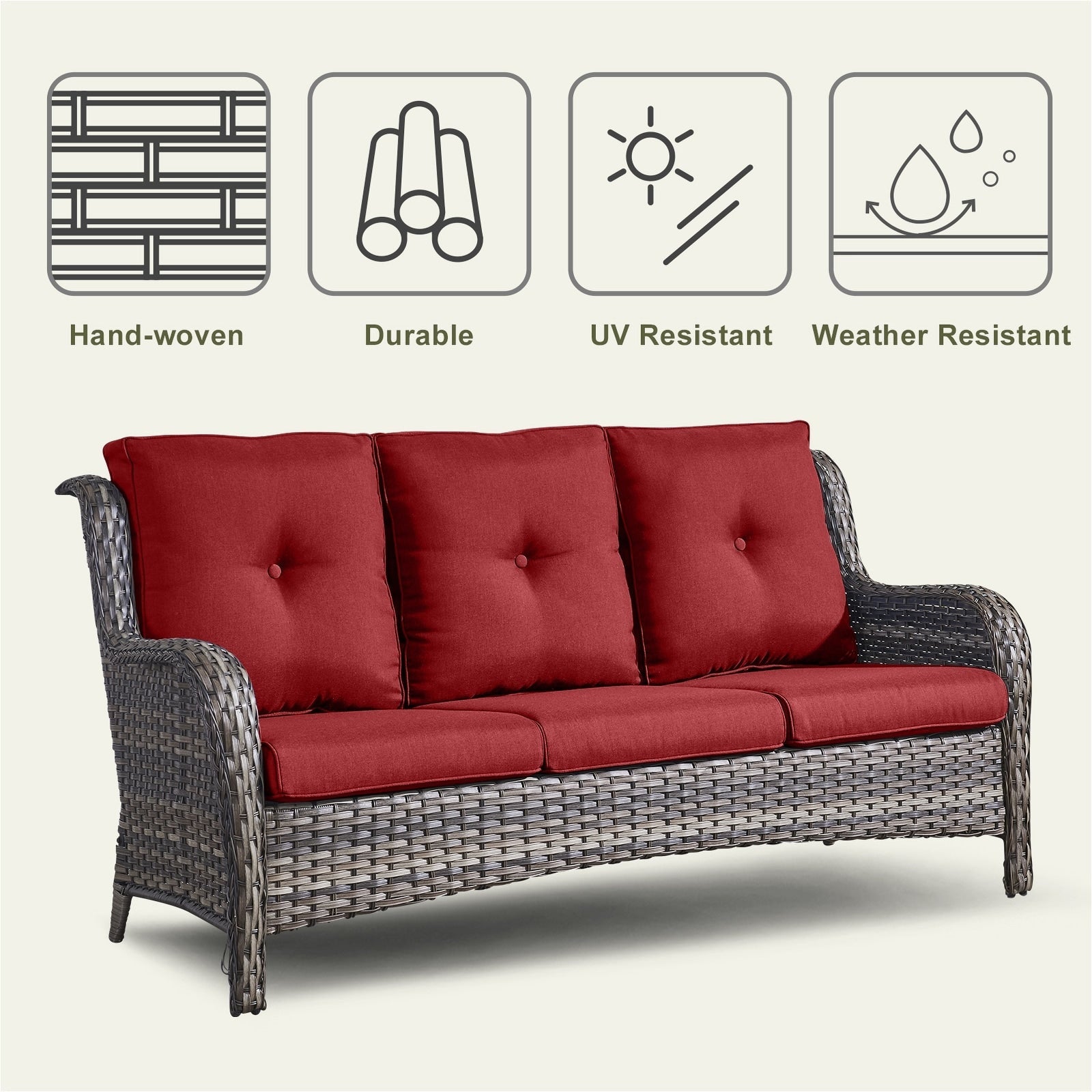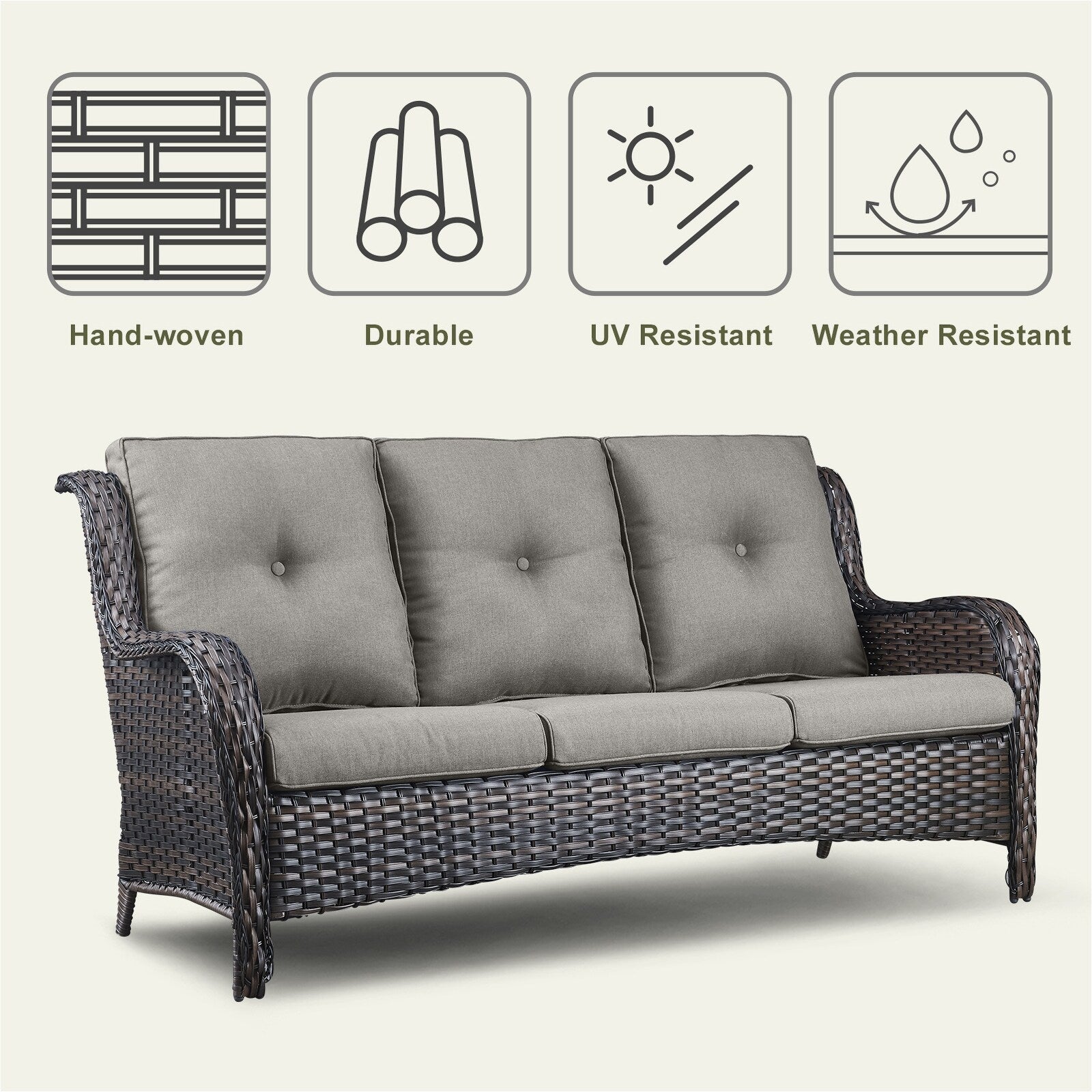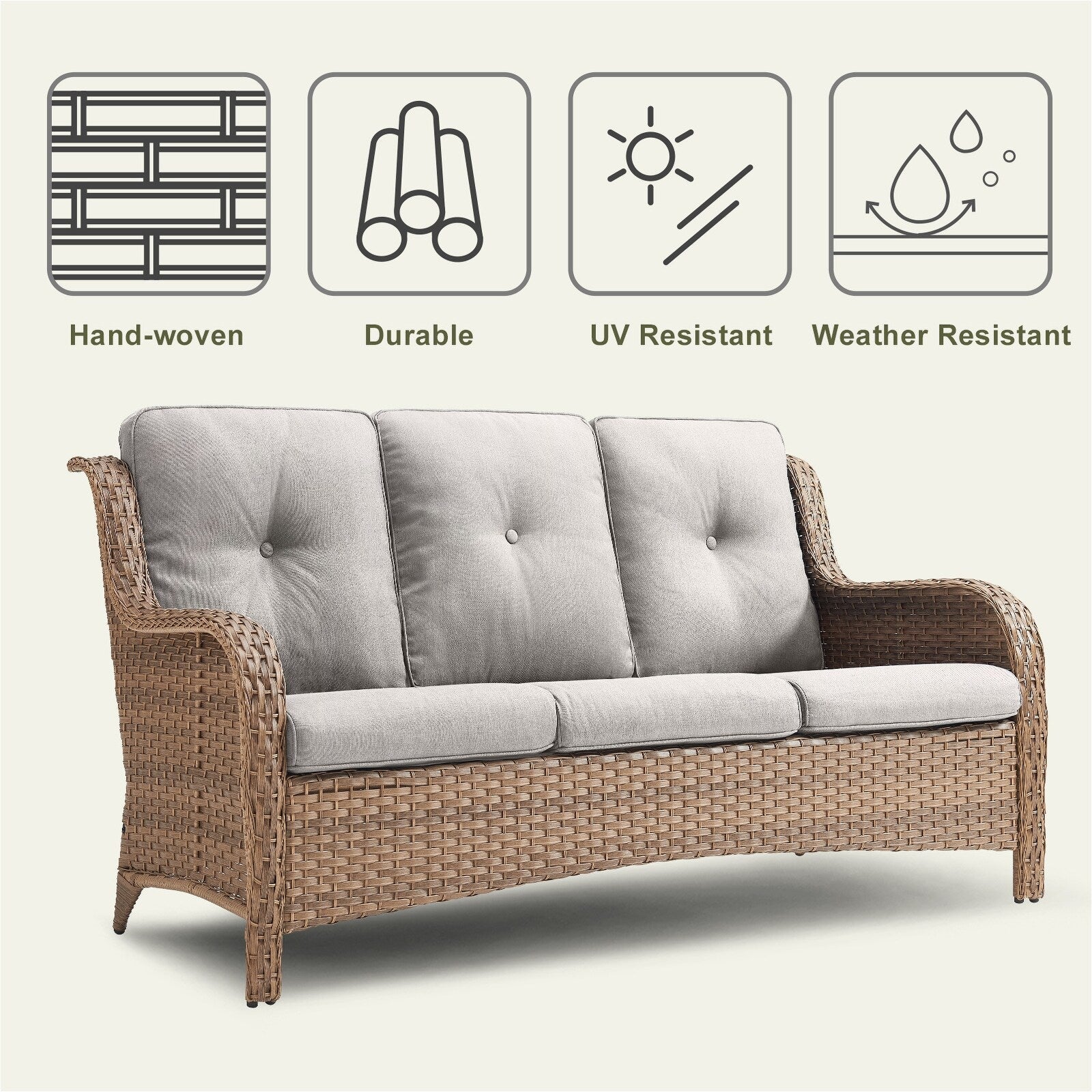 Questo set di mobili da esterno in rattan è composto da un divano a 3 posti, 2 poltrone singole e un tavolino. I mobili da giardino in vimini offrono infinite possibilità di comfort all'aperto. Perfetto per ospitare gli amici o rilassarsi con la famiglia, questo set da giardino in vimini da 4 pezzi dal design tradizionale crea uno spazio confortevole e lussuoso.