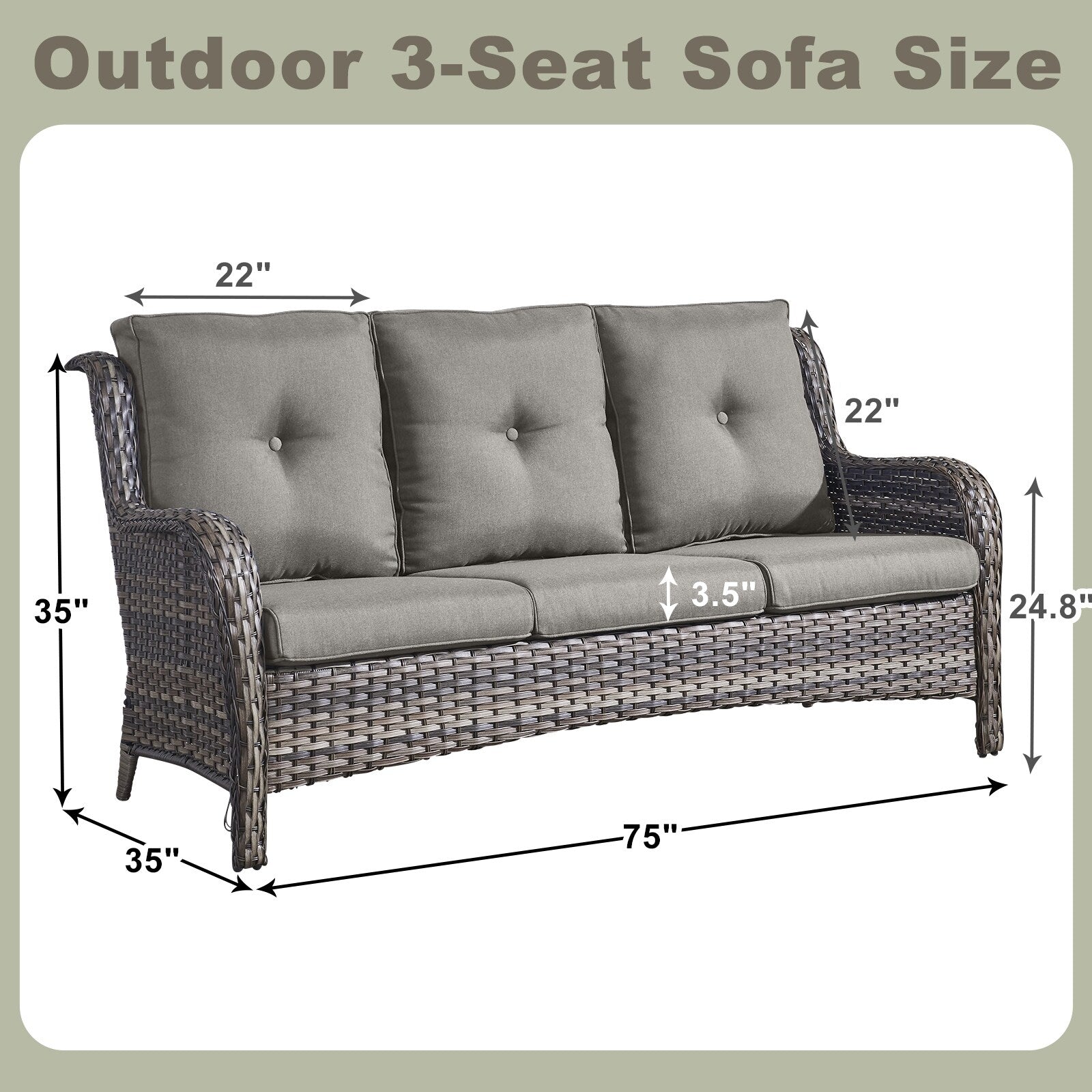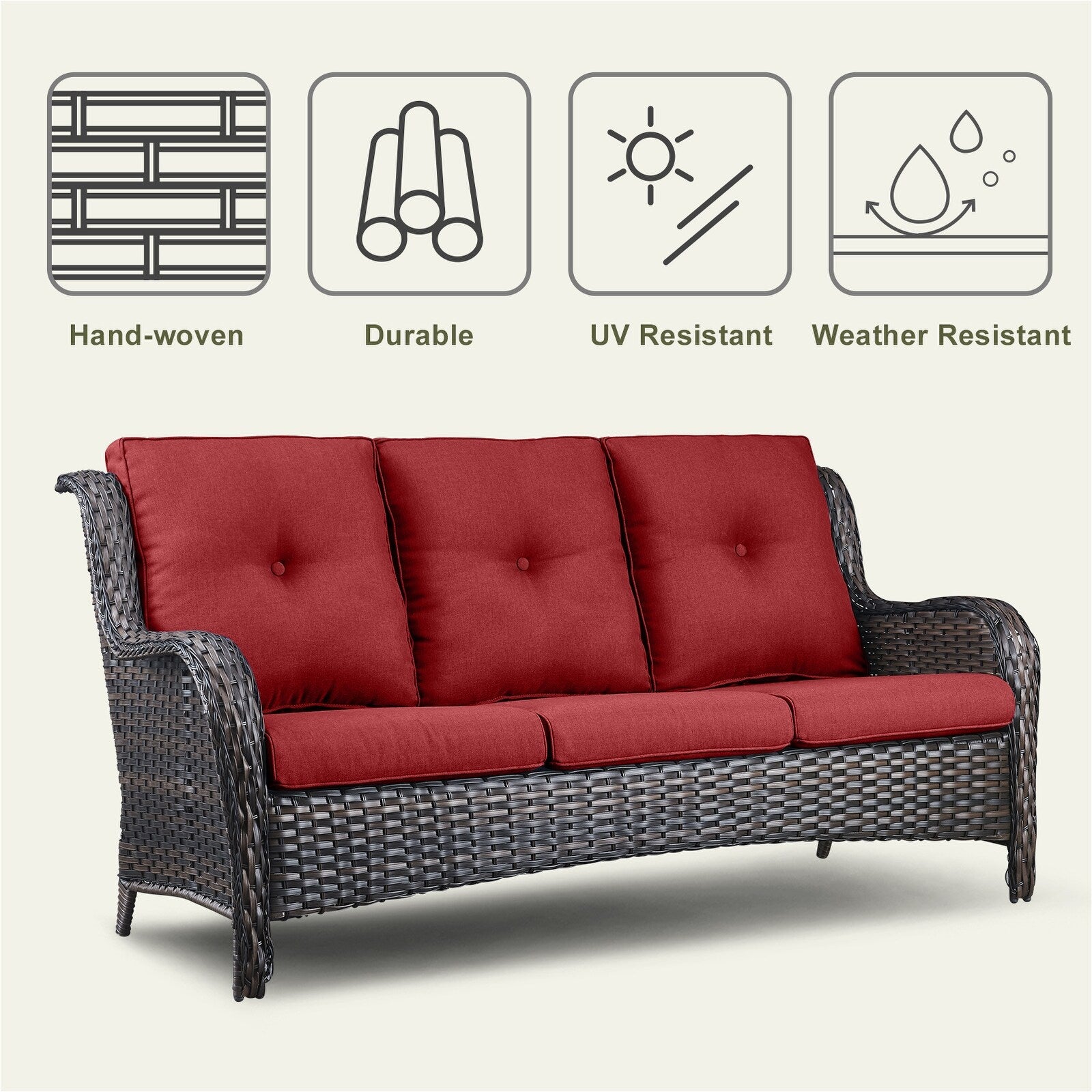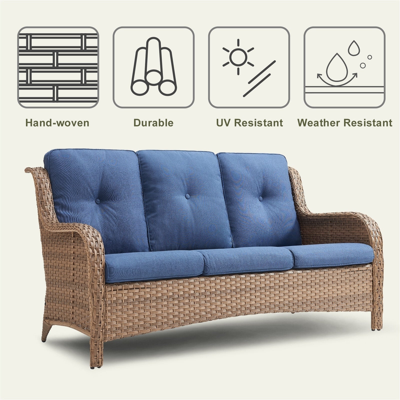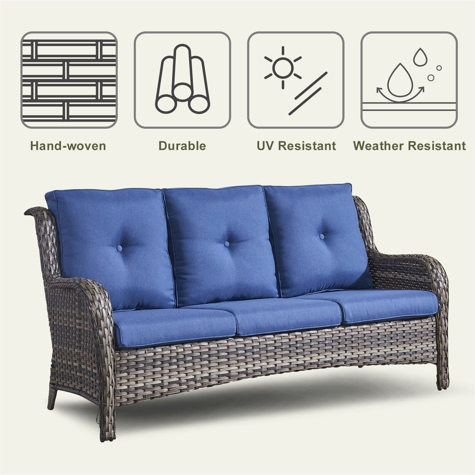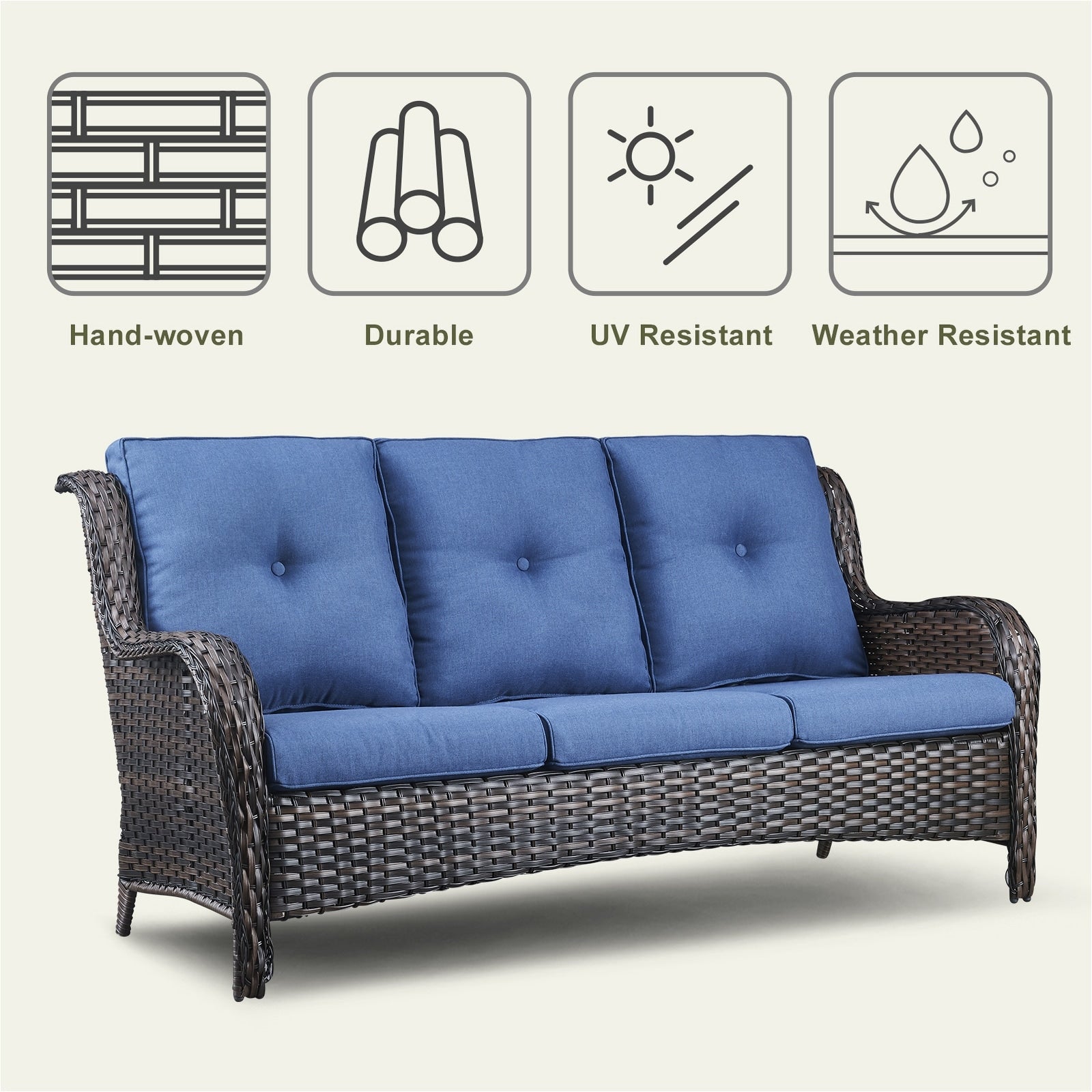 Questo set di mobili da esterno in rattan è composto da un divano a 3 posti, 2 poltrone singole e un tavolino. I mobili da giardino in vimini offrono infinite possibilità di comfort all'aperto. Perfetto per ospitare gli amici o rilassarsi con la famiglia, questo set da giardino in vimini da 4 pezzi dal design tradizionale crea uno spazio confortevole e lussuoso.