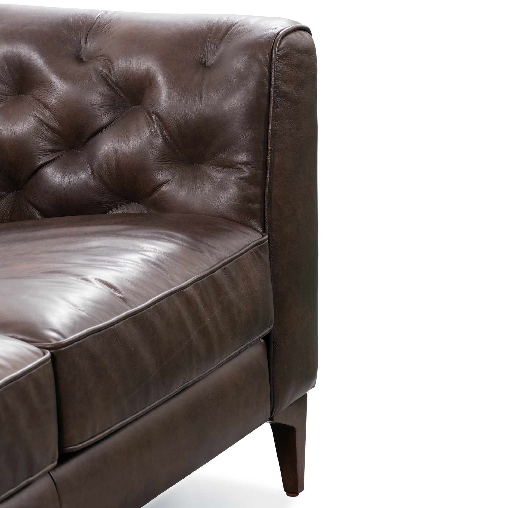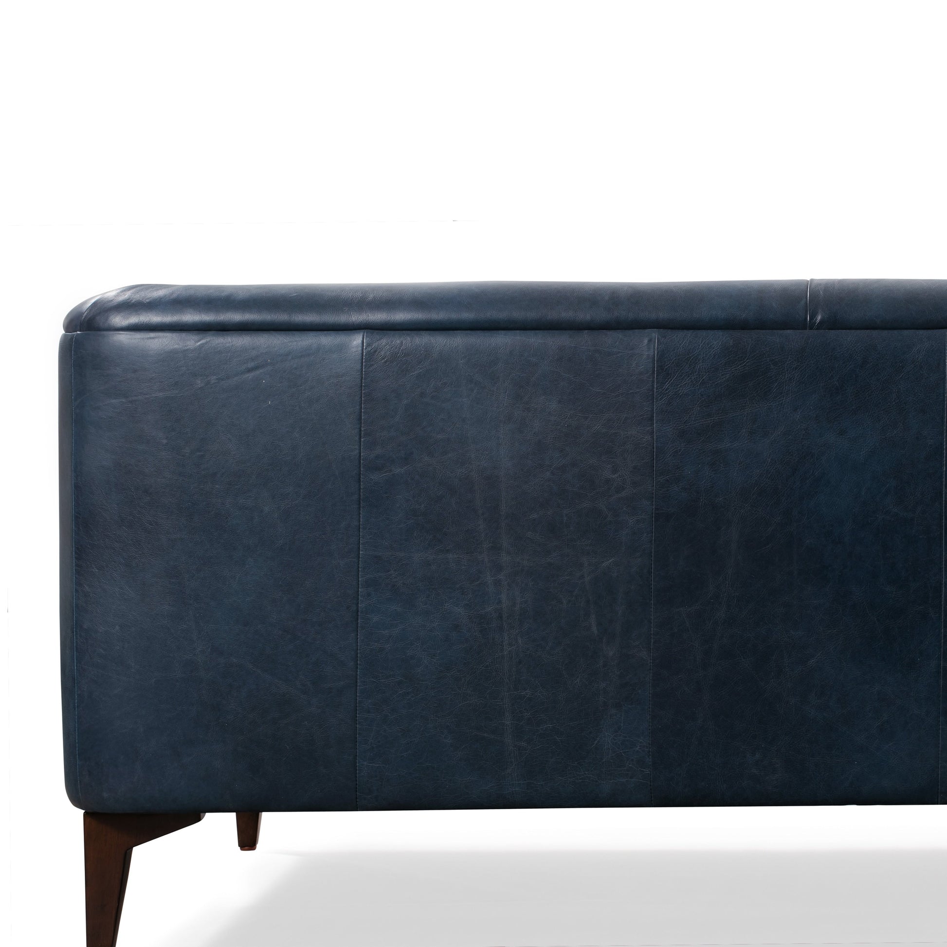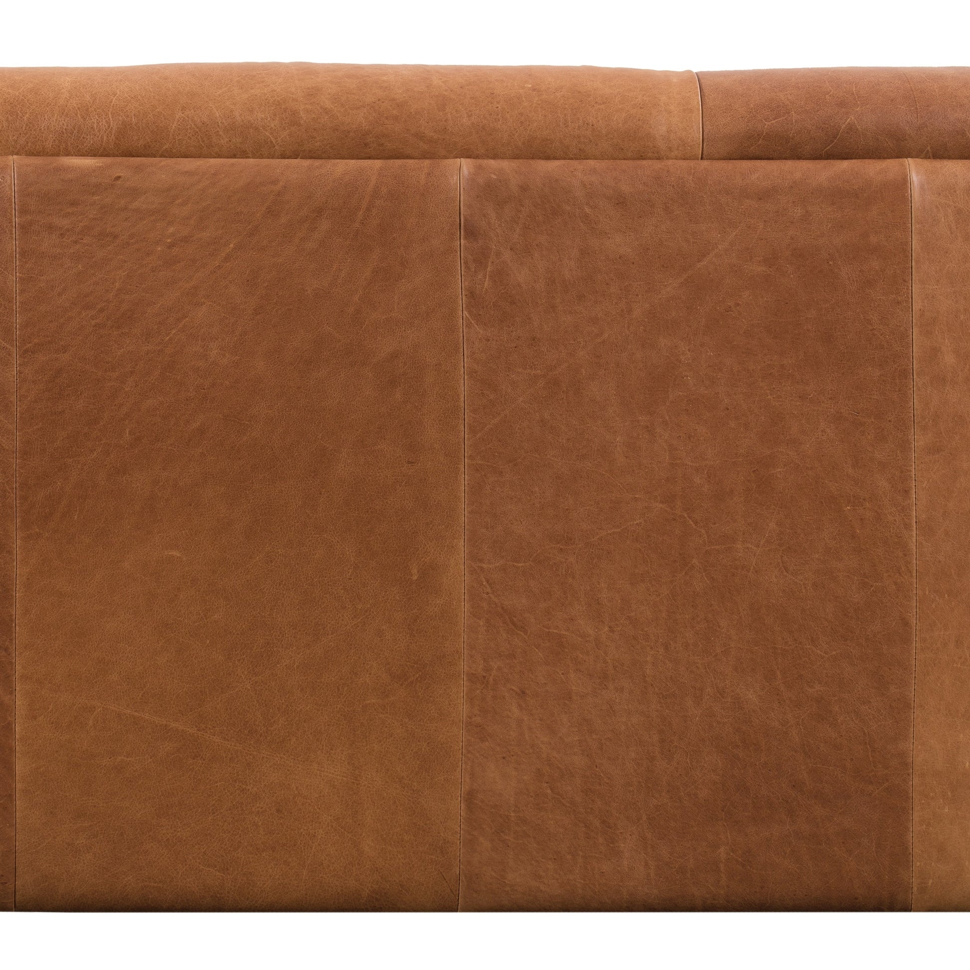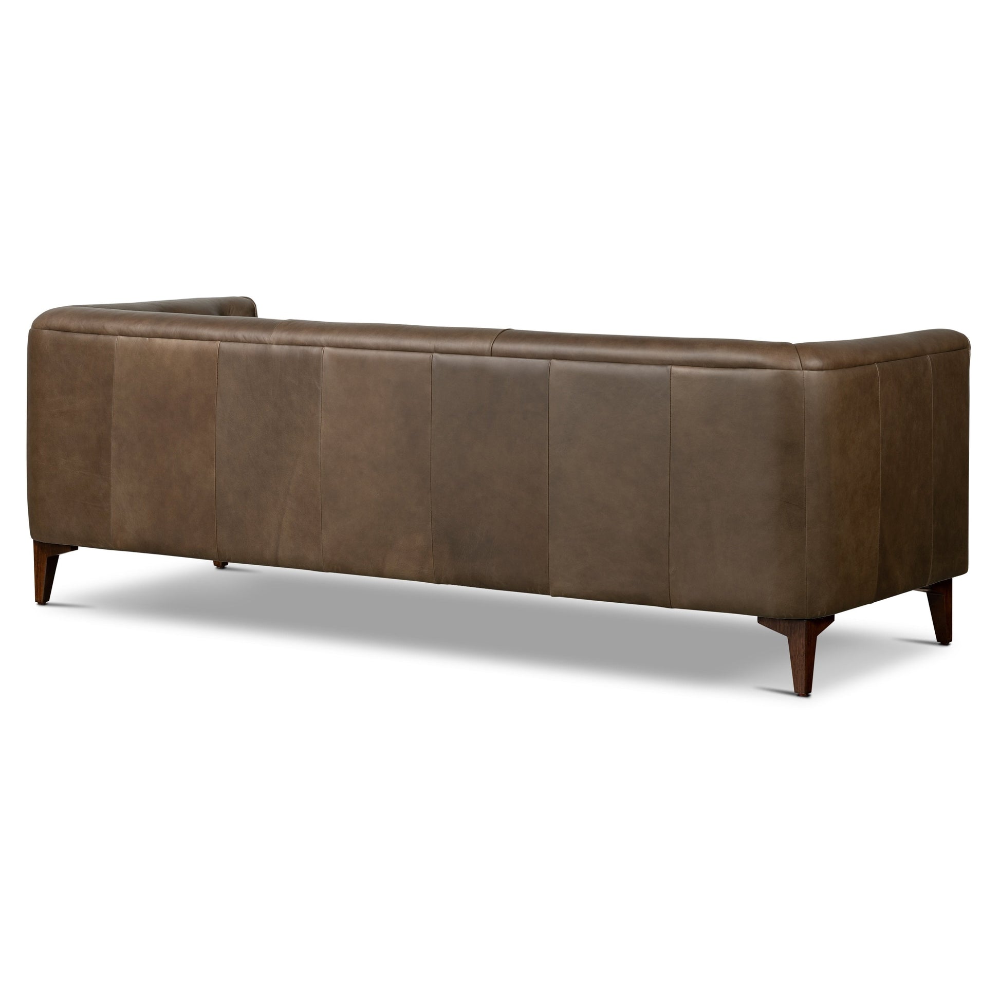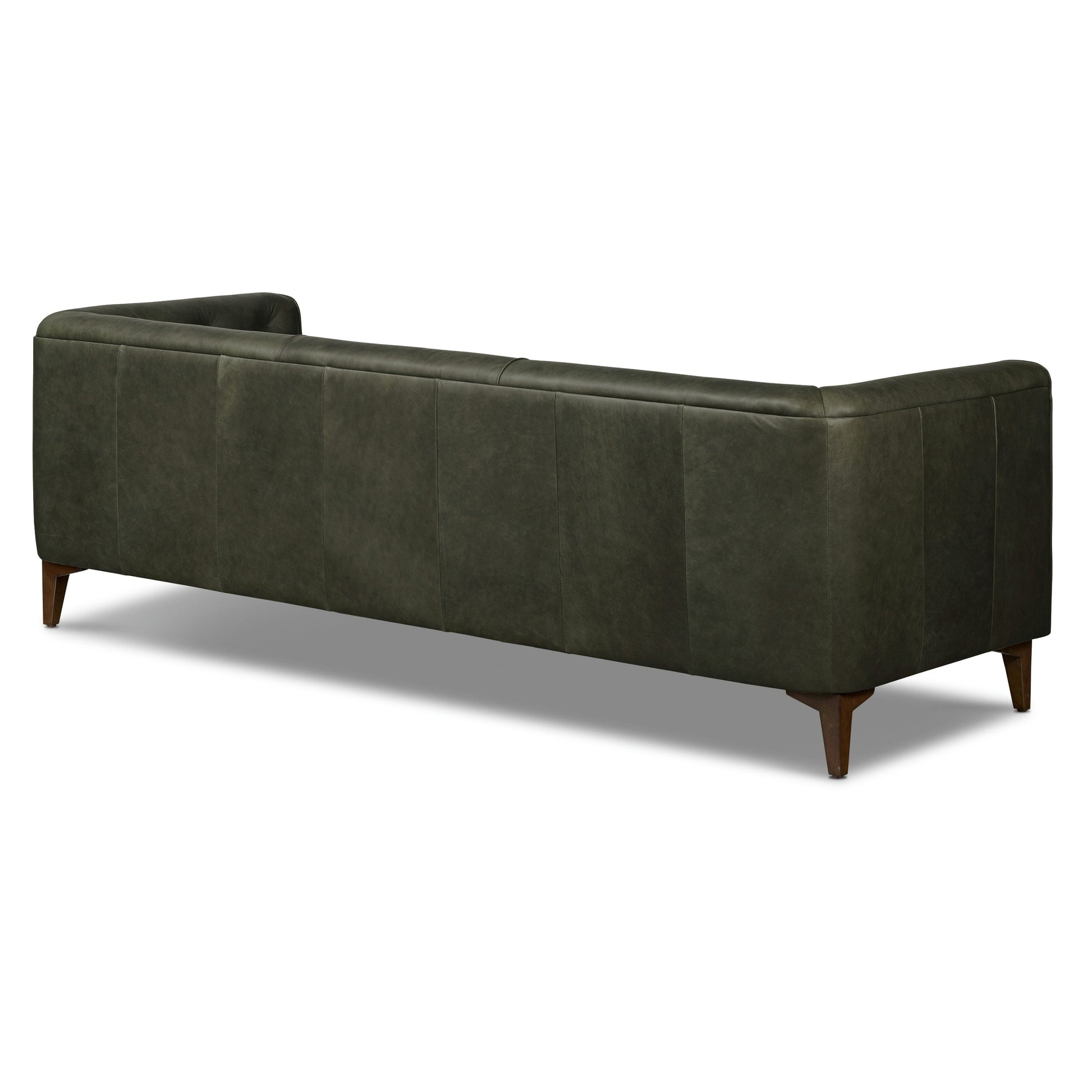 Realizzato con un omaggio alle silhouette vintage, il divano Essex dona un tocco di stile signorile al vostro soggiorno o studio con un ricco rivestimento in pelle pieno fiore conciata all'anilina pura (cognac, cacao) o semi-anilina (tutti gli altri colori). Il rivestimento in pelle conciata all'anilina pura, tinta all'anilina, enfatizza la bellezza naturale di ogni pelle, conferendo un aspetto unico a ogni pezzo. Con una lavorazione minima, le pelli all'anilina mostrano con orgoglio i tratti distintivi naturali della vera pelle, come rughe, segni di crescita, cicatrici rimarginate, punture di insetti e graffi. Simile al marmo o a un bellissimo pezzo di legno, ogni pelle varia nella tonalità e nel motivo e cambia, si macchia e si macchia, ammorbidendosi nella sua ricca patina con il tempo. Uno schienale trapuntato a rombi si estende su cuscini morbidi ed estremamente comodi, dotati di interni in piuma d'anatra, per un'esperienza di seduta all'altezza del look raffinato di questo divano. Le gambe affusolate in legno massello con finitura mogano aggiungono un tocco sartoriale a questo classico moderno.