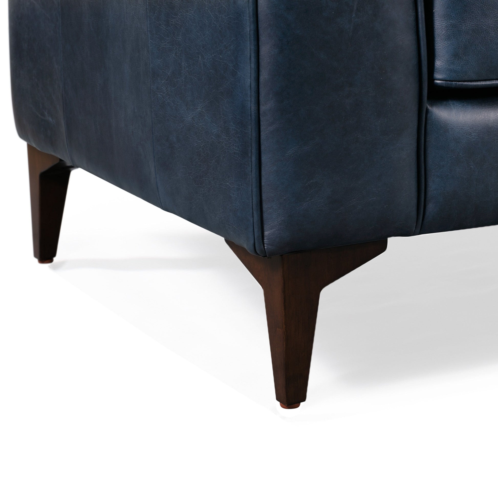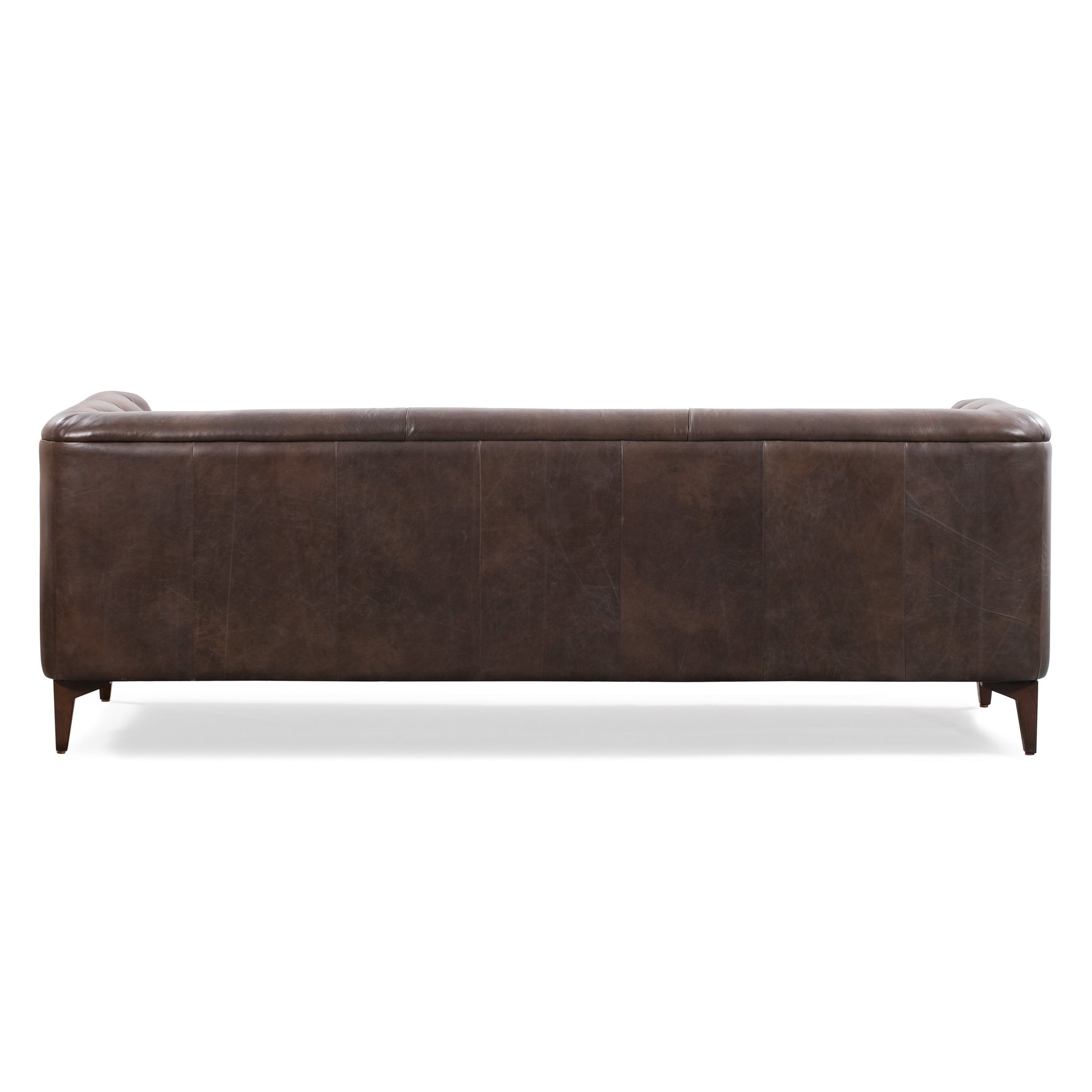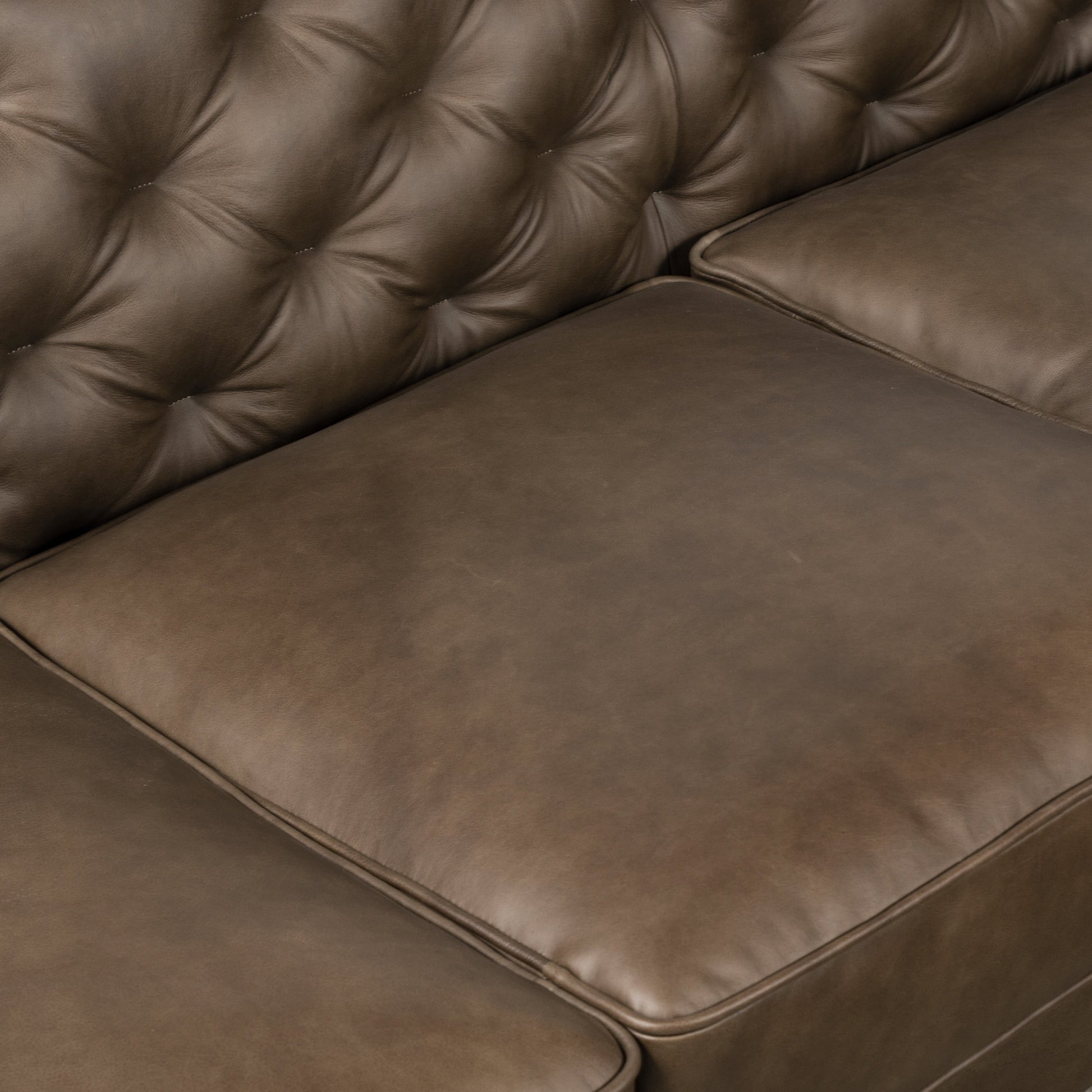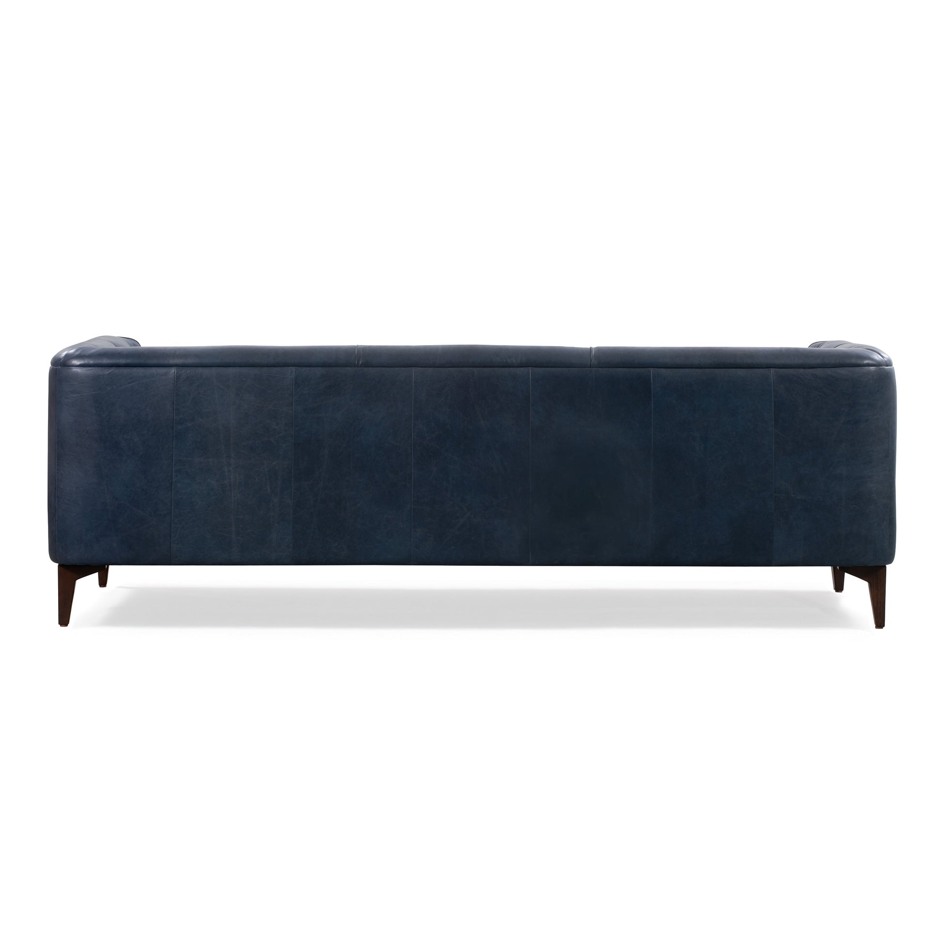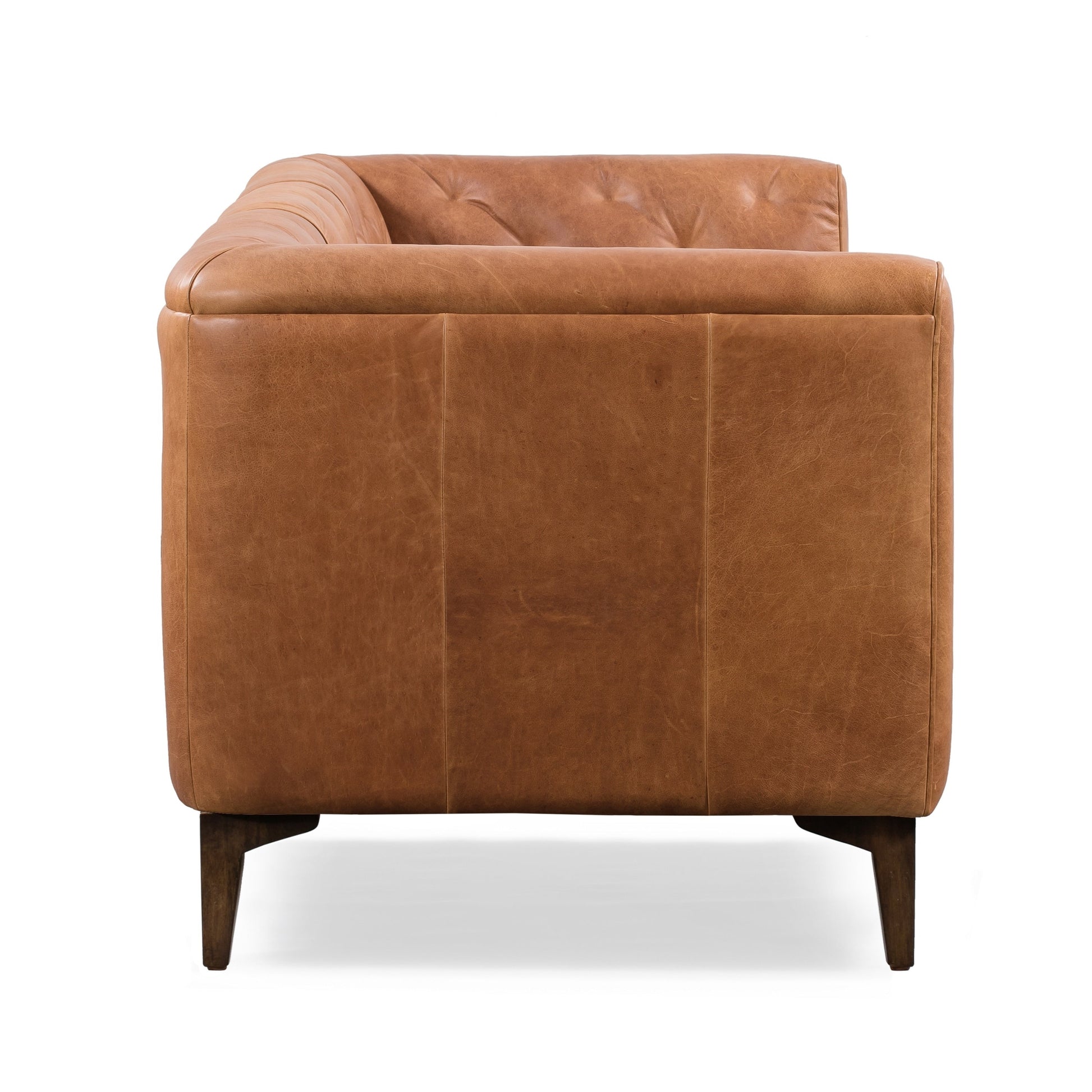 Realizzato con un omaggio alle silhouette vintage, il divano Essex dona un tocco di stile signorile al vostro soggiorno o studio con un ricco rivestimento in pelle pieno fiore conciata all'anilina pura (cognac, cacao) o semi-anilina (tutti gli altri colori). Il rivestimento in pelle conciata all'anilina pura, tinta all'anilina, enfatizza la bellezza naturale di ogni pelle, conferendo un aspetto unico a ogni pezzo. Con una lavorazione minima, le pelli all'anilina mostrano con orgoglio i tratti distintivi naturali della vera pelle, come rughe, segni di crescita, cicatrici rimarginate, punture di insetti e graffi. Simile al marmo o a un bellissimo pezzo di legno, ogni pelle varia nella tonalità e nel motivo e cambia, si macchia e si macchia, ammorbidendosi nella sua ricca patina con il tempo. Uno schienale trapuntato a rombi si estende su cuscini morbidi ed estremamente comodi, dotati di interni in piuma d'anatra, per un'esperienza di seduta all'altezza del look raffinato di questo divano. Le gambe affusolate in legno massello con finitura mogano aggiungono un tocco sartoriale a questo classico moderno.