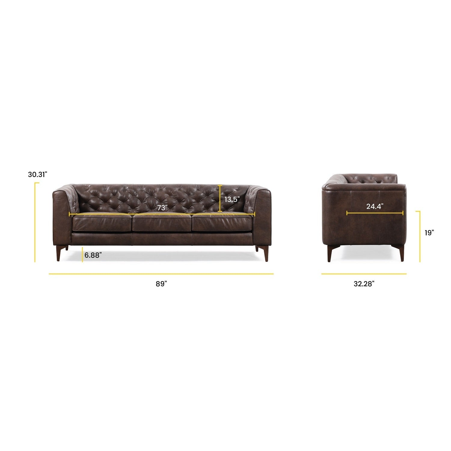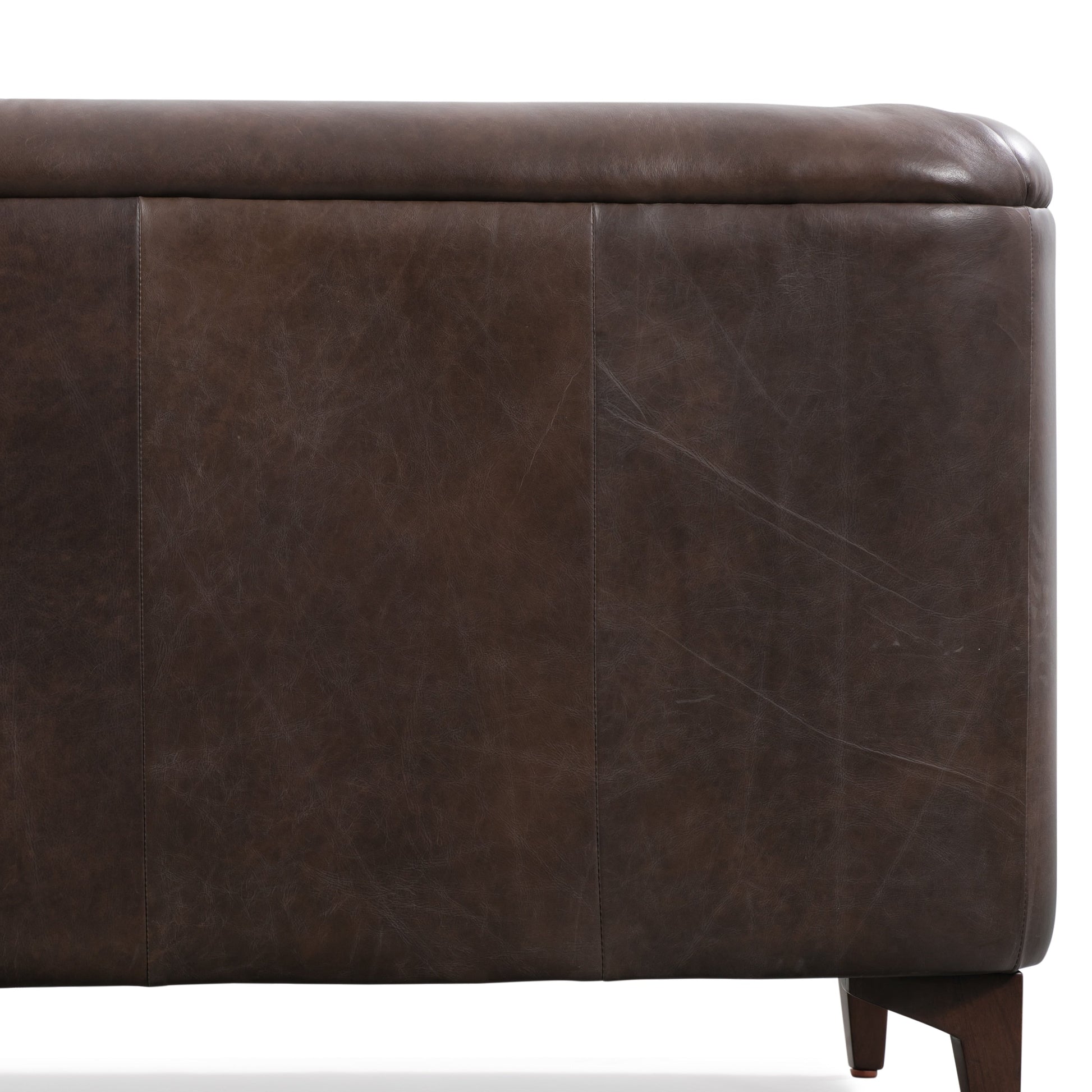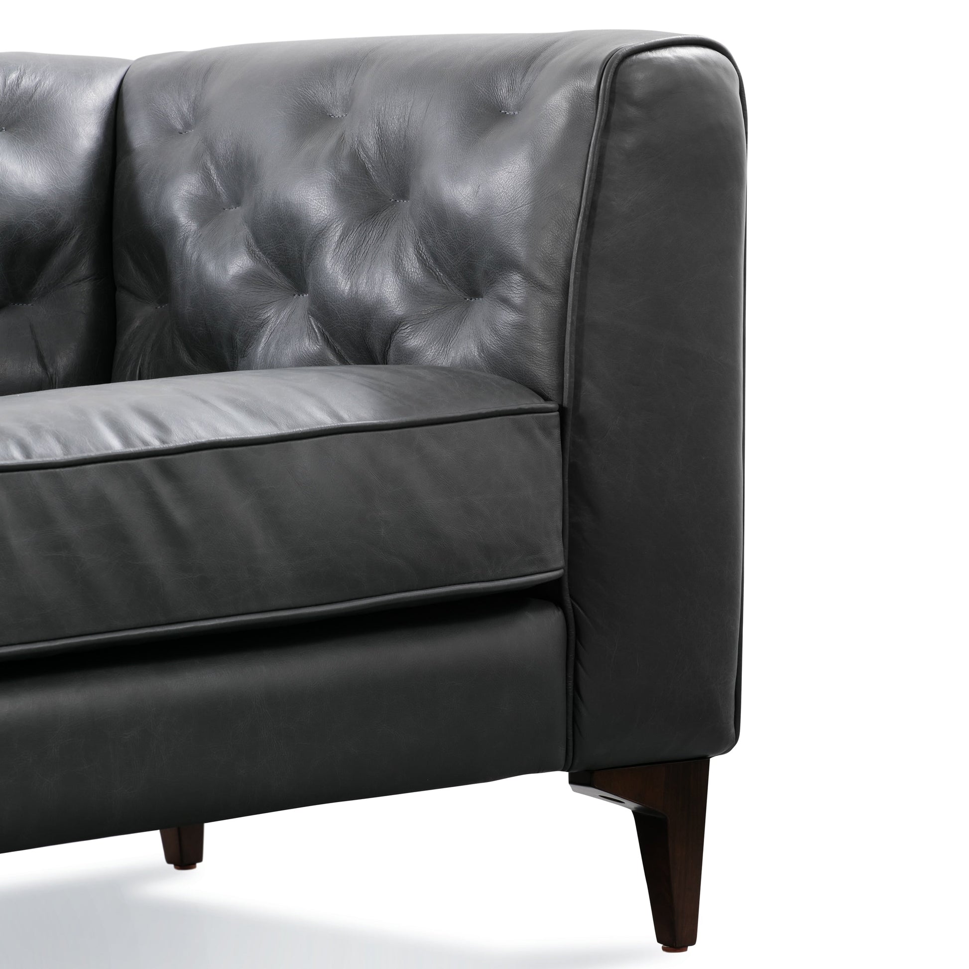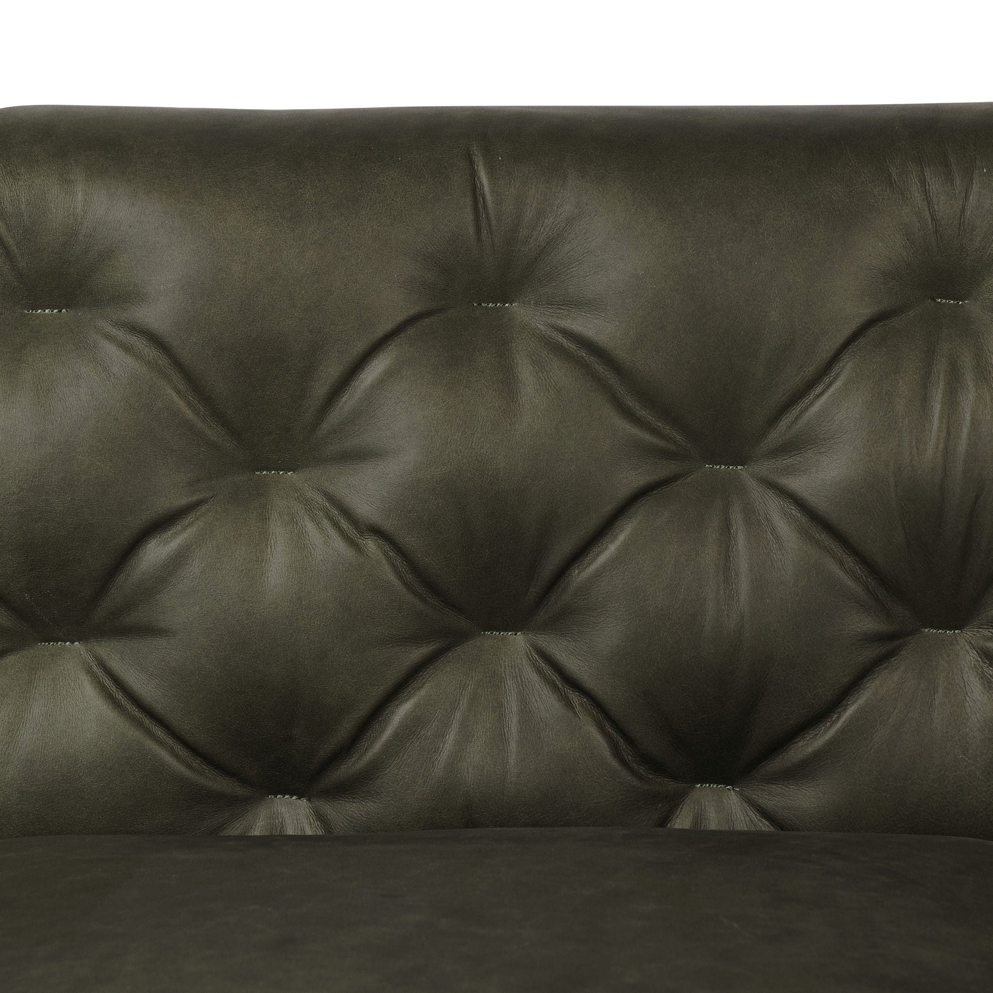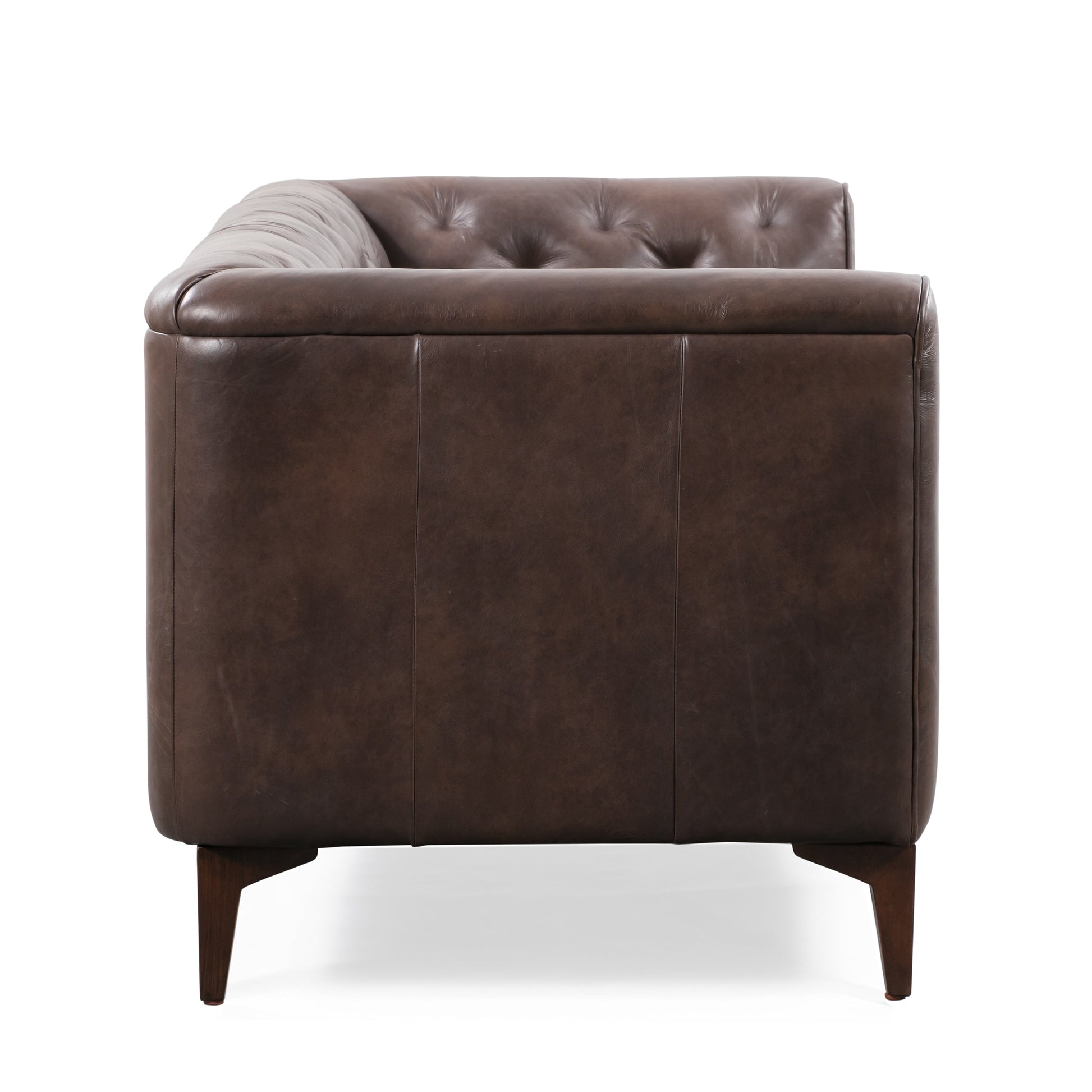 Realizzato con un omaggio alle silhouette vintage, il divano Essex dona un tocco di stile signorile al vostro soggiorno o studio con un ricco rivestimento in pelle pieno fiore conciata all'anilina pura (cognac, cacao) o semi-anilina (tutti gli altri colori). Il rivestimento in pelle conciata all'anilina pura, tinta all'anilina, enfatizza la bellezza naturale di ogni pelle, conferendo un aspetto unico a ogni pezzo. Con una lavorazione minima, le pelli all'anilina mostrano con orgoglio i tratti distintivi naturali della vera pelle, come rughe, segni di crescita, cicatrici rimarginate, punture di insetti e graffi. Simile al marmo o a un bellissimo pezzo di legno, ogni pelle varia nella tonalità e nel motivo e cambia, si macchia e si macchia, ammorbidendosi nella sua ricca patina con il tempo. Uno schienale trapuntato a rombi si estende su cuscini morbidi ed estremamente comodi, dotati di interni in piuma d'anatra, per un'esperienza di seduta all'altezza del look raffinato di questo divano. Le gambe affusolate in legno massello con finitura mogano aggiungono un tocco sartoriale a questo classico moderno.