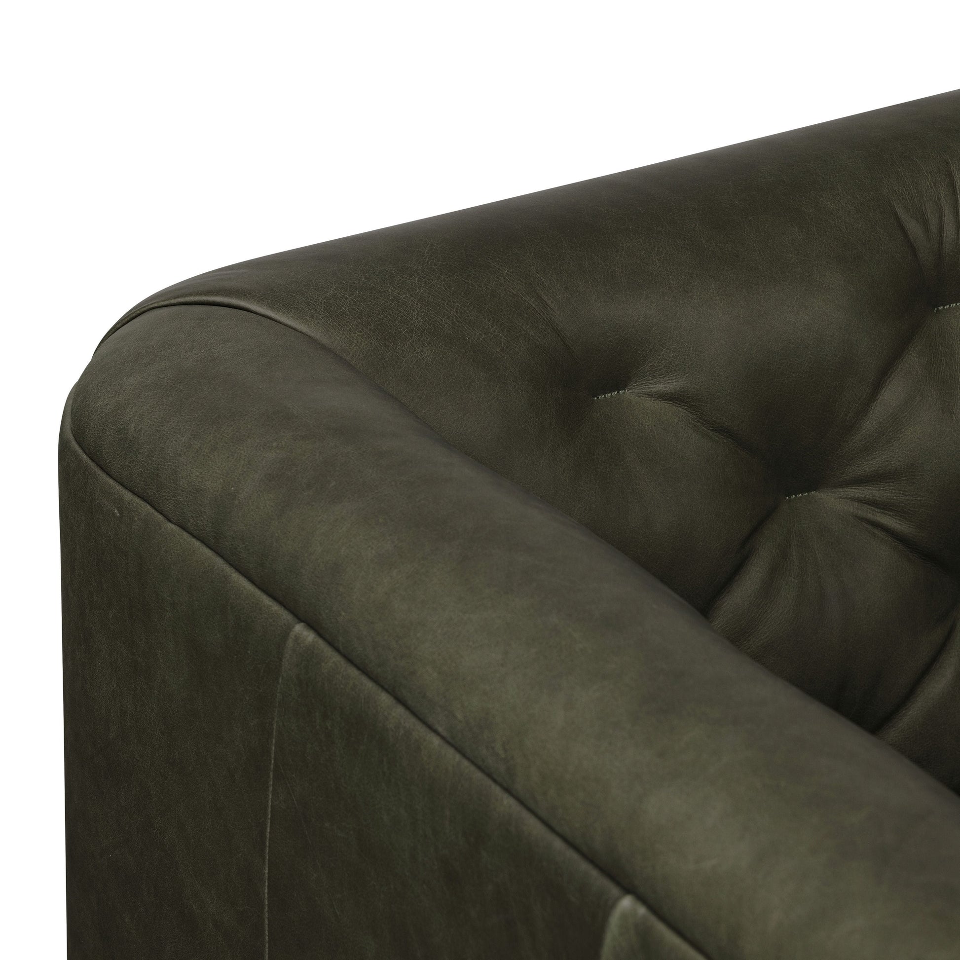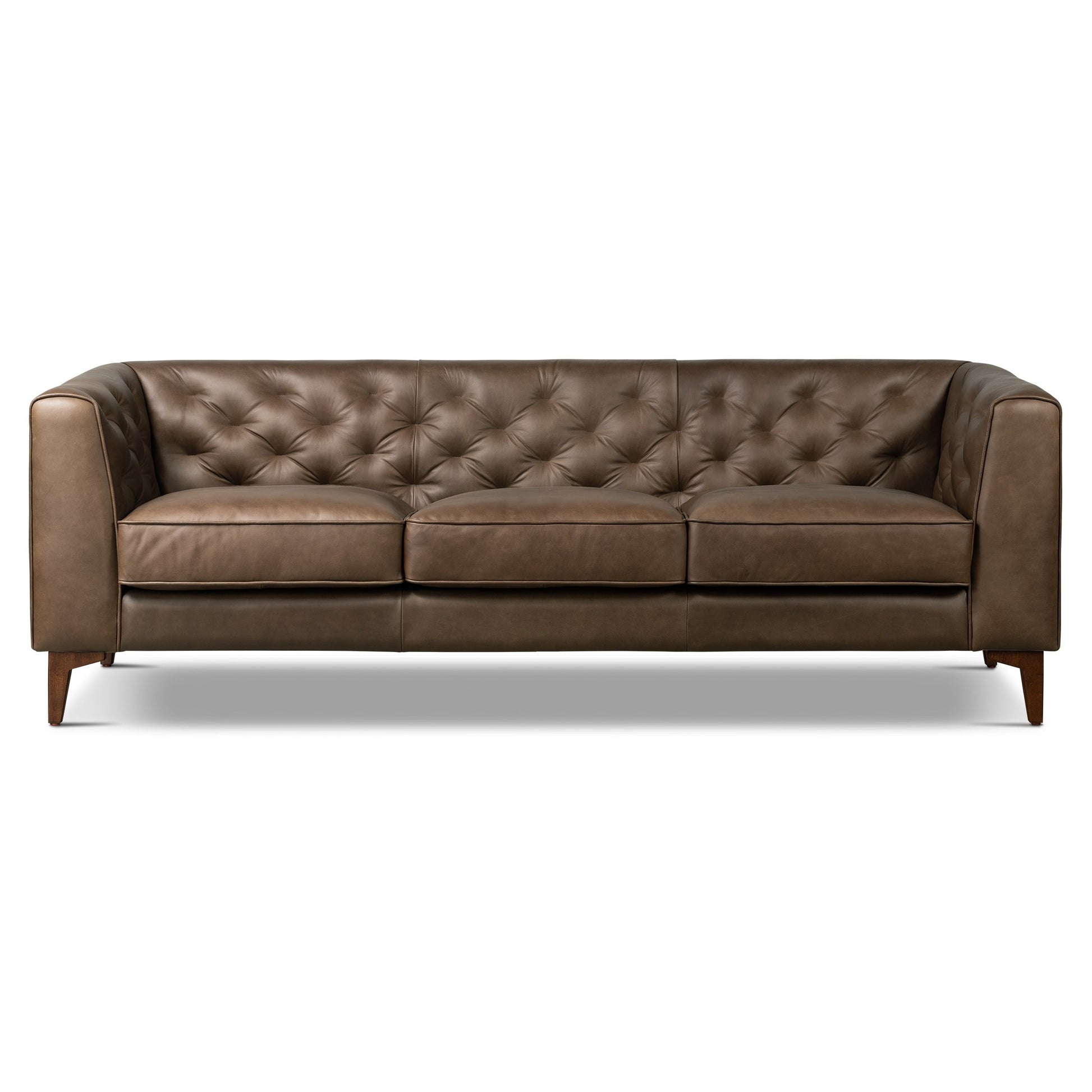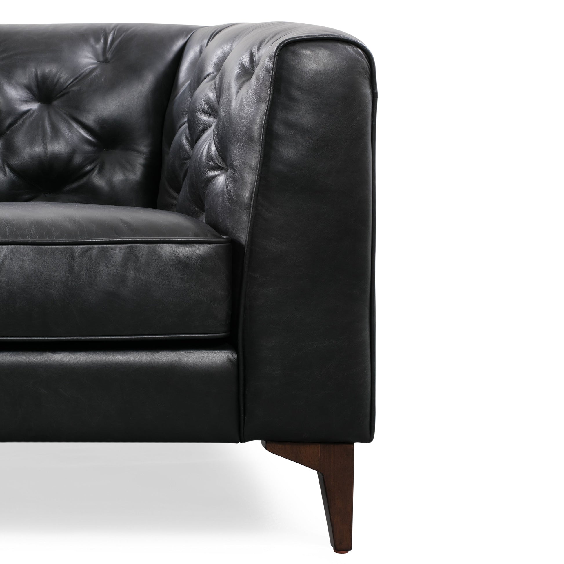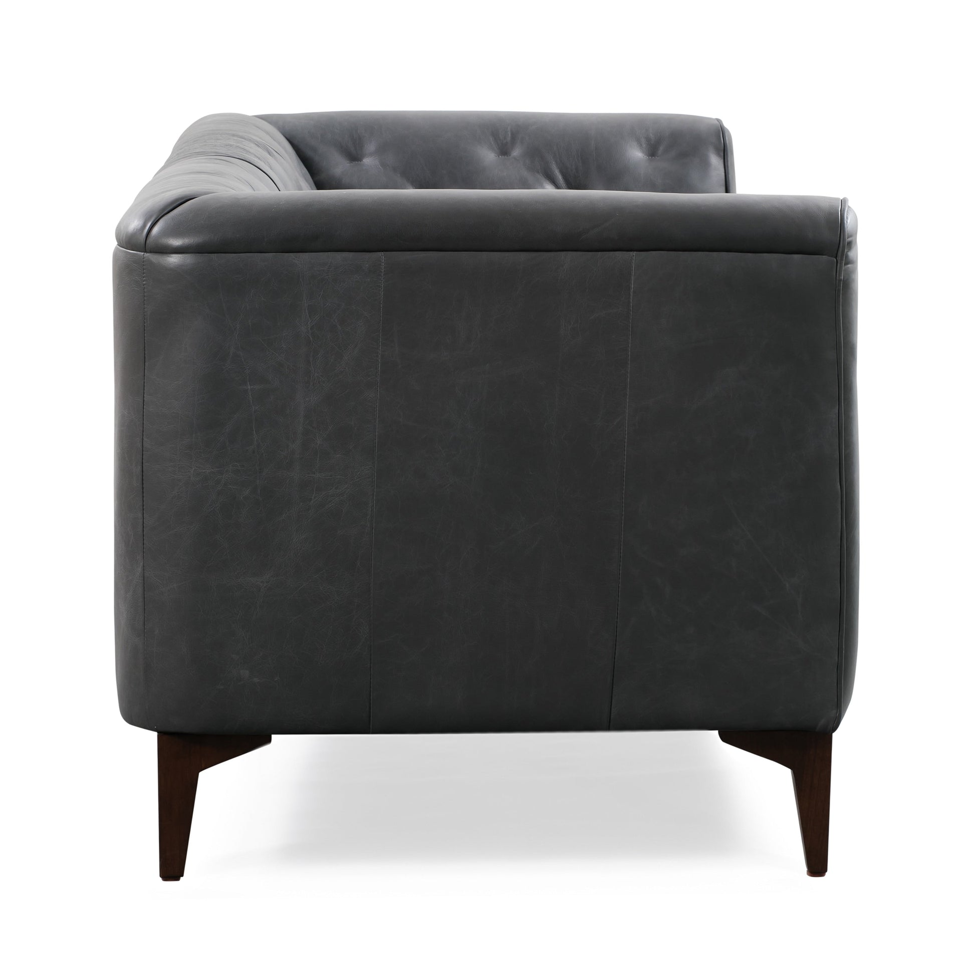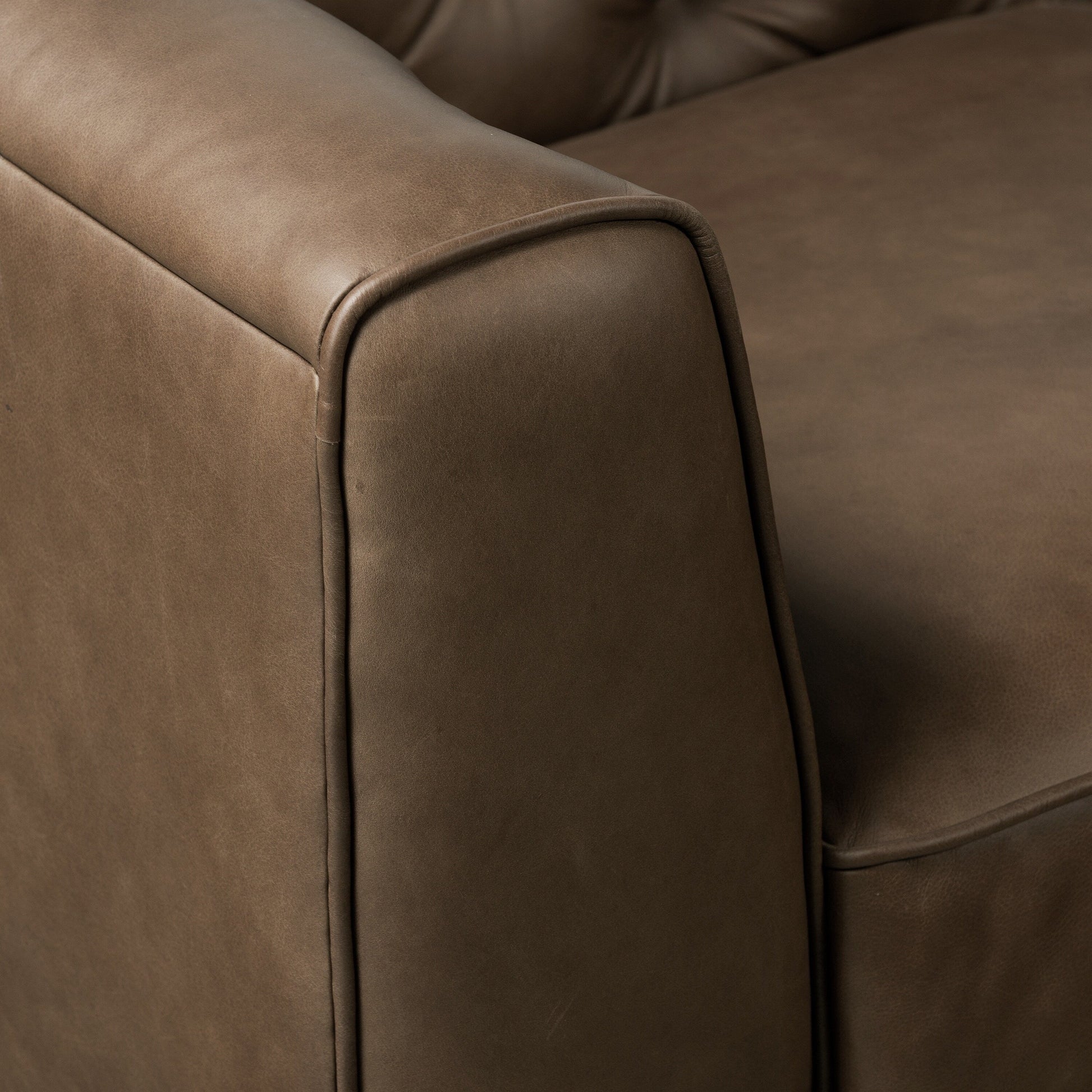 Realizzato con un omaggio alle silhouette vintage, il divano Essex dona un tocco di stile signorile al vostro soggiorno o studio con un ricco rivestimento in pelle pieno fiore conciata all'anilina pura (cognac, cacao) o semi-anilina (tutti gli altri colori). Il rivestimento in pelle conciata all'anilina pura, tinta all'anilina, enfatizza la bellezza naturale di ogni pelle, conferendo un aspetto unico a ogni pezzo. Con una lavorazione minima, le pelli all'anilina mostrano con orgoglio i tratti distintivi naturali della vera pelle, come rughe, segni di crescita, cicatrici rimarginate, punture di insetti e graffi. Simile al marmo o a un bellissimo pezzo di legno, ogni pelle varia nella tonalità e nel motivo e cambia, si macchia e si macchia, ammorbidendosi nella sua ricca patina con il tempo. Uno schienale trapuntato a rombi si estende su cuscini morbidi ed estremamente comodi, dotati di interni in piuma d'anatra, per un'esperienza di seduta all'altezza del look raffinato di questo divano. Le gambe affusolate in legno massello con finitura mogano aggiungono un tocco sartoriale a questo classico moderno.