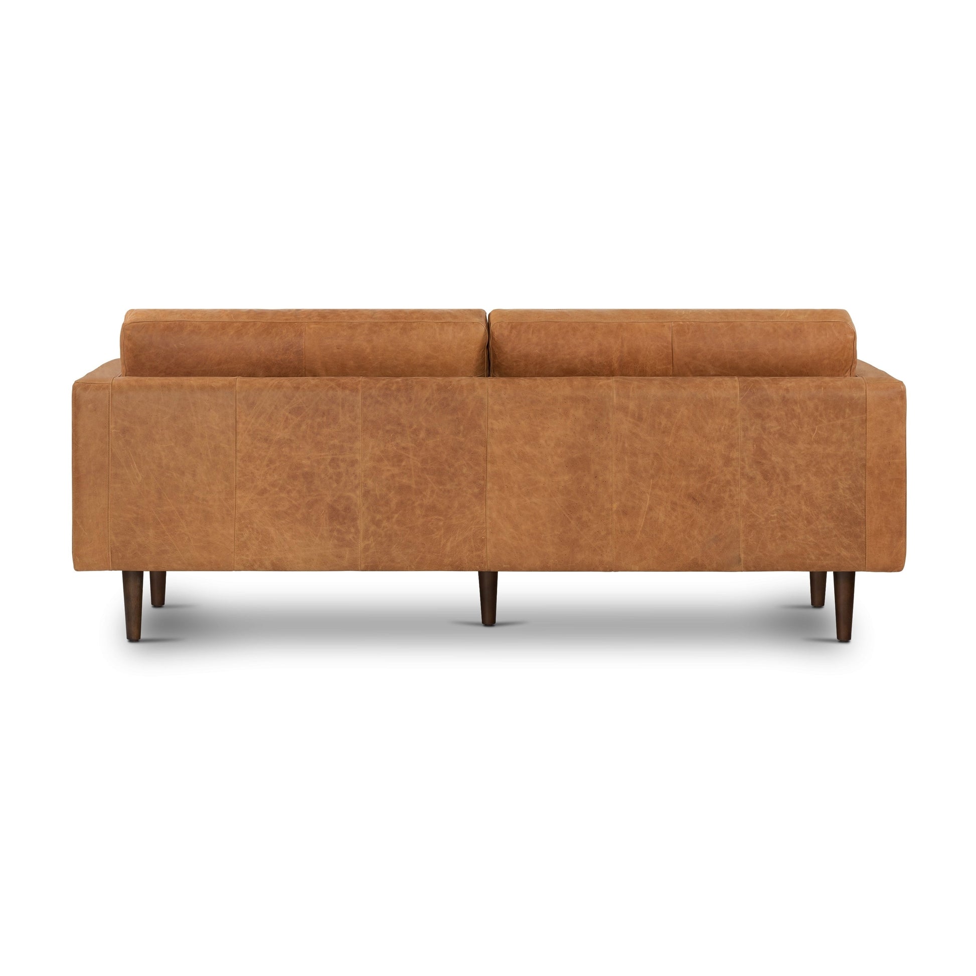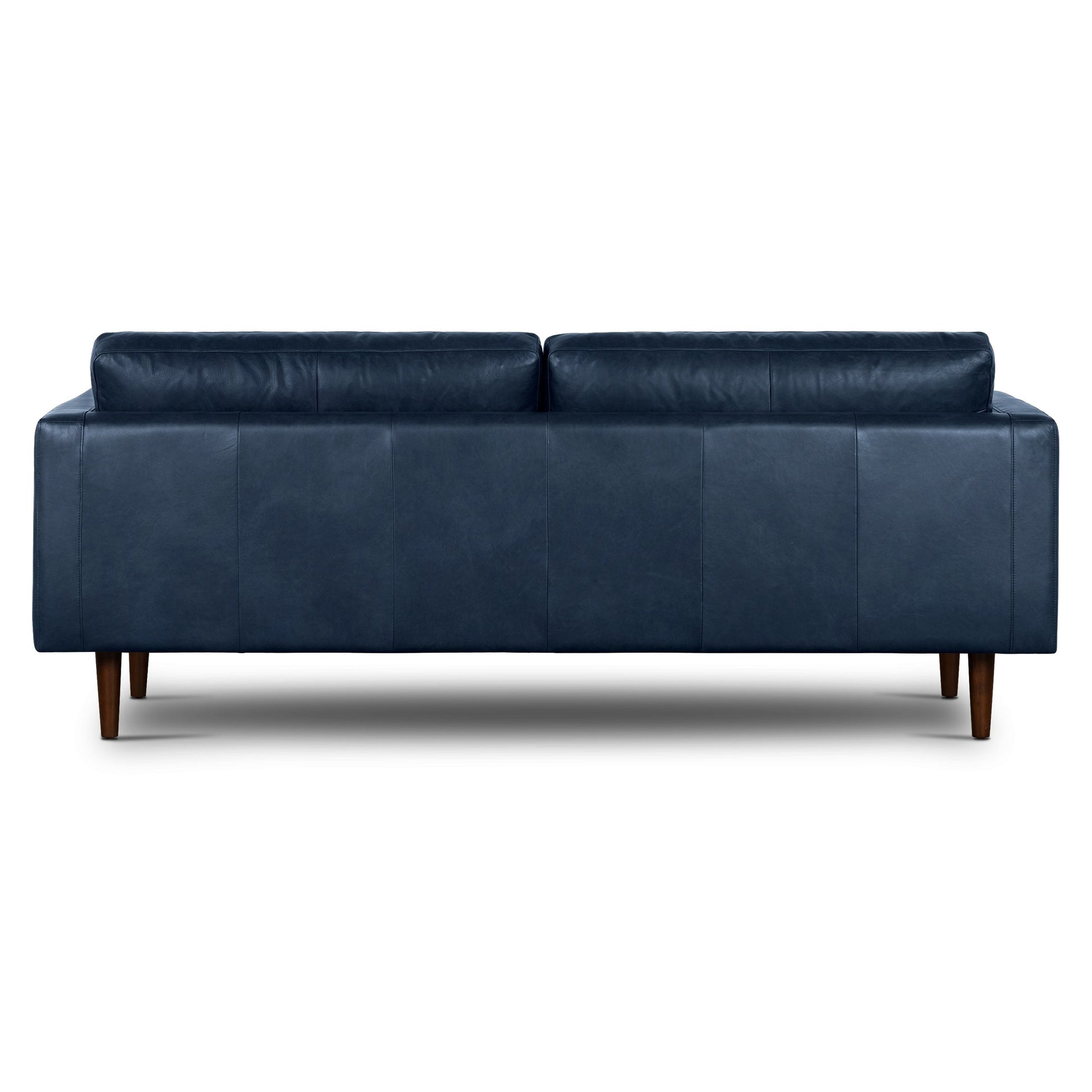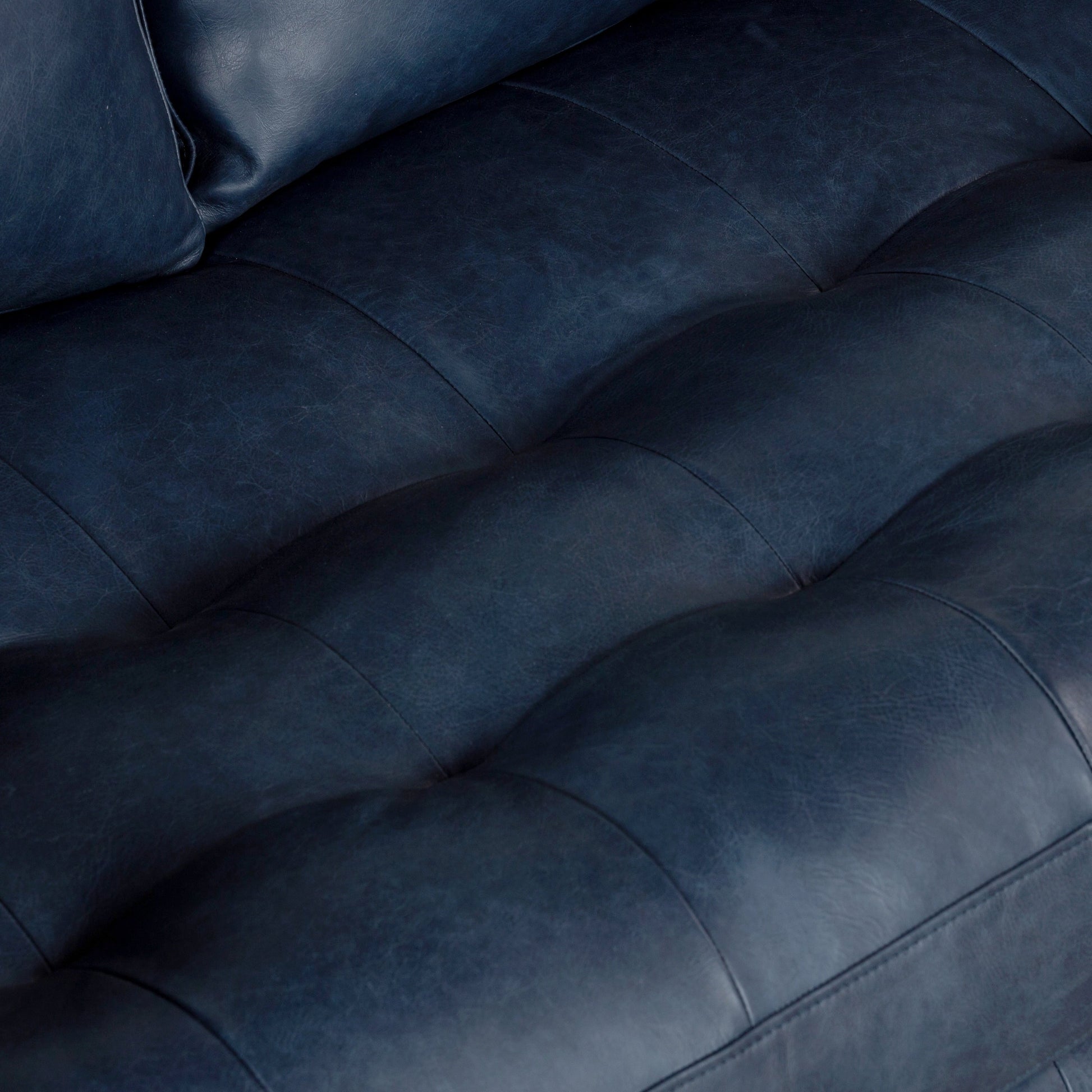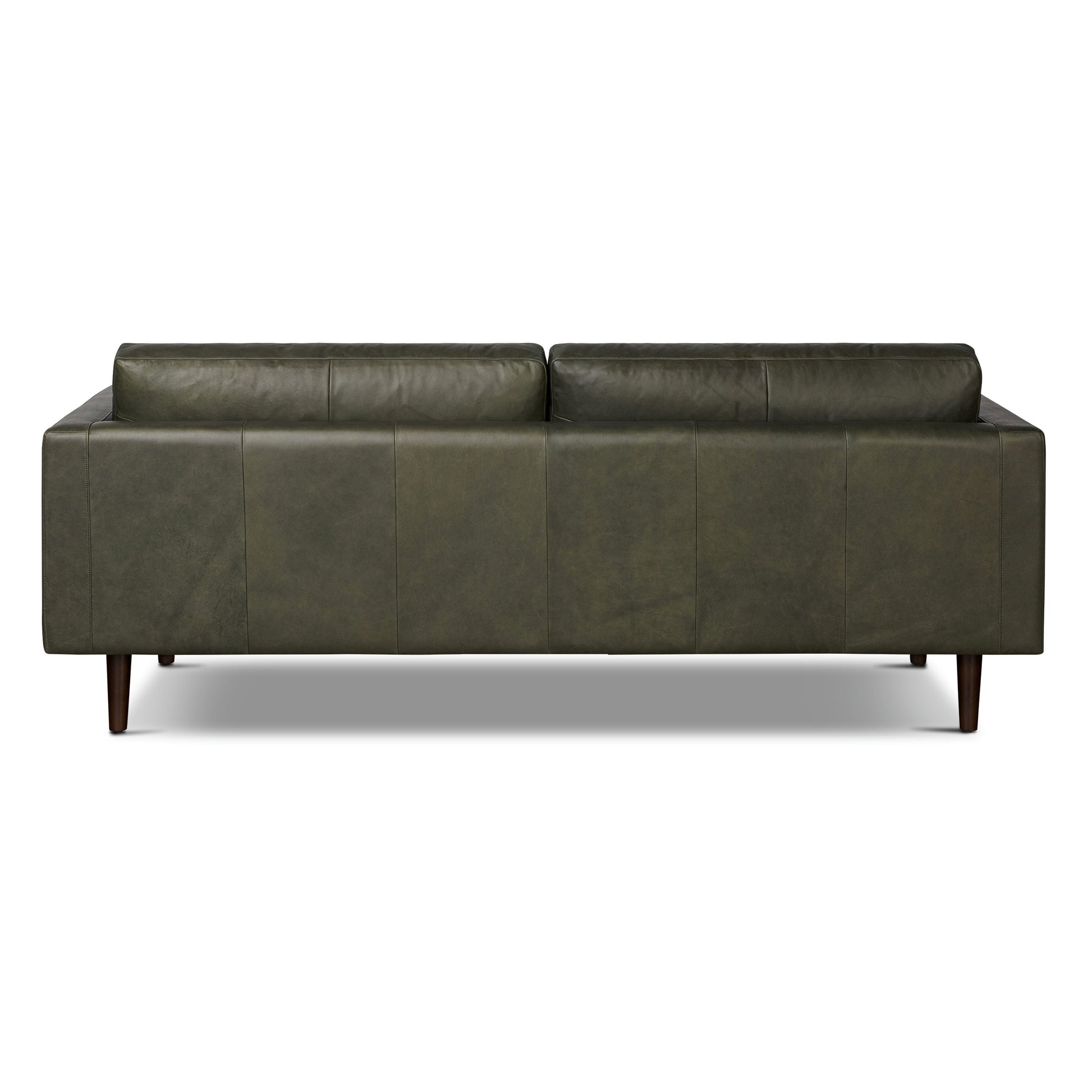Immergetevi nella morbidezza e nello stile di questo divano in pelle Napa pieno fiore, in pura anilina (cognac, cacao) o semi-anilina (tutti gli altri colori). Splendido in un raffinato living, il colore Cognac presenta un rivestimento in pelle conciata all'anilina pura davvero straordinario, che enfatizza la bellezza naturale di ogni pelle, conferendo un aspetto unico a ogni pezzo. Con una lavorazione minima, le pelli all'anilina mostrano con orgoglio i tratti distintivi naturali della vera pelle, come rughe, segni di crescita, cicatrici rimarginate, punture di insetti e graffi. Simile al marmo o a un bel pezzo di legno, ogni pelle varia nella tonalità e nel motivo e cambia, si macchia e si macchia, ammorbidendosi nella sua ricca patina con il tempo. Una struttura in legno massello essiccato in forno è dotata di angoli rinforzati per una durevolezza duratura. Le cinghie Pirelli a sostegno di seduta e schienale offrono a questo divano il miglior supporto possibile. Un unico lungo cuscino di seduta è realizzato in schiuma ad alta densità con imbottitura in poliestere per un ampio supporto, mentre un topper in piuma d'anatra garantisce una morbidezza avvolgente. Sono inclusi un paio di cuscini imbottiti, che offrono uno stile classico e un supporto aggiuntivo a seconda delle esigenze.