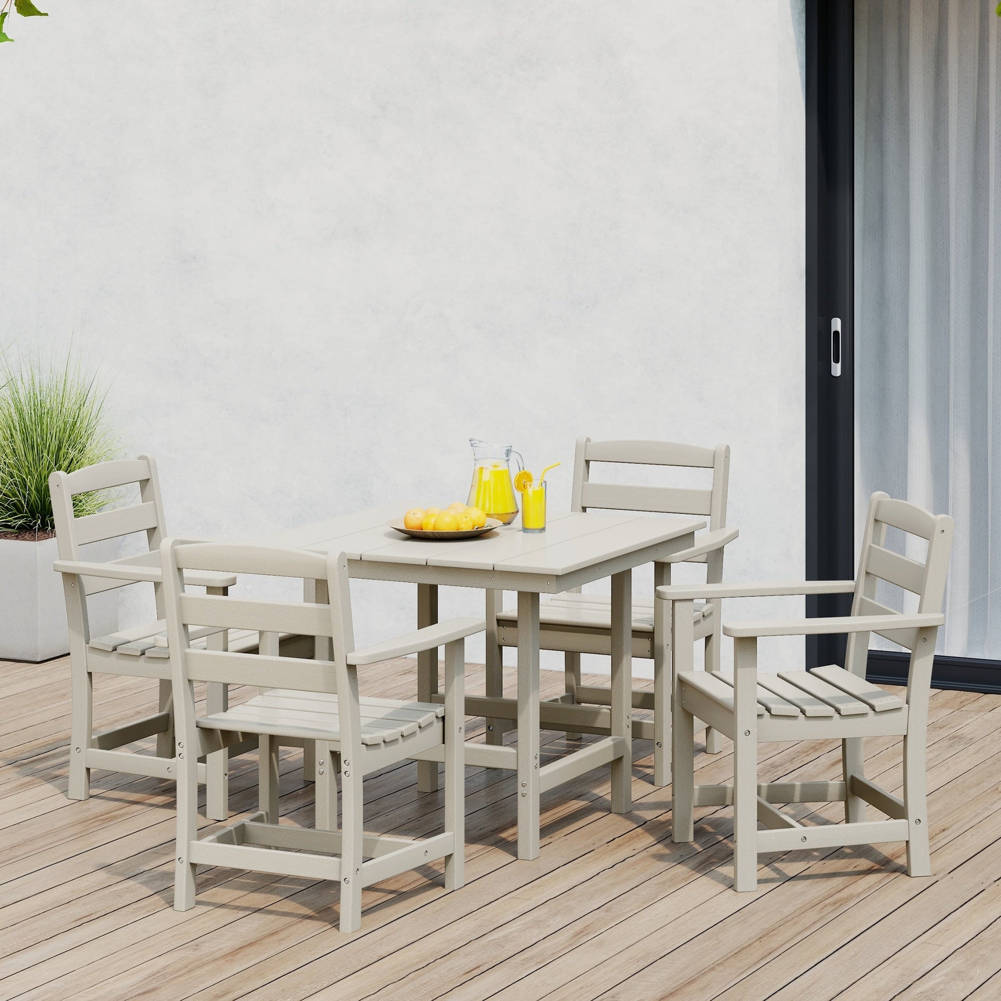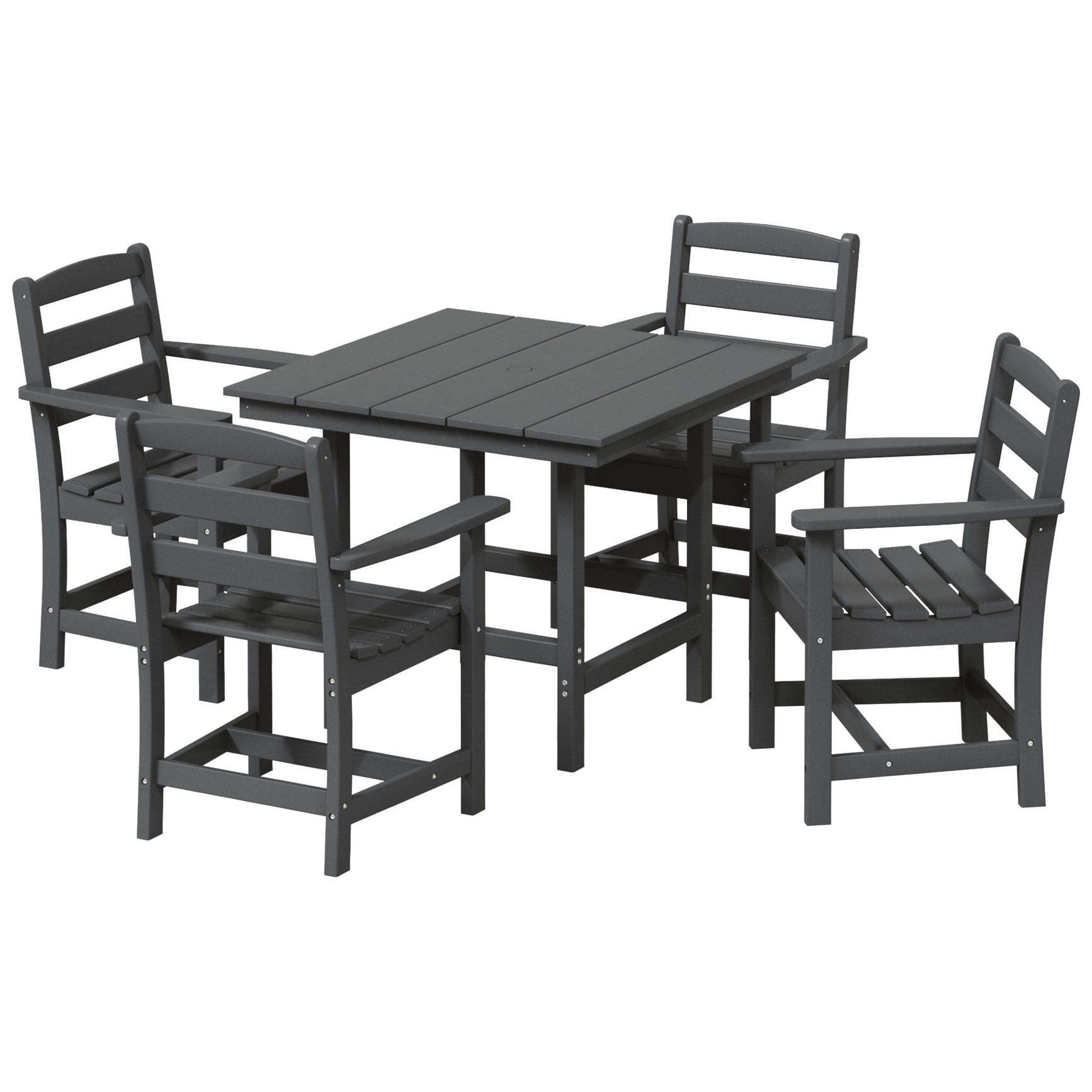 Bevi e mangia con la tua famiglia e i tuoi amici intorno a questo caratteristico set da pranzo da patio in HDPE da 5 pezzi. Realizzato in resistente materiale HDPE resistente alle intemperie, le sue proprietà anti-UV e anti-scolorimento offrono una protezione ideale dagli agenti atmosferici. La struttura stabile e durevole, con il piano del tavolo rinforzato, il foro per ombrellone integrato da 1,9 piedi e la struttura resistente delle gambe della poltrona, garantisce che questo set sia costruito per durare negli anni a venire. Rendi la tua estate l'estate perfetta con questo set da pranzo in HDPE.