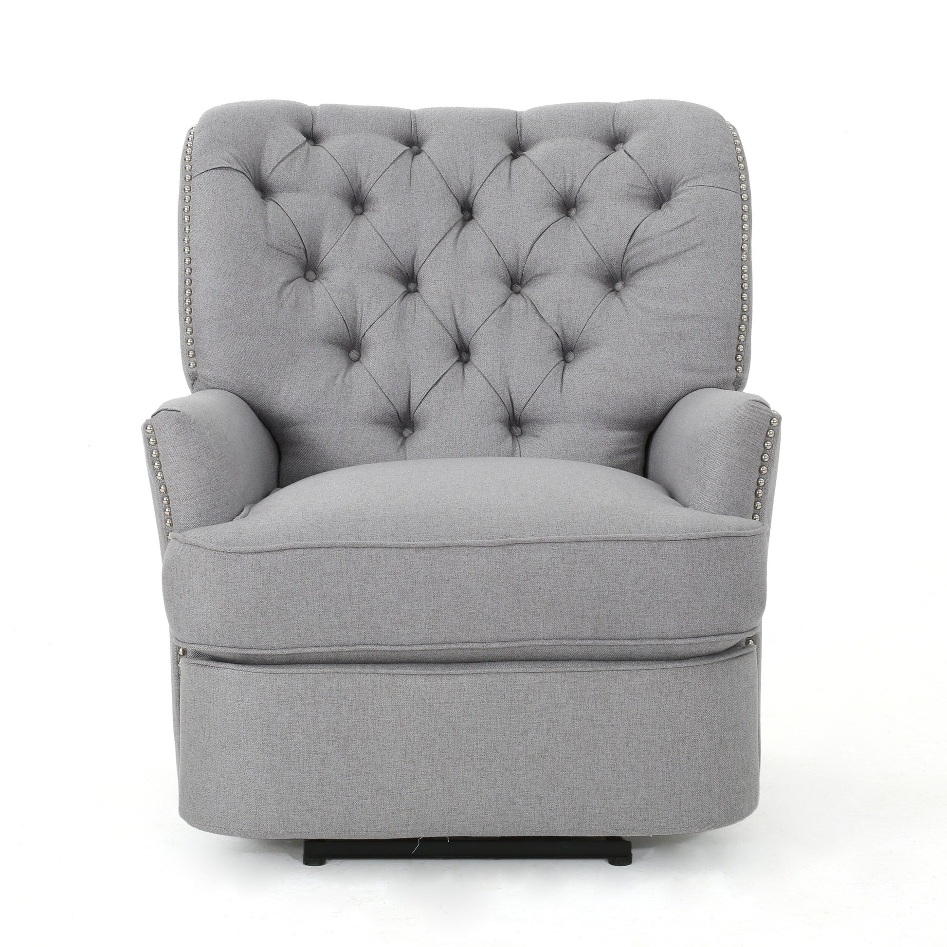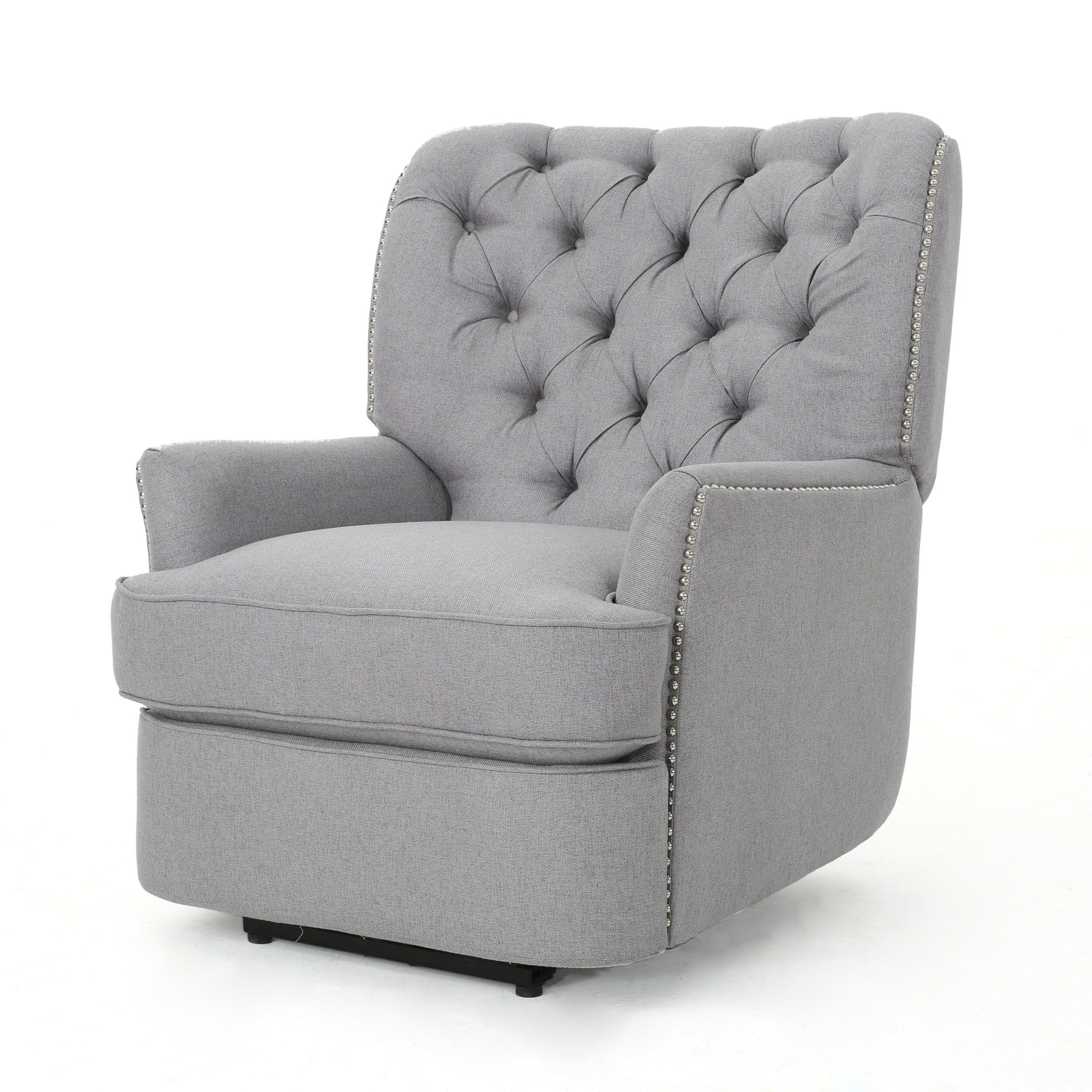 Poltrona reclinabile elettrica, tessuto morbido grigio con bottoni trapuntati, dettagli in rame