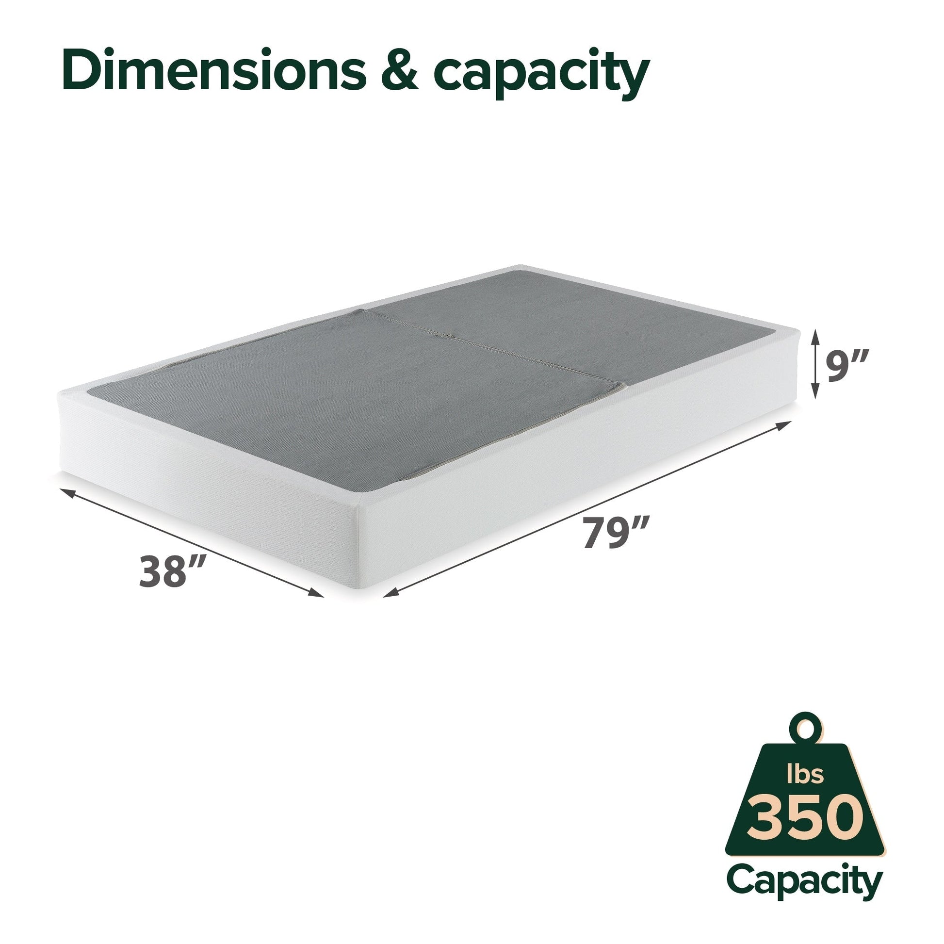 • Twin XL: 9 pollici di spessore x 38 pollici di larghezza x 79 pollici di lunghezza
