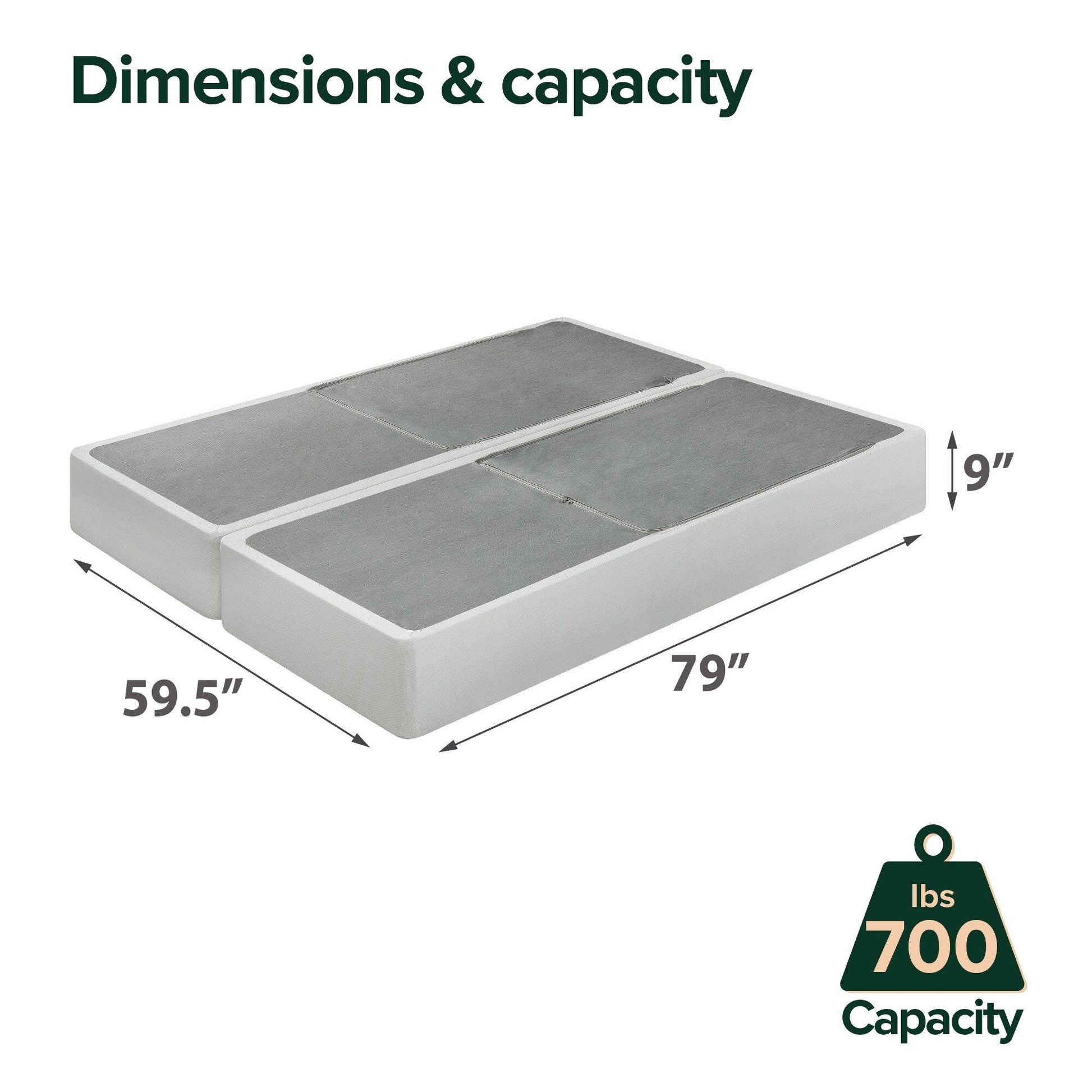 • Split King: 9 pollici di altezza x 75,5 pollici di larghezza x 79 pollici di lunghezza