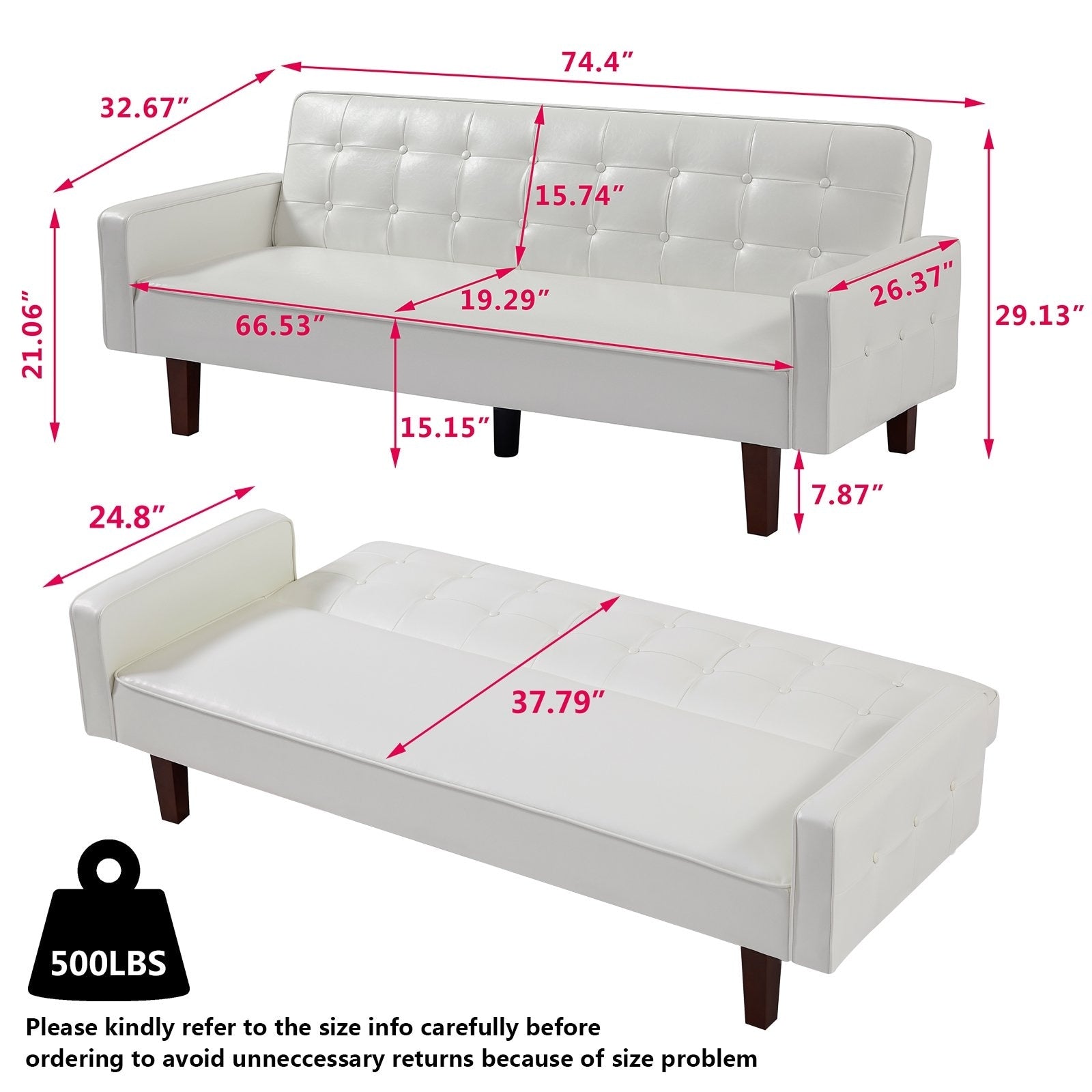 • Divani futon a 3 posti: con una larghezza del cuscino di 67,3 pollici e una larghezza complessiva di 74,4 pollici, questo divano futon rivestito in pelle PU può ospitare comodamente 3 persone di corporatura normale.