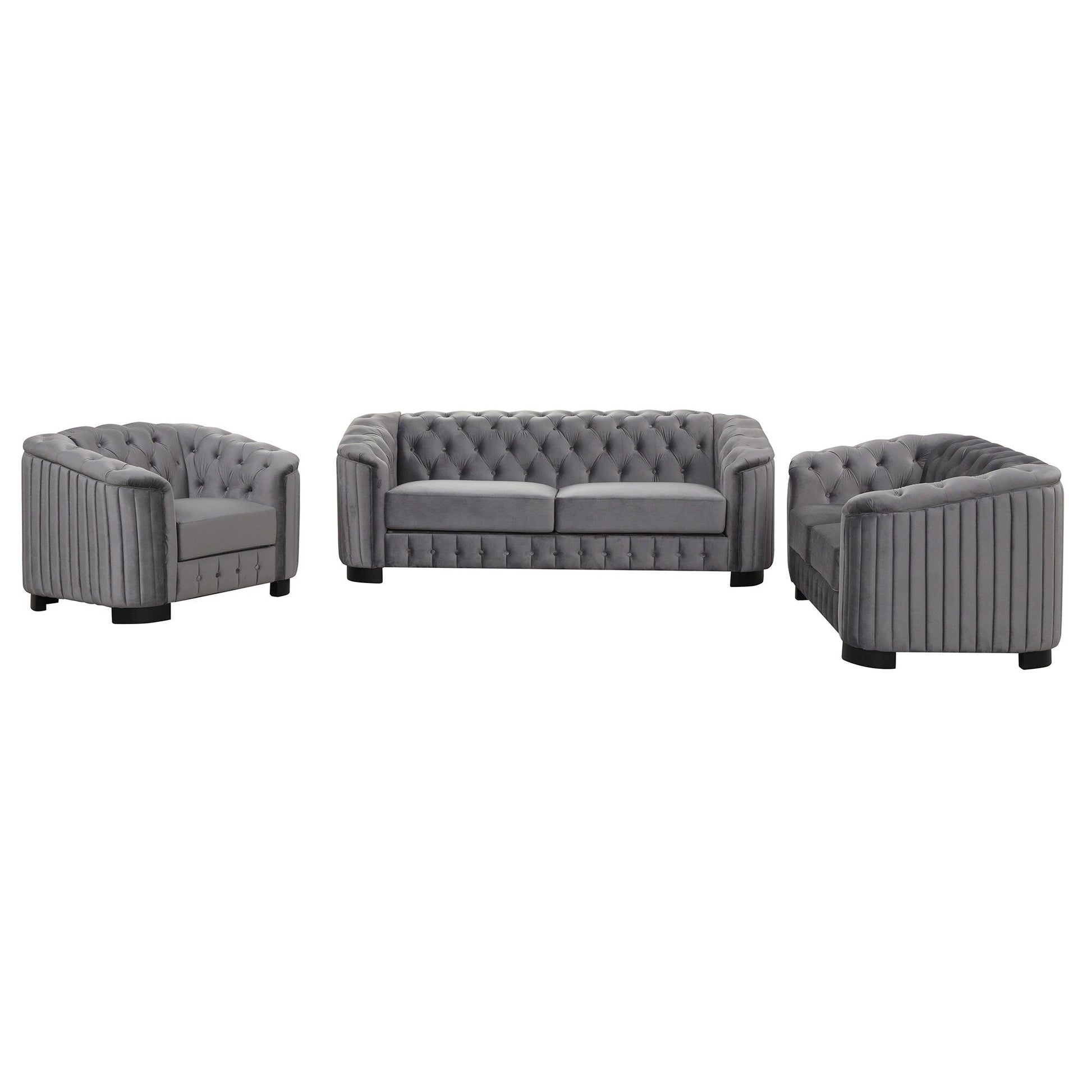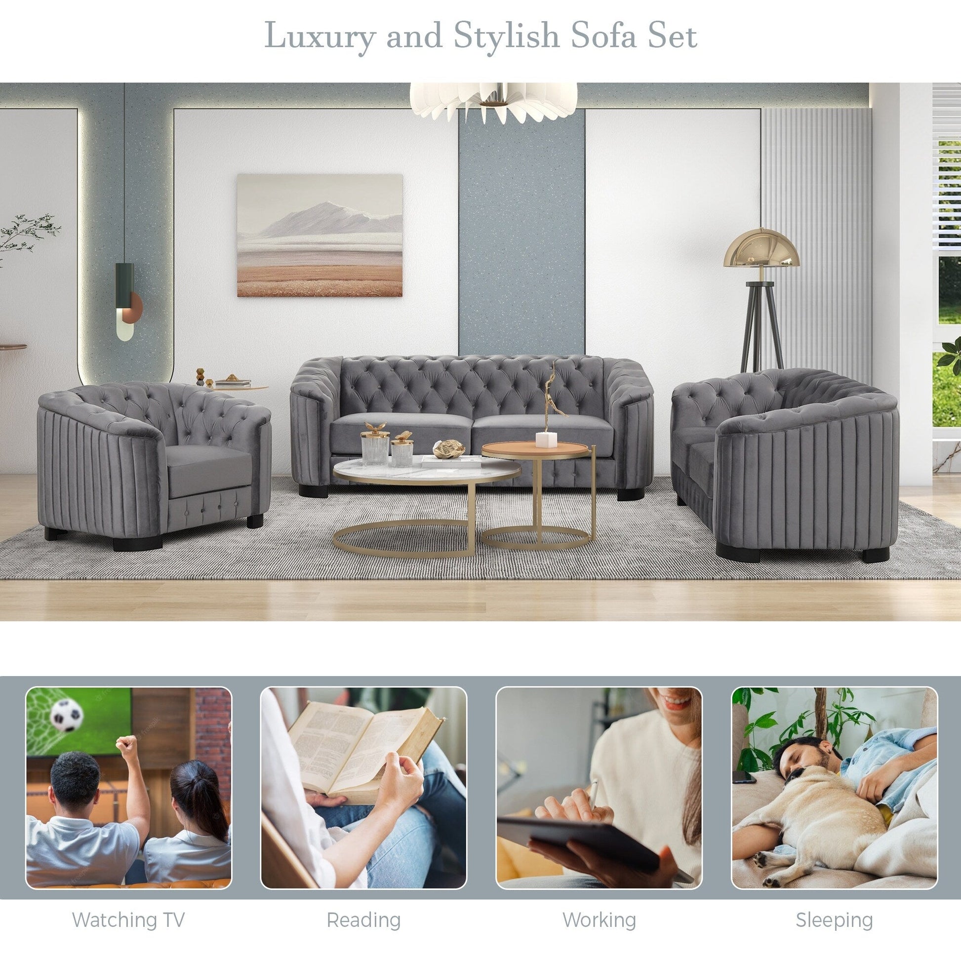 Set di divani moderni in velluto a 3 pezzi Roomfitters con gambe in legno di caucciù, include divano a tre posti, divanetto e poltrona per soggiorno