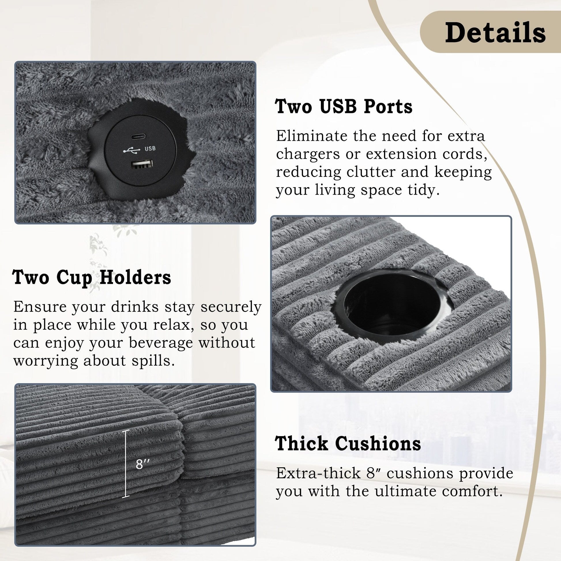 • Porte di ricarica USB: resta connesso grazie alle due porte USB integrate, che ti consentono di caricare comodamente i tuoi dispositivi mentre ti rilassi, senza cavi o ingombri aggiuntivi.