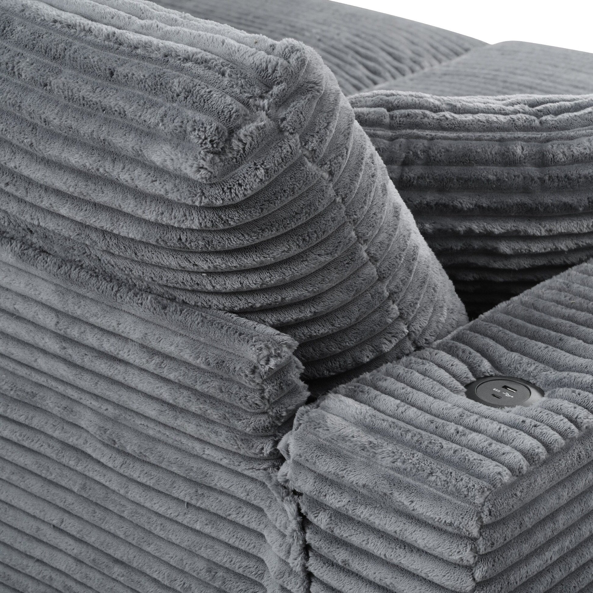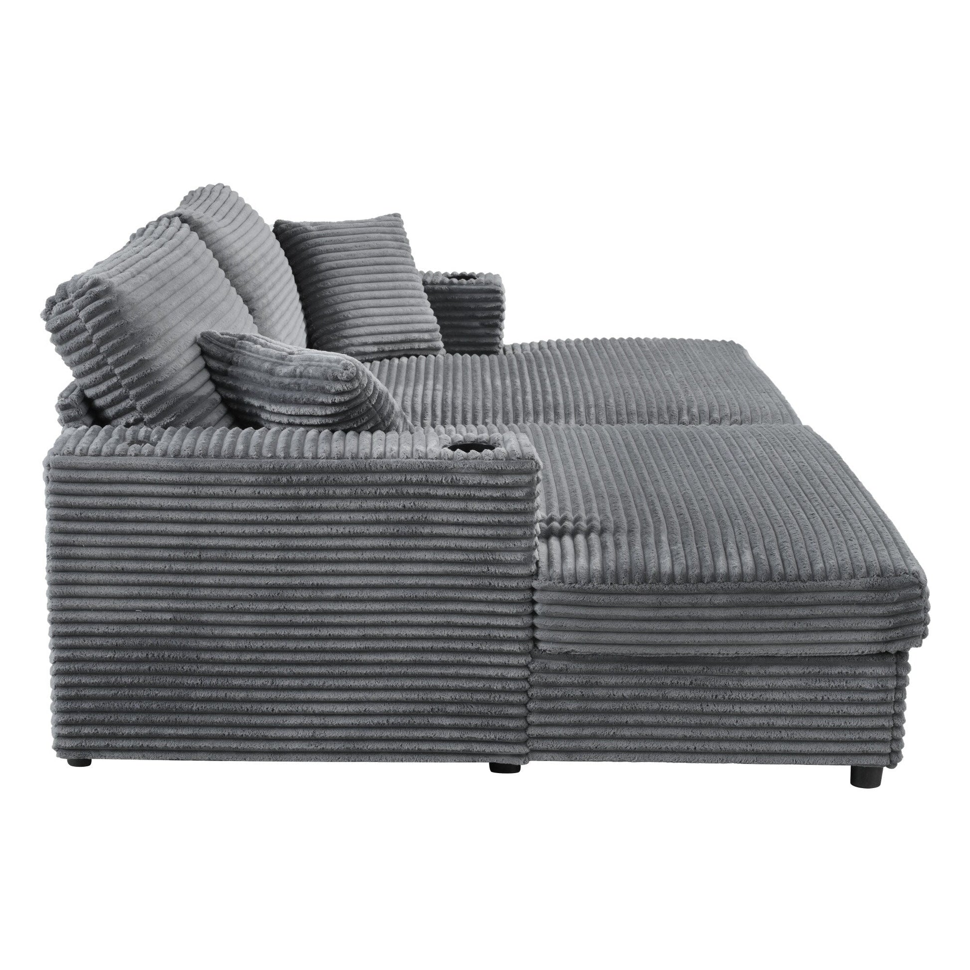 Divano letto componibile con chaise longue oversize Roomfitters, divano letto in velluto a coste con porte USB e portabicchieri