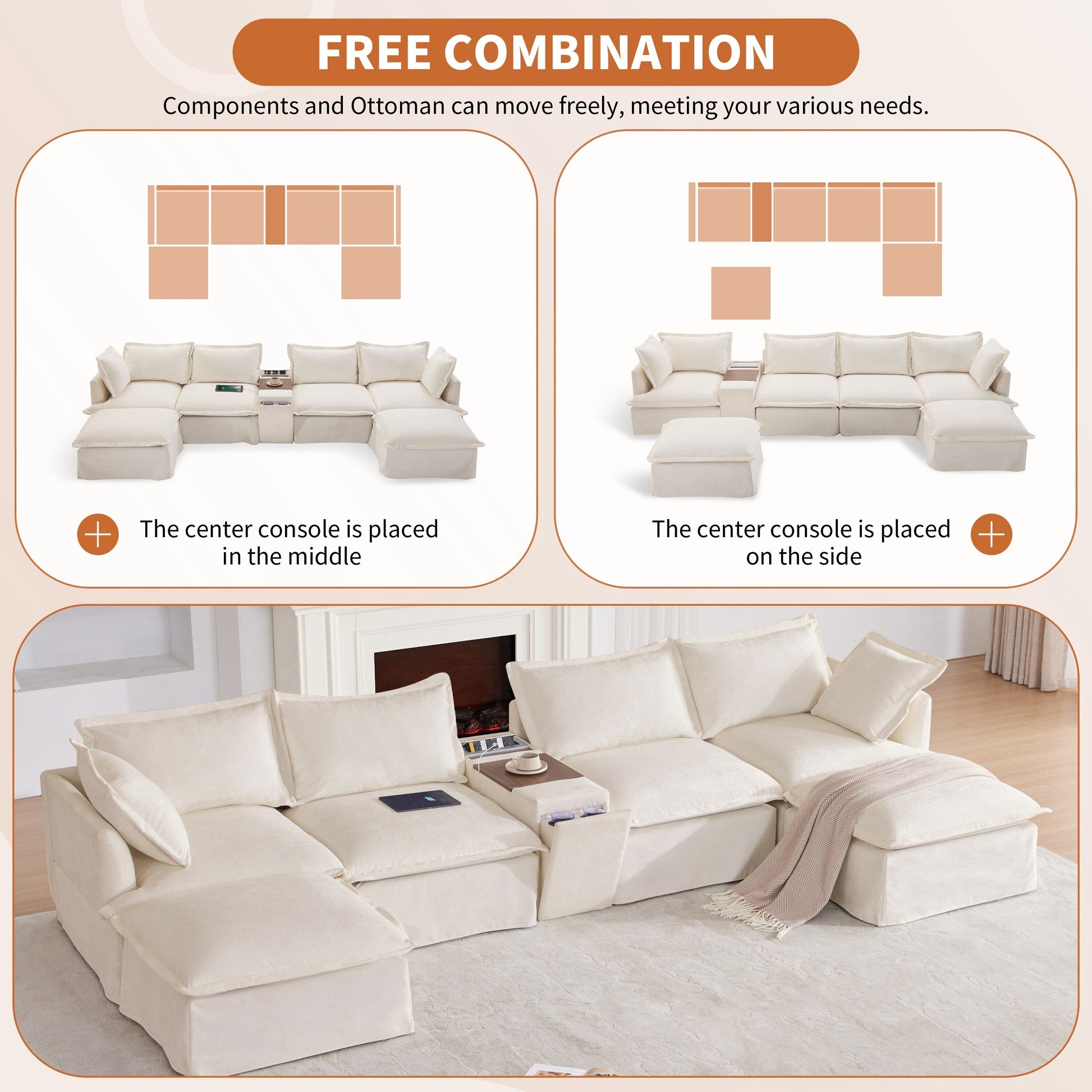Divano componibile a U Roomfitters con pouf, consolle e portabicchieri, divano in ciniglia a 6 posti con caricabatterie USB
