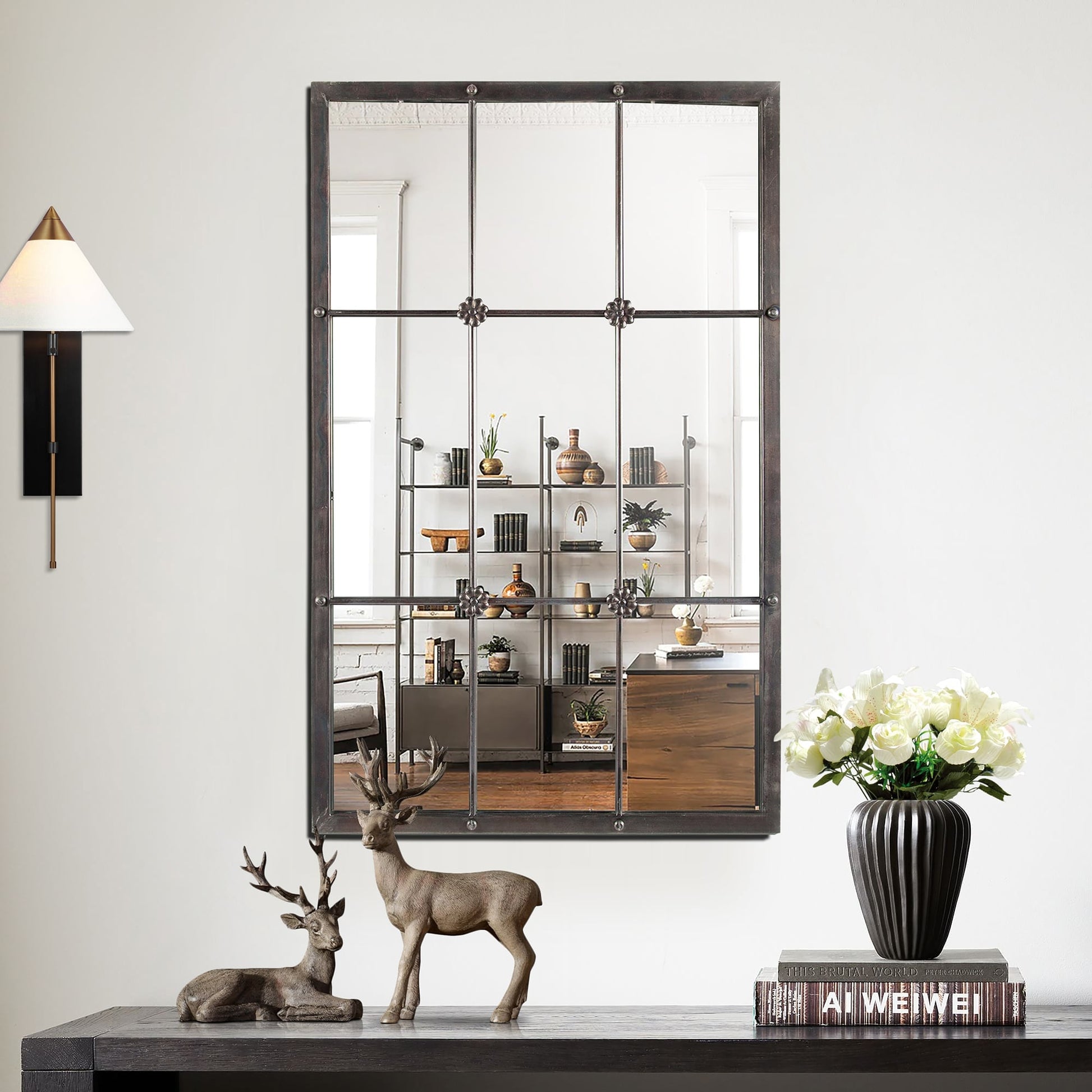 Stanco delle pareti noiose? Questo classico specchio da parete con finestra porterà immediatamente luce nella tua casa e creerà l'illusione di spazio. Questo specchio da parete rettangolare con finestra presenta un unico pezzo di specchio dietro nove sezioni di vetro ed è pronto per essere appeso con gli accessori inclusi. Lo specchio da parete è pronto per essere montato su qualsiasi superficie piana con le linguette metalliche fissate sul retro della cornice. Lo specchio può essere appeso orizzontalmente o verticalmente a tuo piacimento. La cornice è in metallo con uno specchio monoblocco diviso in sezioni per sembrare una finestra. Illumina la tua casa con questo splendido specchio da parete con finestra. Lo specchio ha una cornice in metallo con una finitura marrone rustico. Le sezioni sono decorate con un fiore in metallo al centro. Lo specchio da parete sarà un meraviglioso punto focale per il tuo ingresso, soggiorno, corridoio o camera da letto.