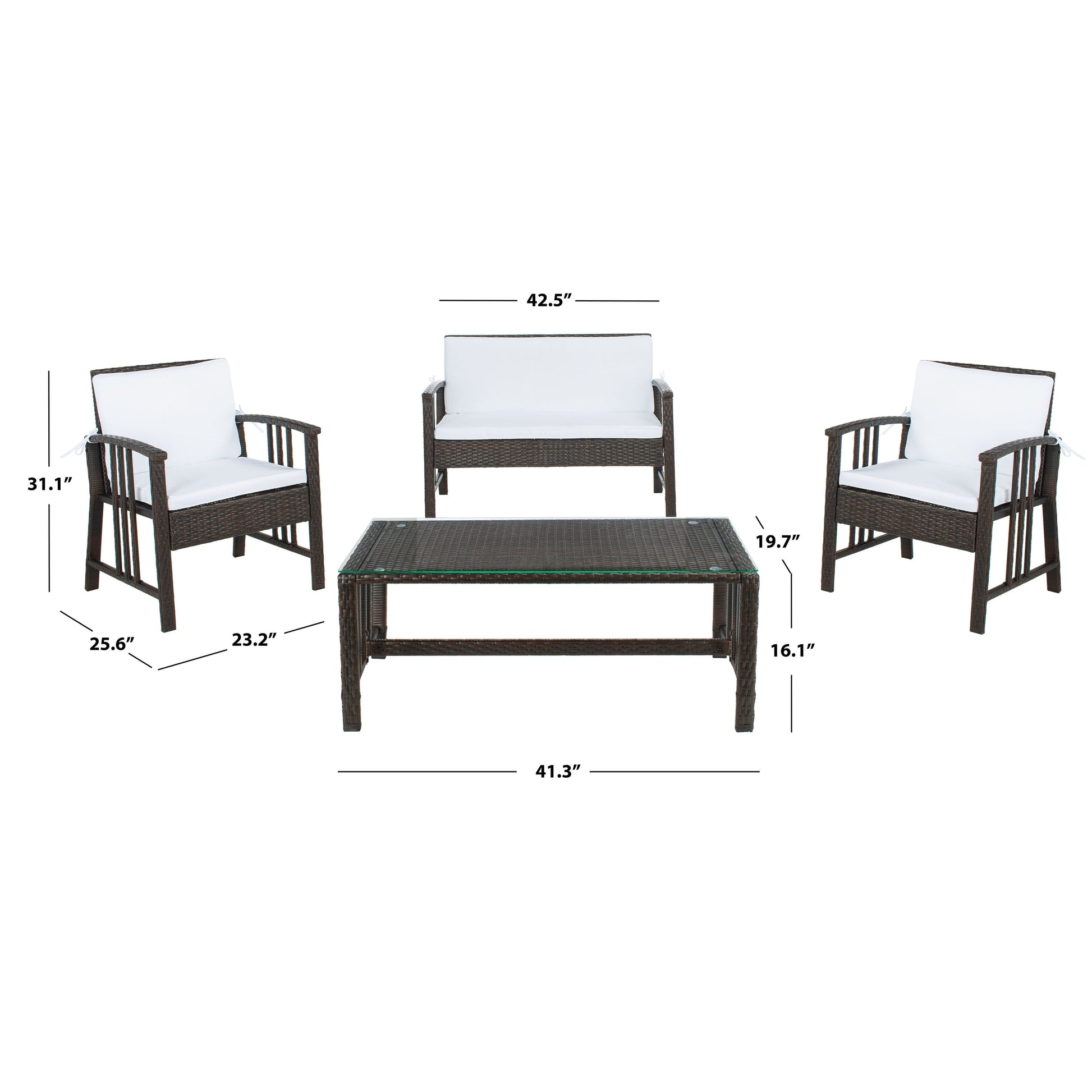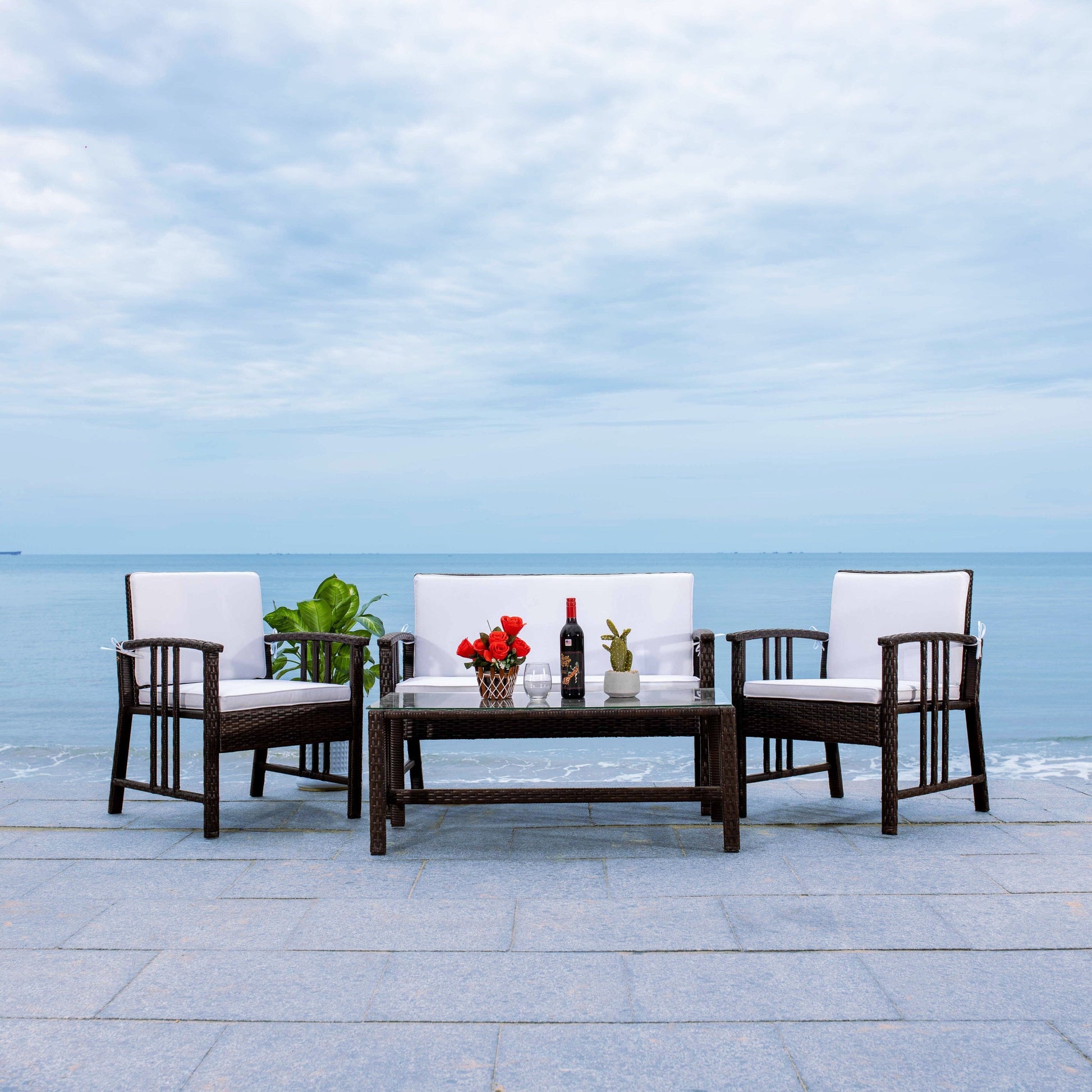 Porta il relax di una brezza marina nella tua oasi privata all'aperto con questo set da soggiorno composto da 4 pezzi. Le strutture in vimini intrecciato emanano una fresca atmosfera costiera, abbinandosi splendidamente a morbidi cuscini bianchi per lunghe ore di sole. Include due poltrone, un divano a due posti e un tavolino da caffè con piano in vetro.