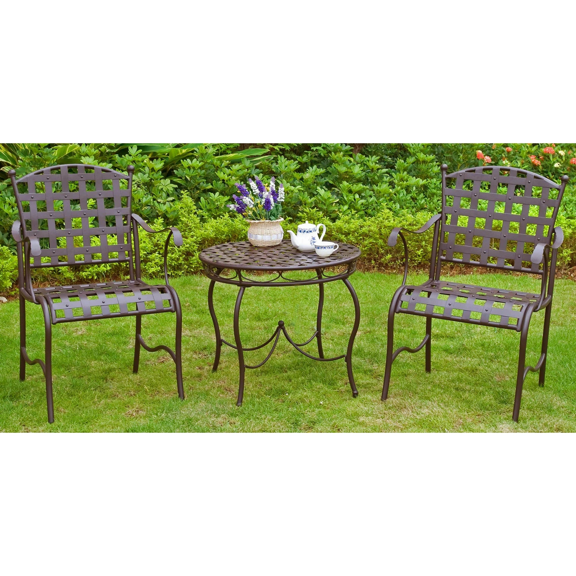 Rilassatevi in ​​terrazza con questo set di due sedie e un tavolo di International Caravan. Il colore marrone e il design intrecciato si adattano ad ambienti neutri e terrosi, trasmettendo al contempo un'atmosfera moderna. La struttura in acciaio del set garantisce una lunga durata e resistenza agli agenti atmosferici.