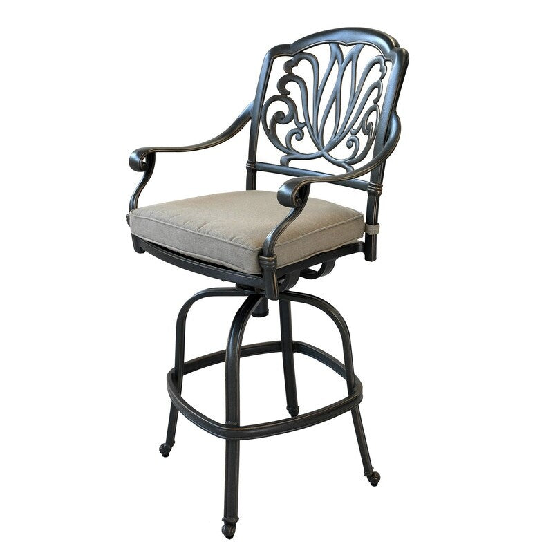 L'elegante sensibilità dell'architettura del quartiere francese si concretizza ora in questo prodotto, una solida collezione in alluminio pressofuso dalla presenza notevole. Un livello eccezionale di artigianalità si riflette nel crescendo di volute che scorrono dai braccioli curvi agli schienali delle sedie, e nelle gambe con goffratura acanto che sostengono i piani dei tavoli in fusione con eleganti decorazioni a sbalzo. Il set comprende 4 sgabelli da bar girevoli con cuscini e 1 tavolo da bar rotondo. Sunbrella è disponibile nell'opzione 'Sunbrella Spectrum Sand'.
