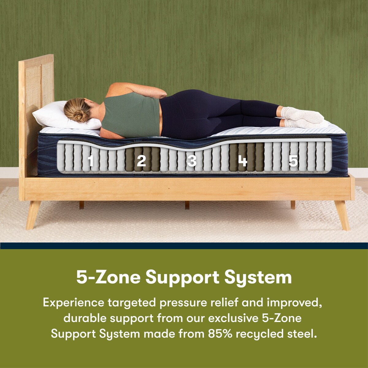 Con maggiore comfort, supporto e sostenibilità, il materasso ibrido trapuntato iComfortECO offre un sonno migliore e più rispettoso dell'ambiente. Con materiali ecocompatibili come la fodera CoolTemp® Powered by Repreve®, una fodera traspirante e fresca al tatto, realizzata con l'equivalente di 120 bottiglie d'acqua* in plastica riciclata, e la Memory Foam Terra Fusion®, realizzata con il 28% di materiale di origine vegetale, che offre sollievo dalla pressione, comfort avvolgente e riduce il trasferimento del movimento per un sonno ininterrotto. Per un sollievo dalla pressione ancora più mirato e un supporto duraturo, tutti i modelli includono il nostro esclusivo sistema di supporto a 5 zone, realizzato all'85% in acciaio riciclato. Progettato con supporto da bordo a bordo, ideale per qualsiasi posizione di sonno, per un riposo confortevole per tutta la notte.