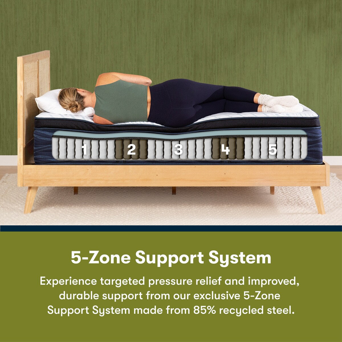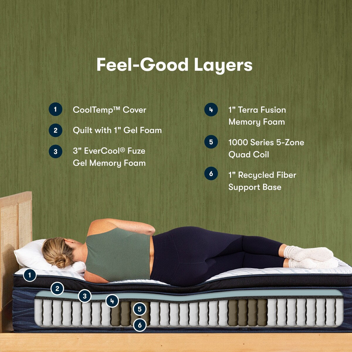 Con maggiore comfort, supporto e sostenibilità, il materasso ibrido trapuntato iComfortECO offre un sonno migliore e più rispettoso dell'ambiente. Con materiali ecocompatibili come la fodera CoolTemp® Powered by Repreve®, una fodera traspirante e fresca al tatto, realizzata con l'equivalente di 120 bottiglie d'acqua* in plastica riciclata, e la Memory Foam Terra Fusion®, realizzata con il 28% di materiale di origine vegetale, che offre sollievo dalla pressione, comfort avvolgente e riduce il trasferimento del movimento per un sonno ininterrotto. Per un sollievo dalla pressione ancora più mirato e un supporto duraturo, tutti i modelli includono il nostro esclusivo sistema di supporto a 5 zone, realizzato all'85% in acciaio riciclato. Progettato con supporto da bordo a bordo, ideale per qualsiasi posizione di sonno, per un riposo confortevole per tutta la notte.