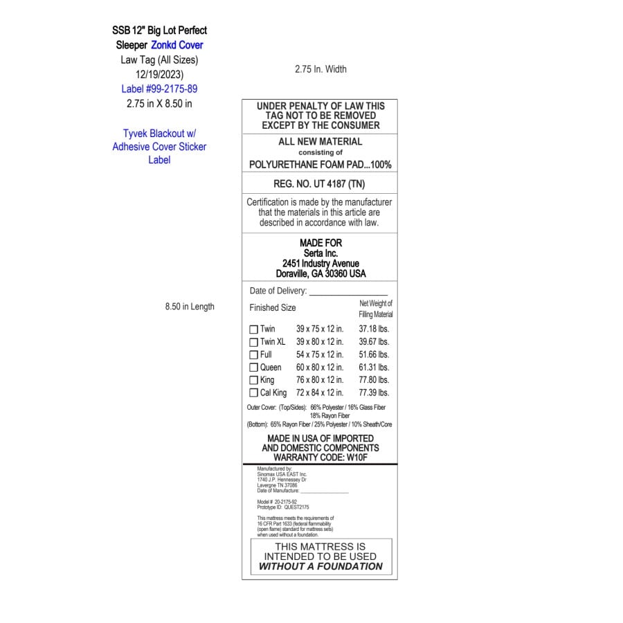 • Strato di base: 8' di nucleo in schiuma Serta ad alta densità, progettato per un supporto profondo e una durata duratura