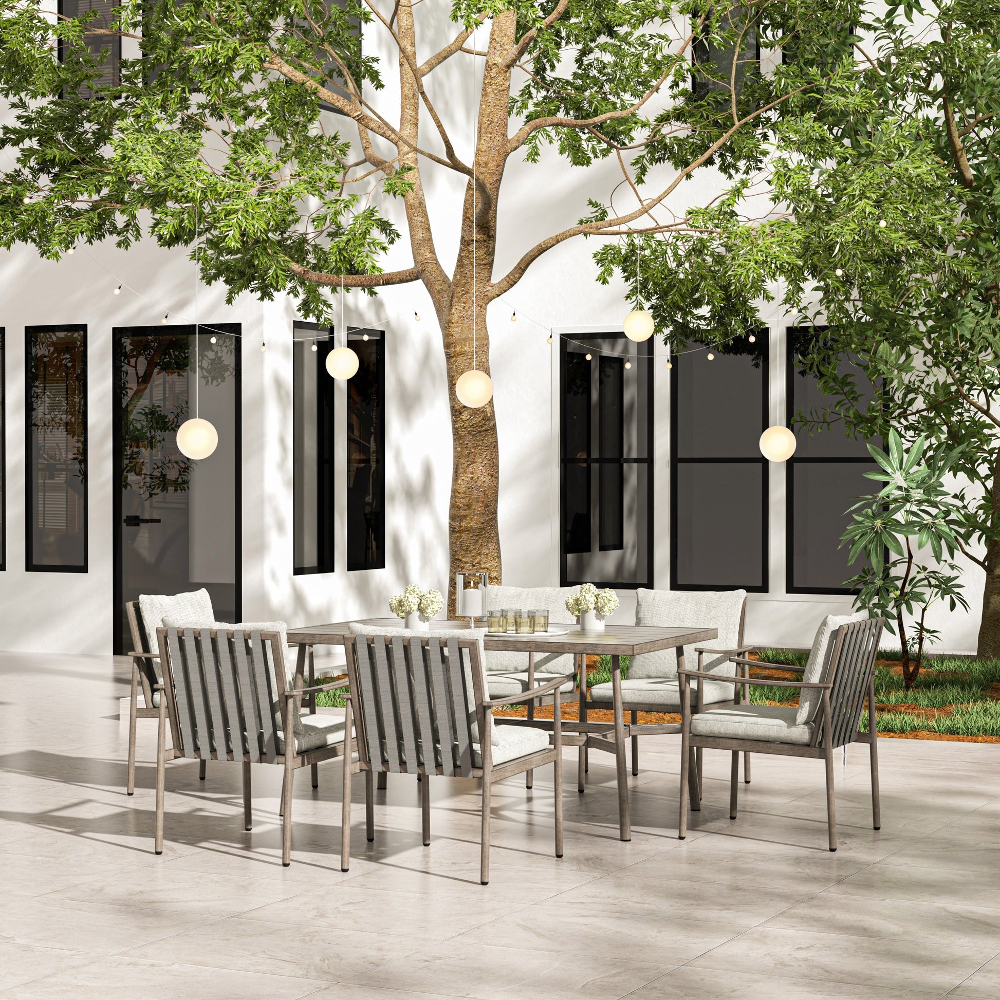 Questo set da pranzo per patio offre funzionalità per migliorare la vostra esperienza culinaria all'aperto. Che stiate organizzando una riunione di famiglia o gustando un pasto con gli amici, questo set offre ampie sedute e un tavolo spazioso per la vostra comodità. Realizzato con una struttura in alluminio di alta qualità, questo set combina comfort, resistenza e stile per un perfetto set da pranzo all'aperto. Godetevi pasti memorabili nell'abbraccio del lusso e della raffinatezza con il nostro set da pranzo per patio. Si prega di notare che, a causa dell'esclusivo processo di verniciatura a mano, potrebbero verificarsi lievi variazioni di colore in diverse condizioni di illuminazione. Abbiamo fatto ogni sforzo per rappresentare accuratamente i colori nelle immagini del prodotto, ma si prega di fare riferimento agli articoli reali che si ricevono per una rappresentazione accurata dei colori.