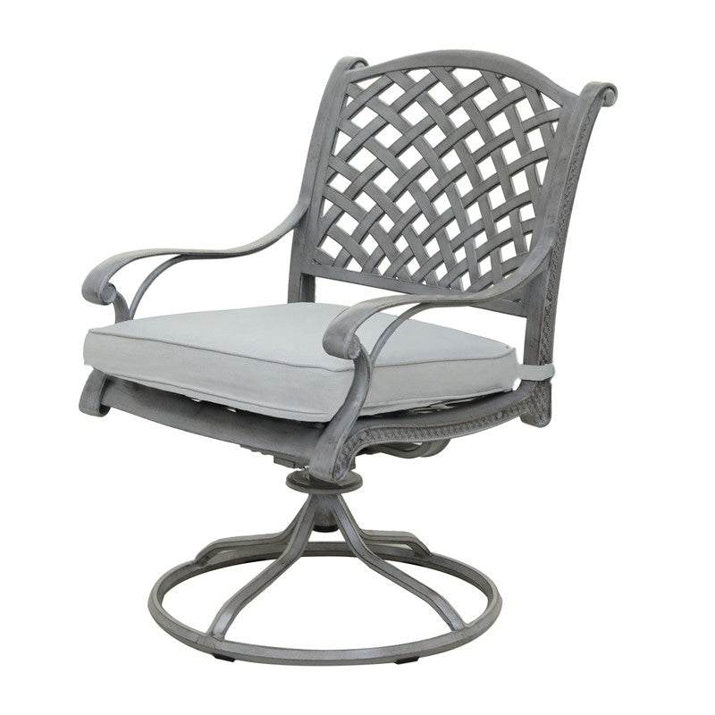 Gli esclusivi telai in alluminio verniciato a polvere sono progettati per resistere a tutte le condizioni atmosferiche. Offriamo un set da pranzo "da esterno" con 6 sedie girevoli imbottite e un tavolo da pranzo rettangolare, entrambi rivestiti in vernice a polvere continua. Il set è dotato di una seduta completamente imbottita, perfetta per uso esterno e interno. La schiuma utilizzata è di qualità commerciale per un comfort garantito. Il telaio è in alluminio, robusto e durevole, poiché tutti i materiali sono impermeabili.