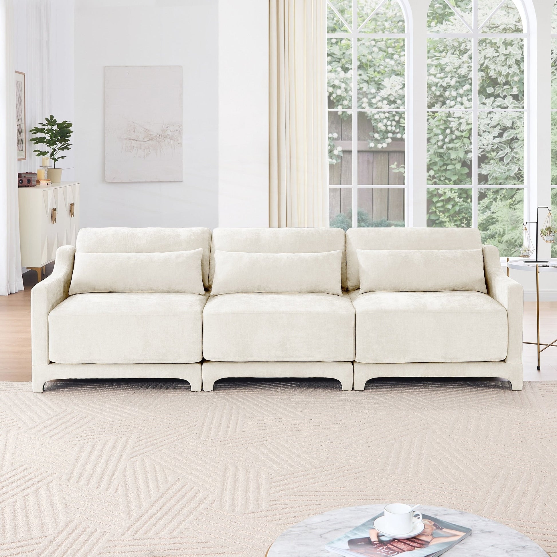 3. Materiali di alta qualità: rivestito in ciniglia di alta qualità, il divano offre un tocco morbido ed elegante con una texture unica, per una seduta di lusso adatta a tutto l'anno. Il tessuto resistente e resistente all'usura si abbina a cuscini in spugna completamente compressi e a una robusta struttura in legno, garantendo comfort e affidabilità duraturi.