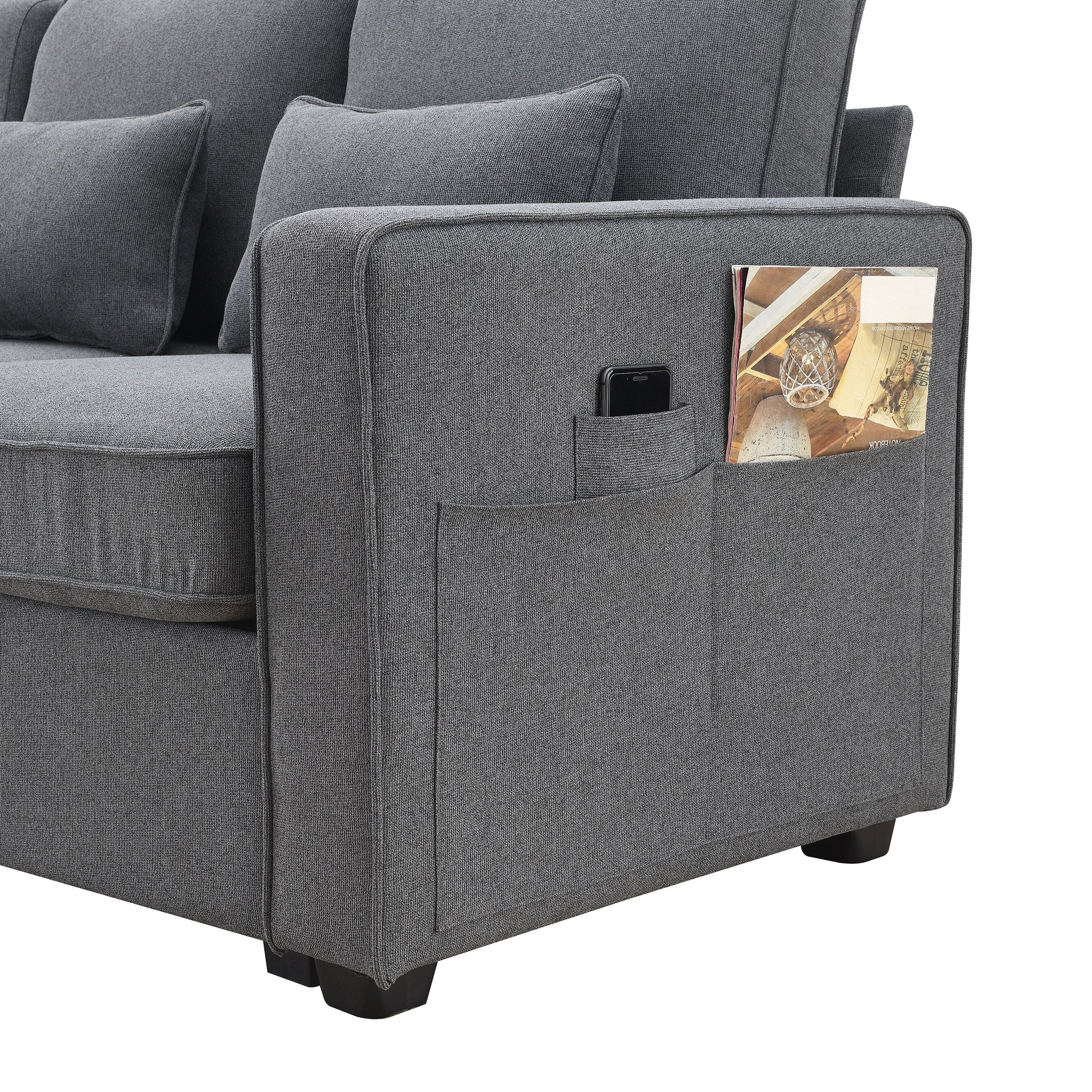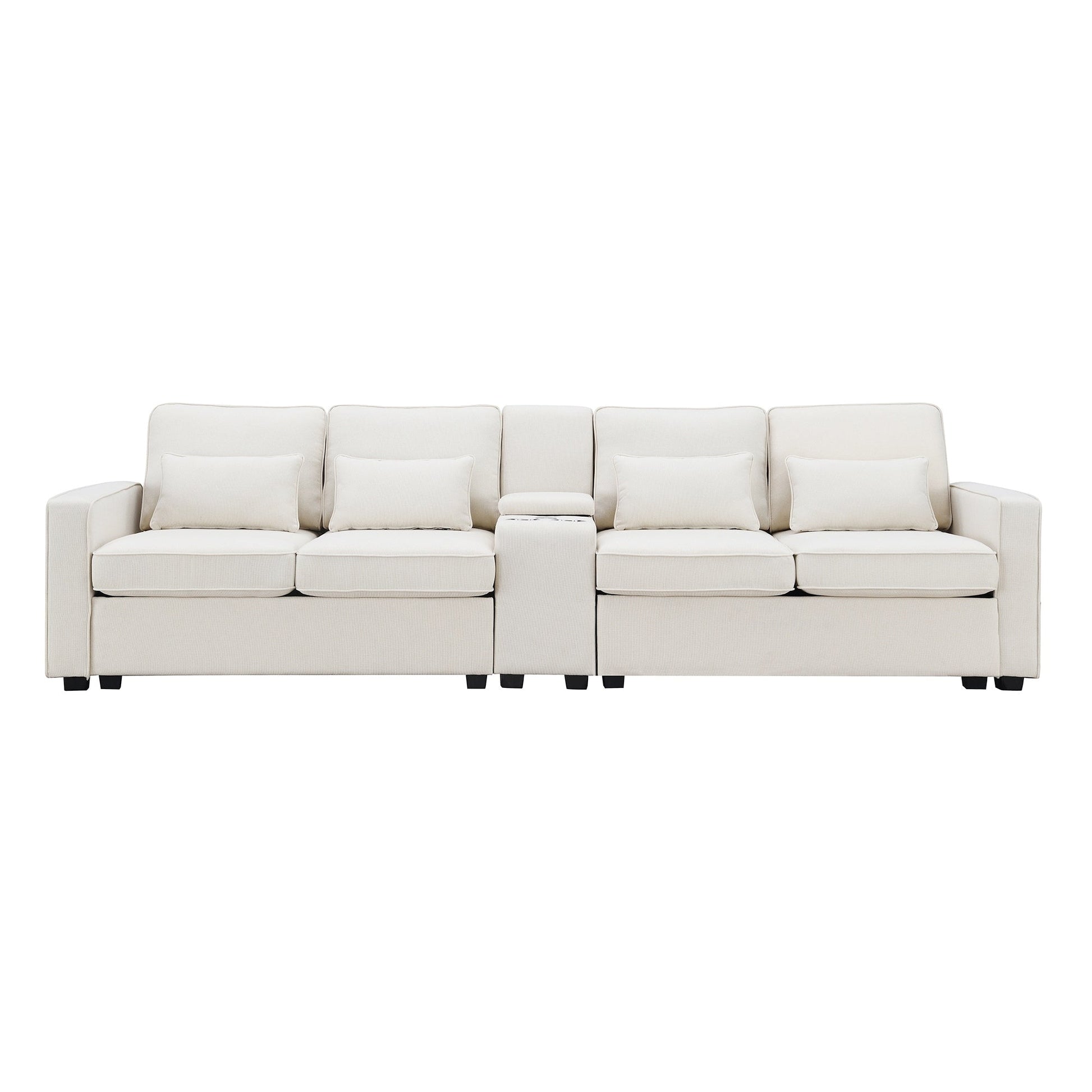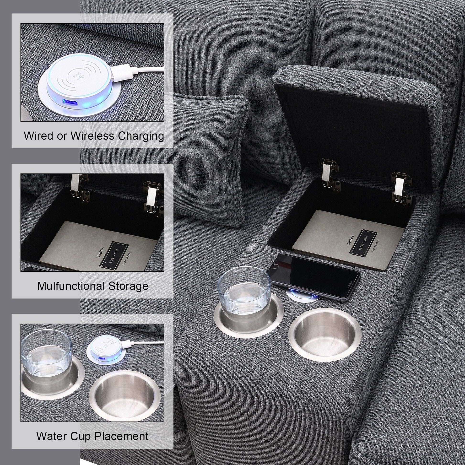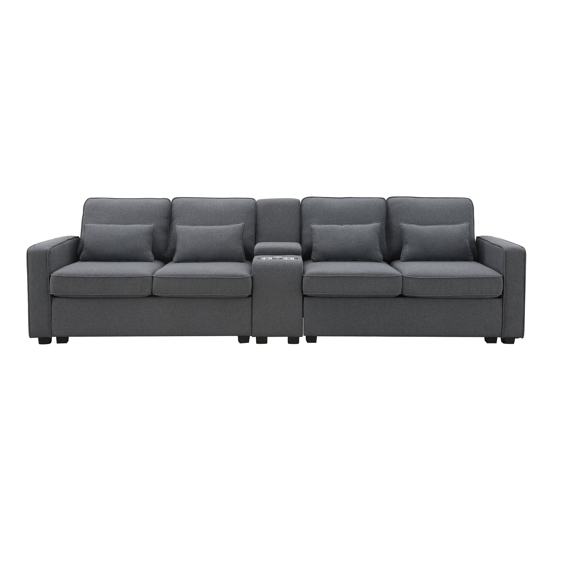 Divano imbottito con consolle, 2 portabicchieri e 2 porte USB con ricarica cablata o wireless, divani in tessuto di lino con 4 cuscini