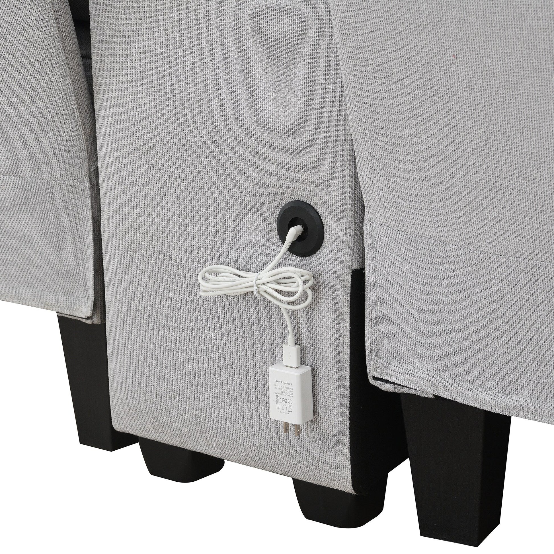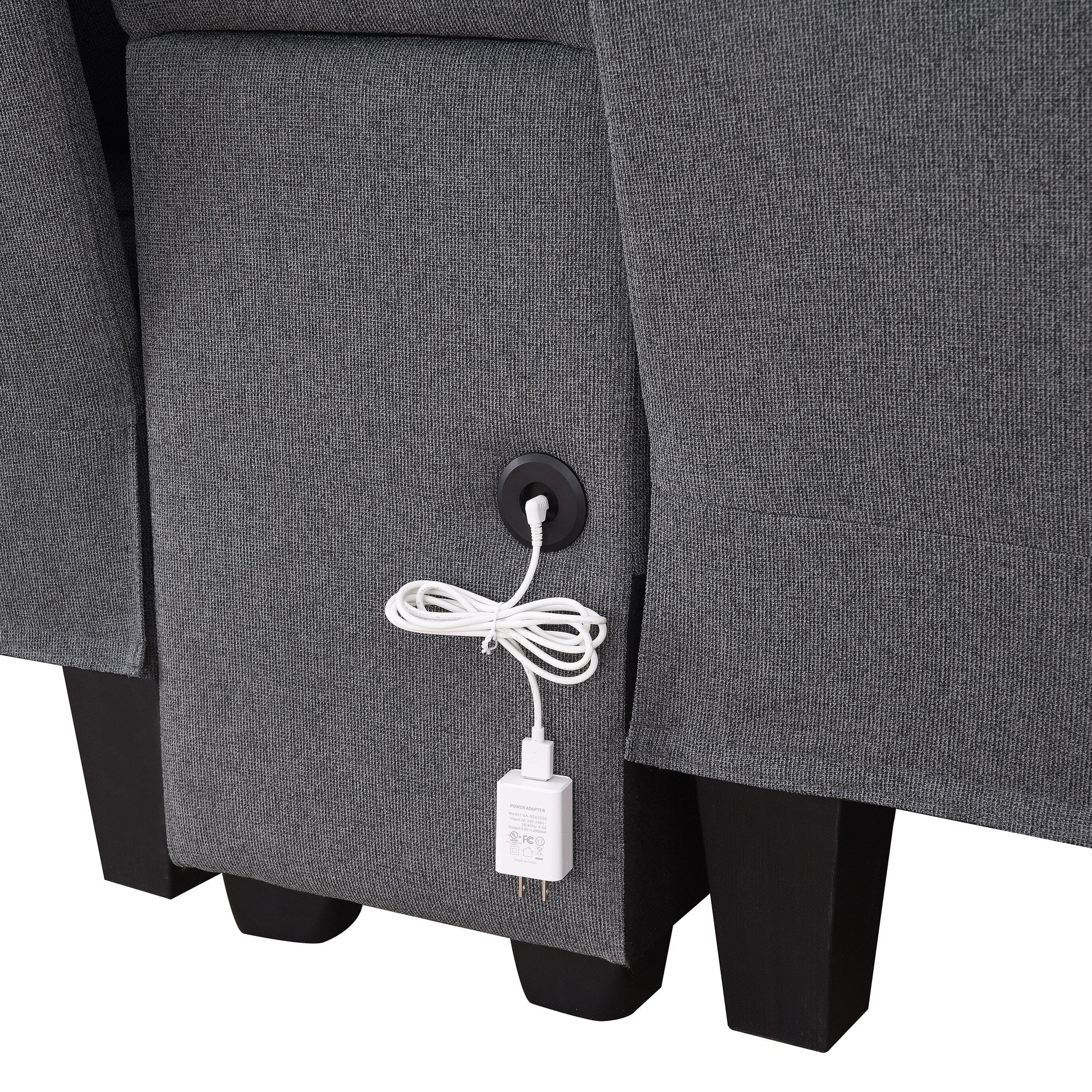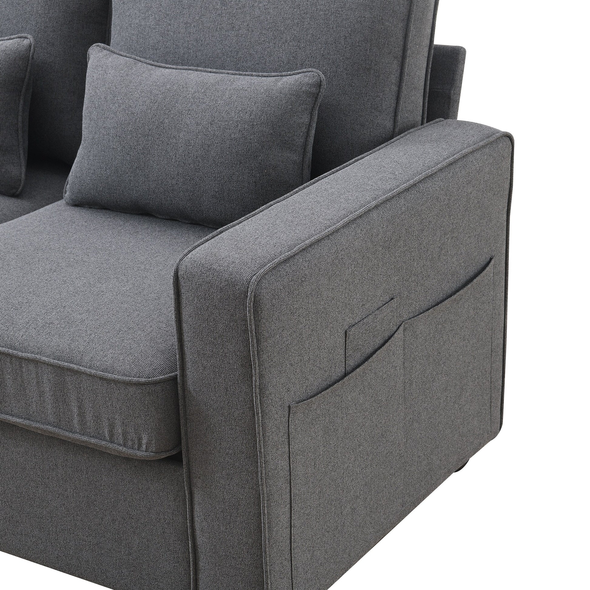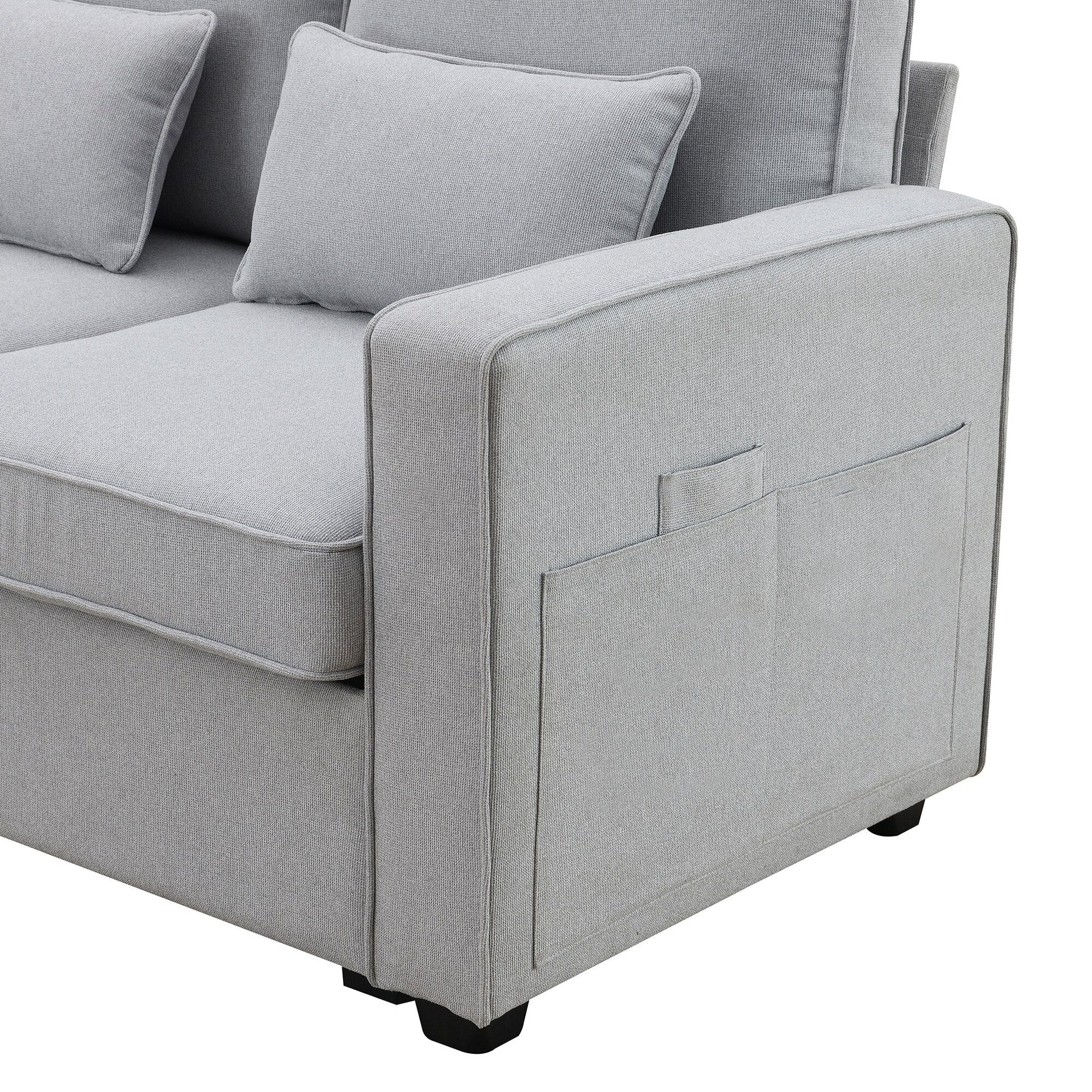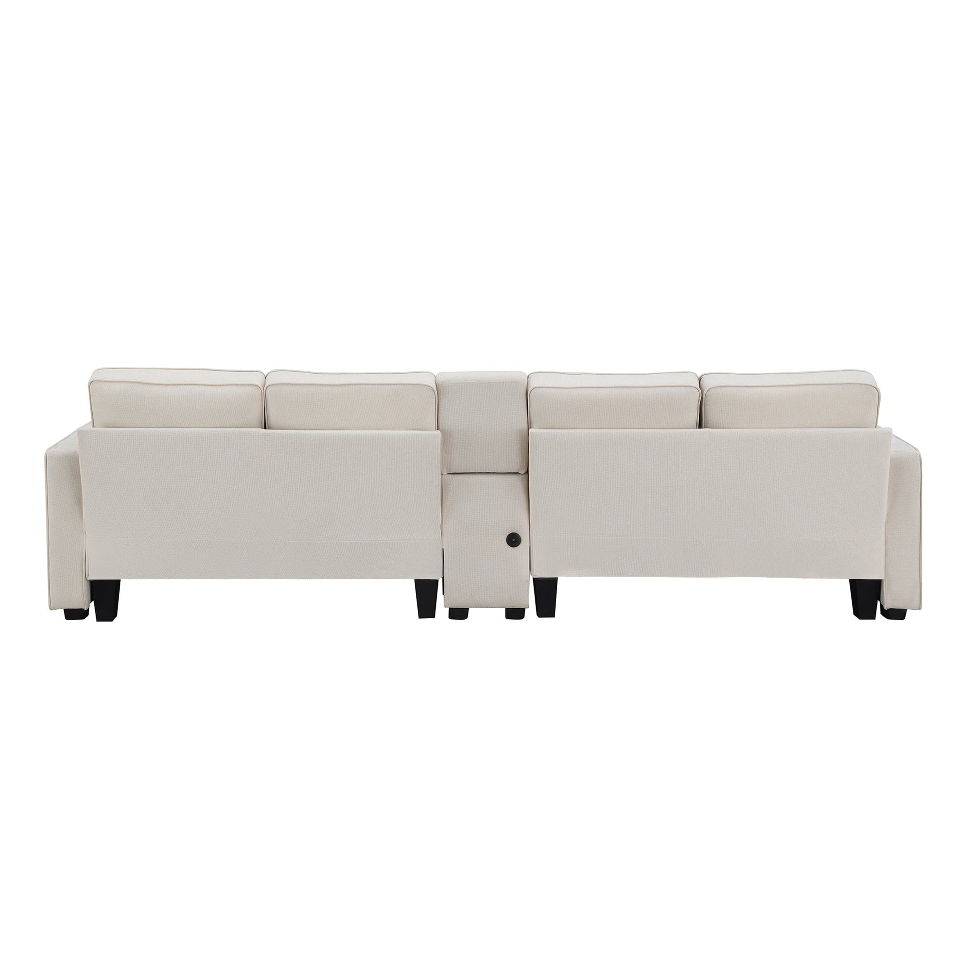 Divano imbottito con consolle, 2 portabicchieri e 2 porte USB con ricarica cablata o wireless, divani in tessuto di lino con 4 cuscini