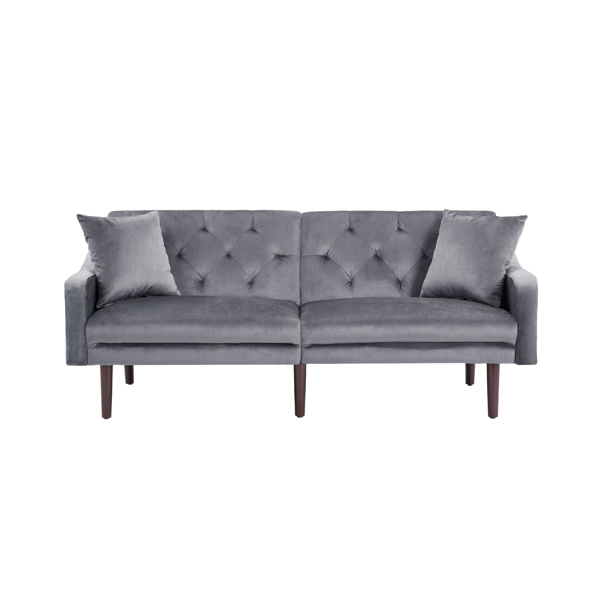 Divano letto a 3 posti in velluto con cuscini decorativi e struttura in legno