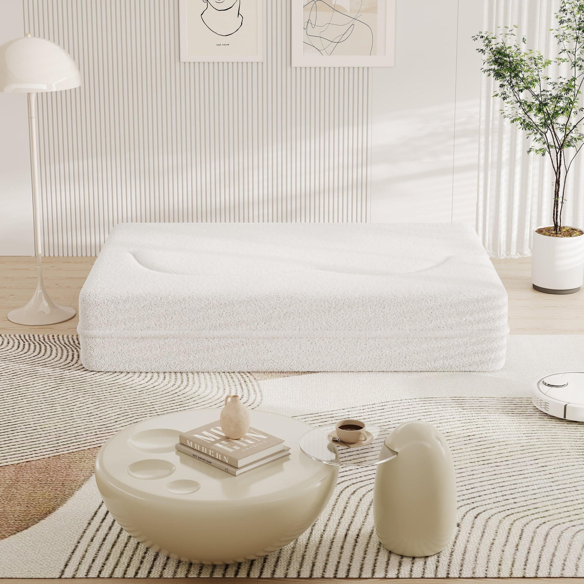 Divano letto trasformabile in tessuto Teddy bianco da 78 pollici, imbottito in schiuma, con 2 cuscini e materasso pieghevole per soggiorno