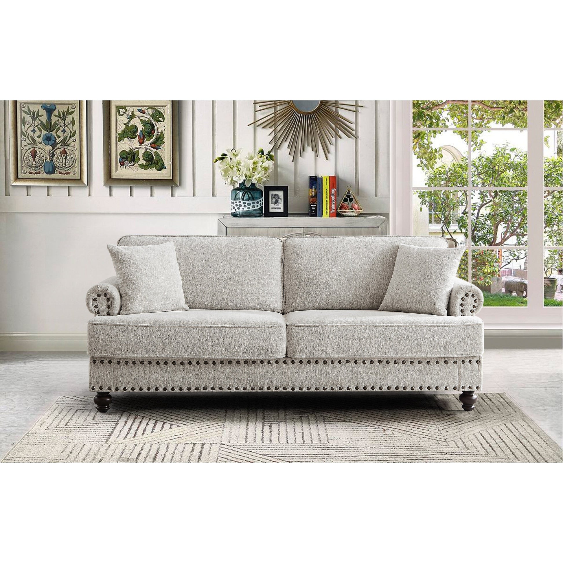 Divano moderno imbottito bianco da 82'' a 2 posti con finiture in borchie, cuscini decorativi e cuscini in spugna